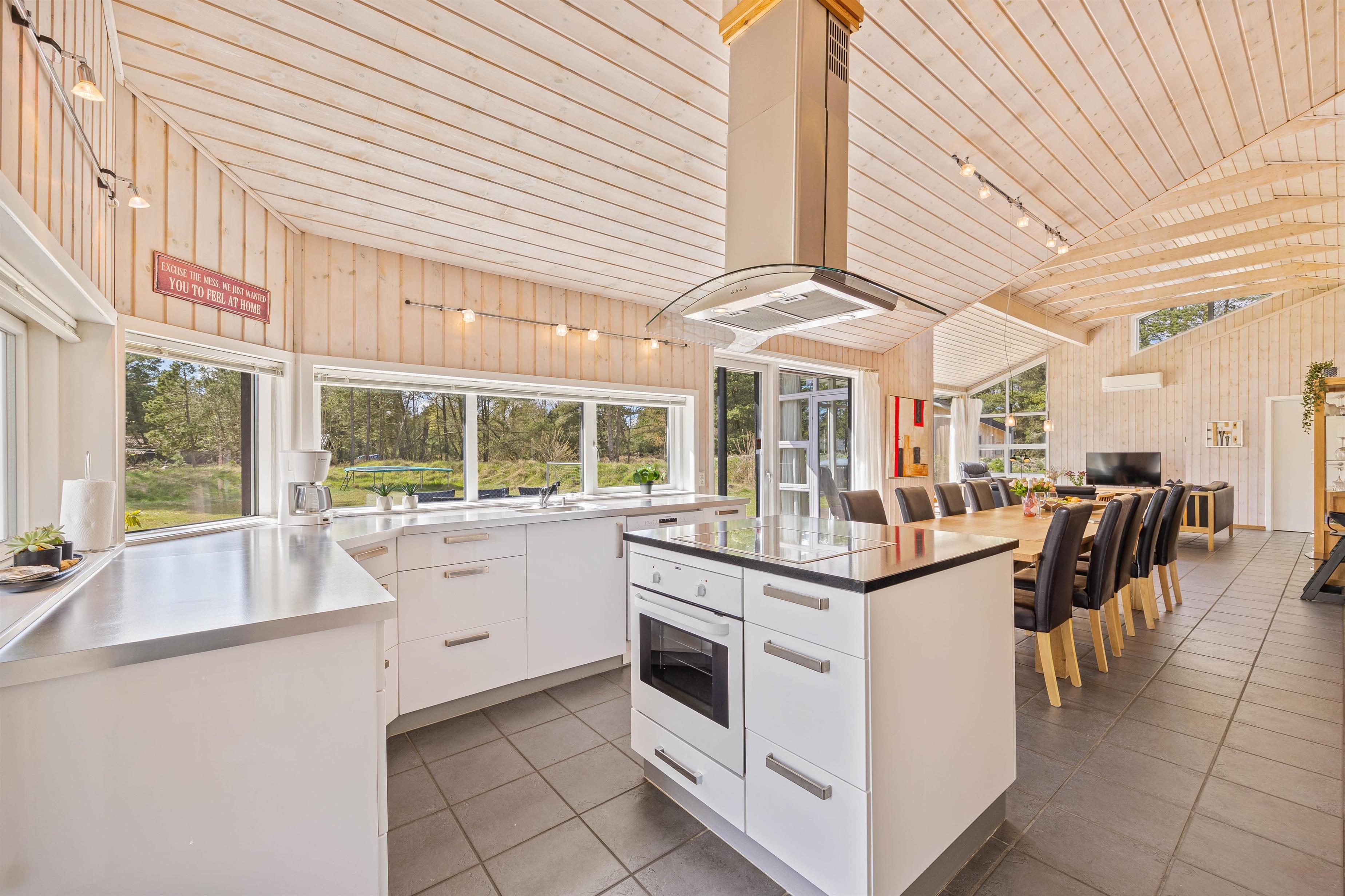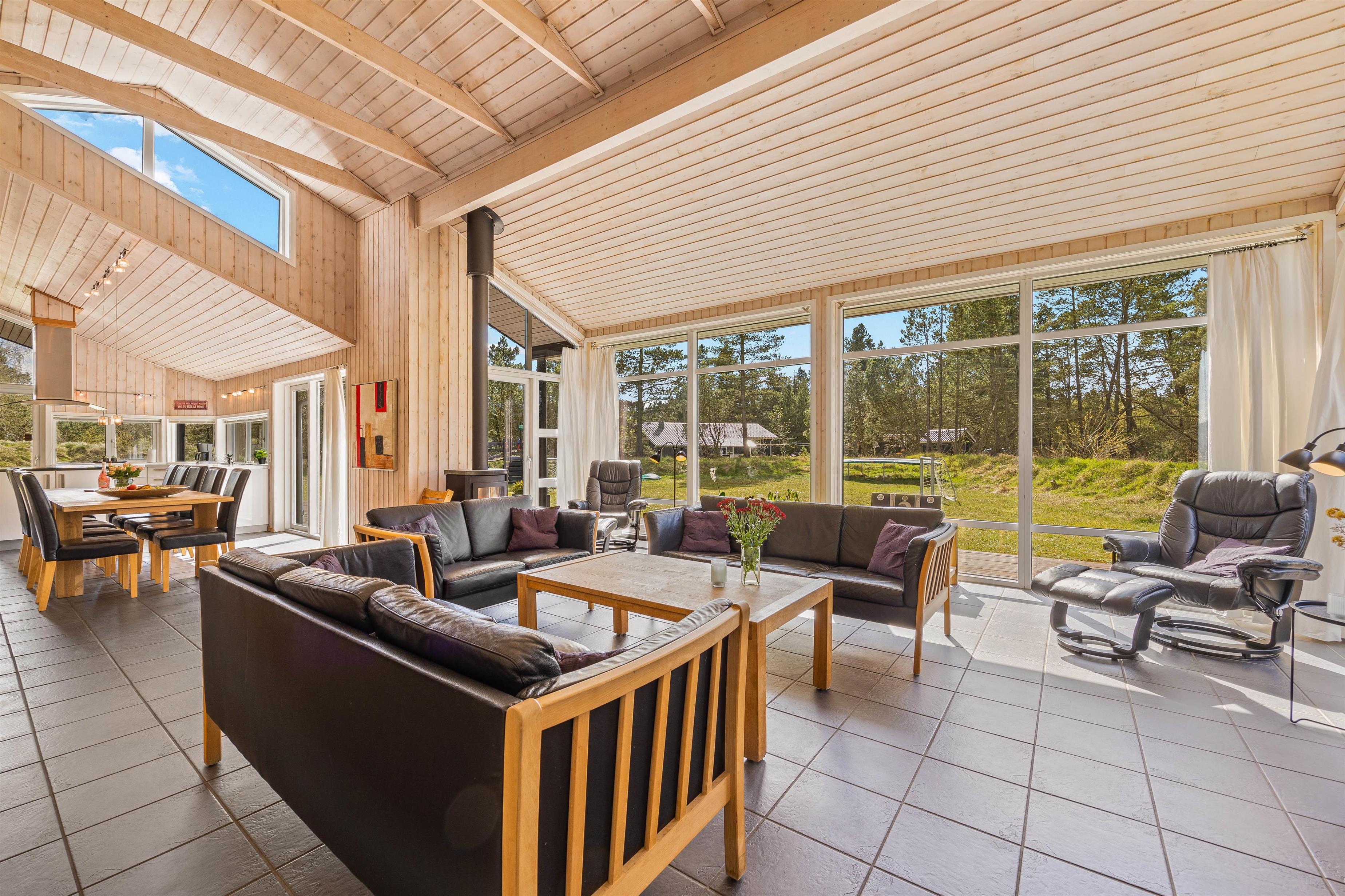 Sommerhuset er lyst og indbydende indrettet, og i alrummet er der et fantastisk lysindfald fra de store vinduespartier mod terrassen. I stuen er der en brændeovn, som ikke blot spreder varme, men også en ekstra hyggelig feriestemning. Måske I trænger til afslapning på sofaen og nyde en god film, som I kan streame via sommerhusets chromecast? Som et ekstra plus er der fjernsyn i alle værelser, så I kan se noget forskelligt.