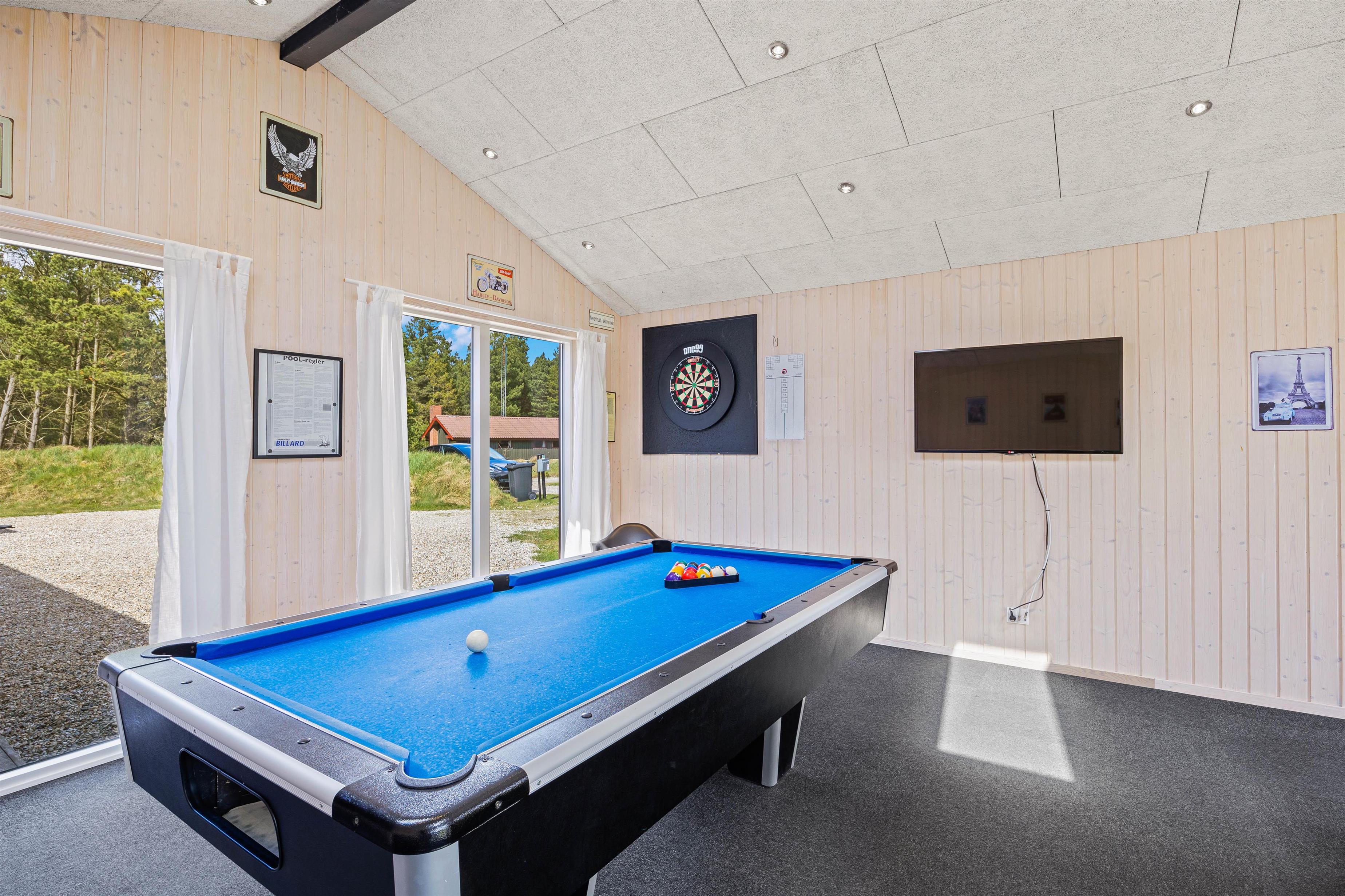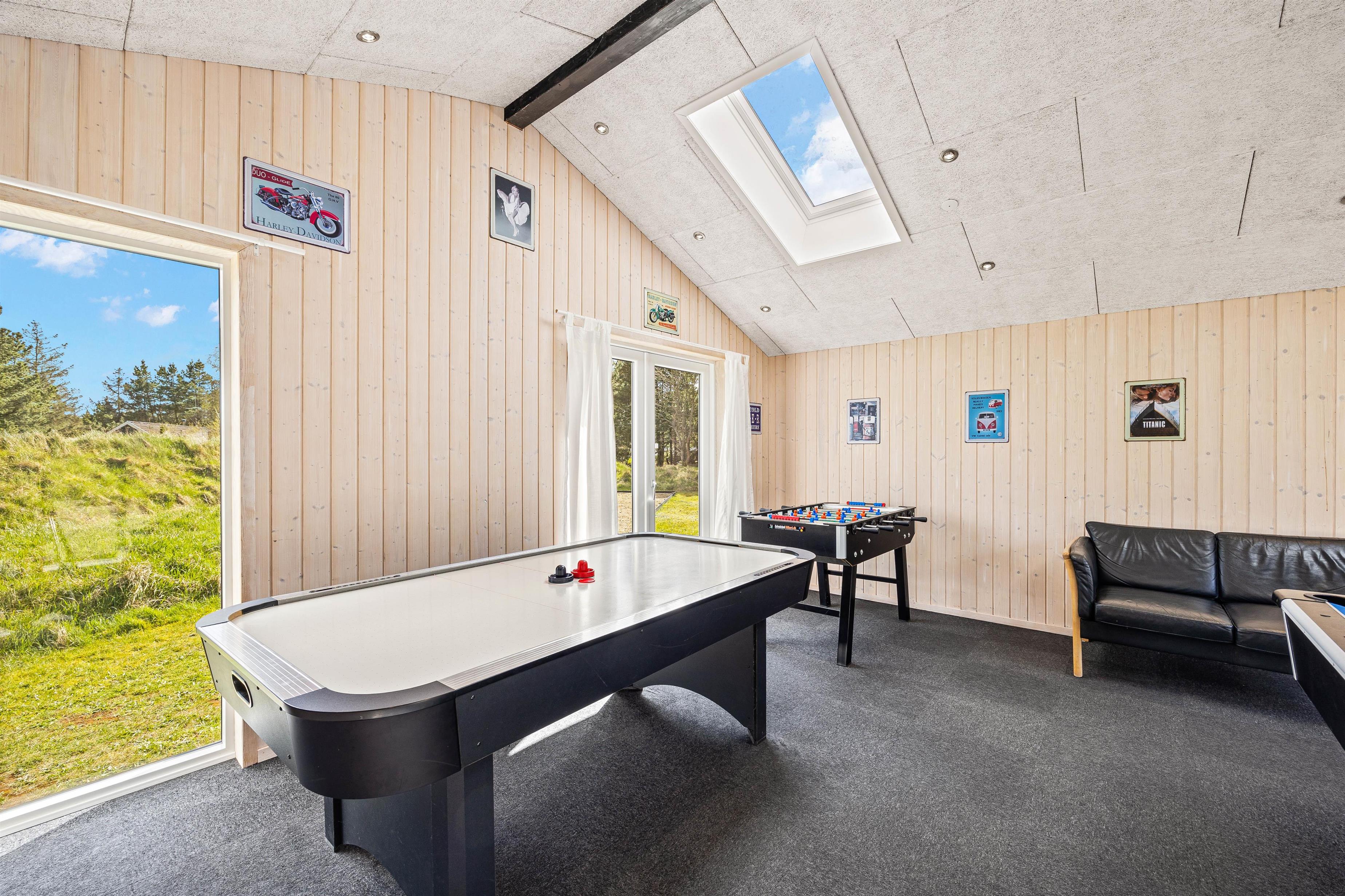 Et af sommerhusets samlingspunkter er det store aktivitetsrum, der byder på et bredt udvalg af sjove spil til hele familien. Her kan I både kaste jer ud i billard, air hockey, bordfodbold og dart. Hvad med at finde familiens spillemester i en sjov og spændende turnering?
