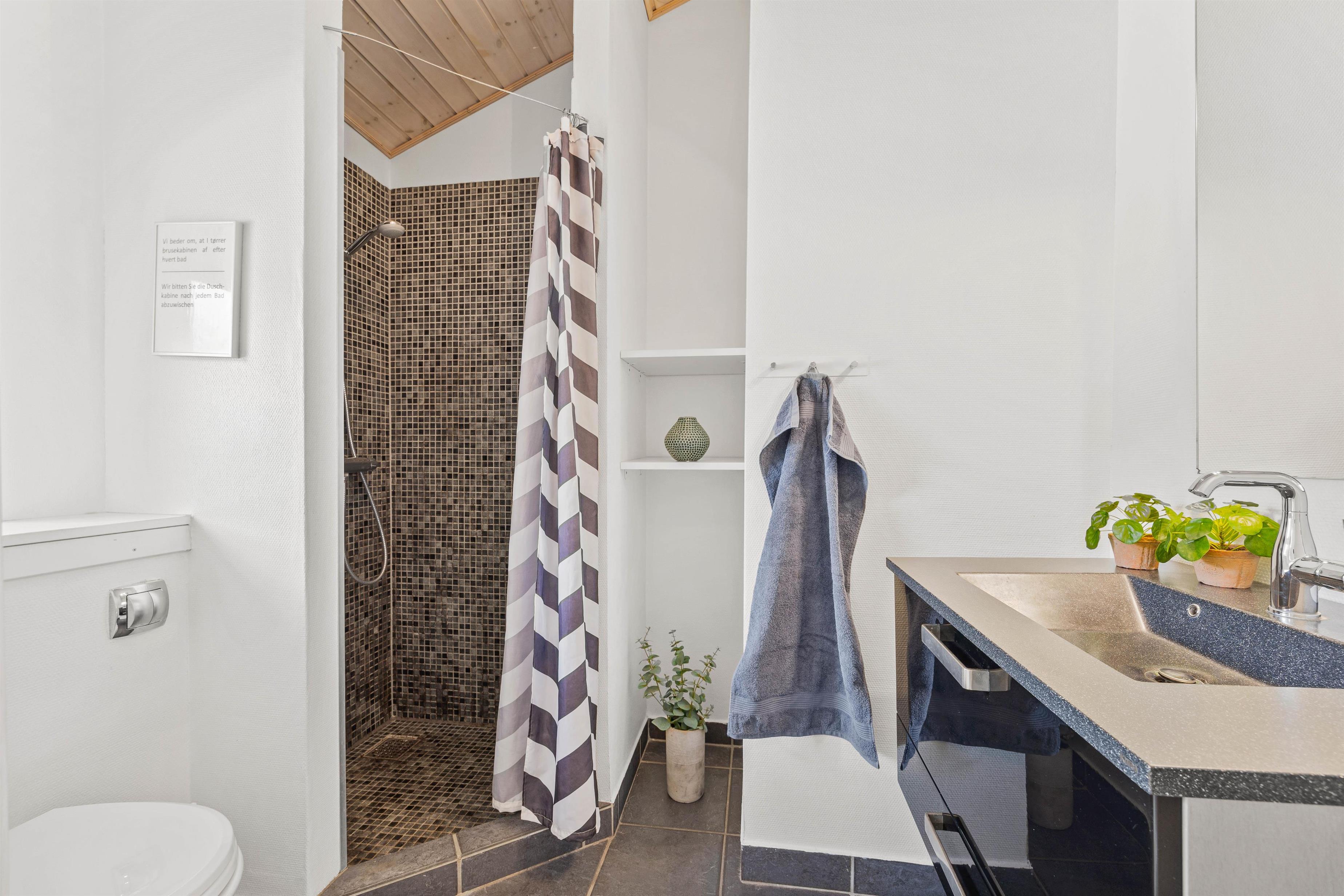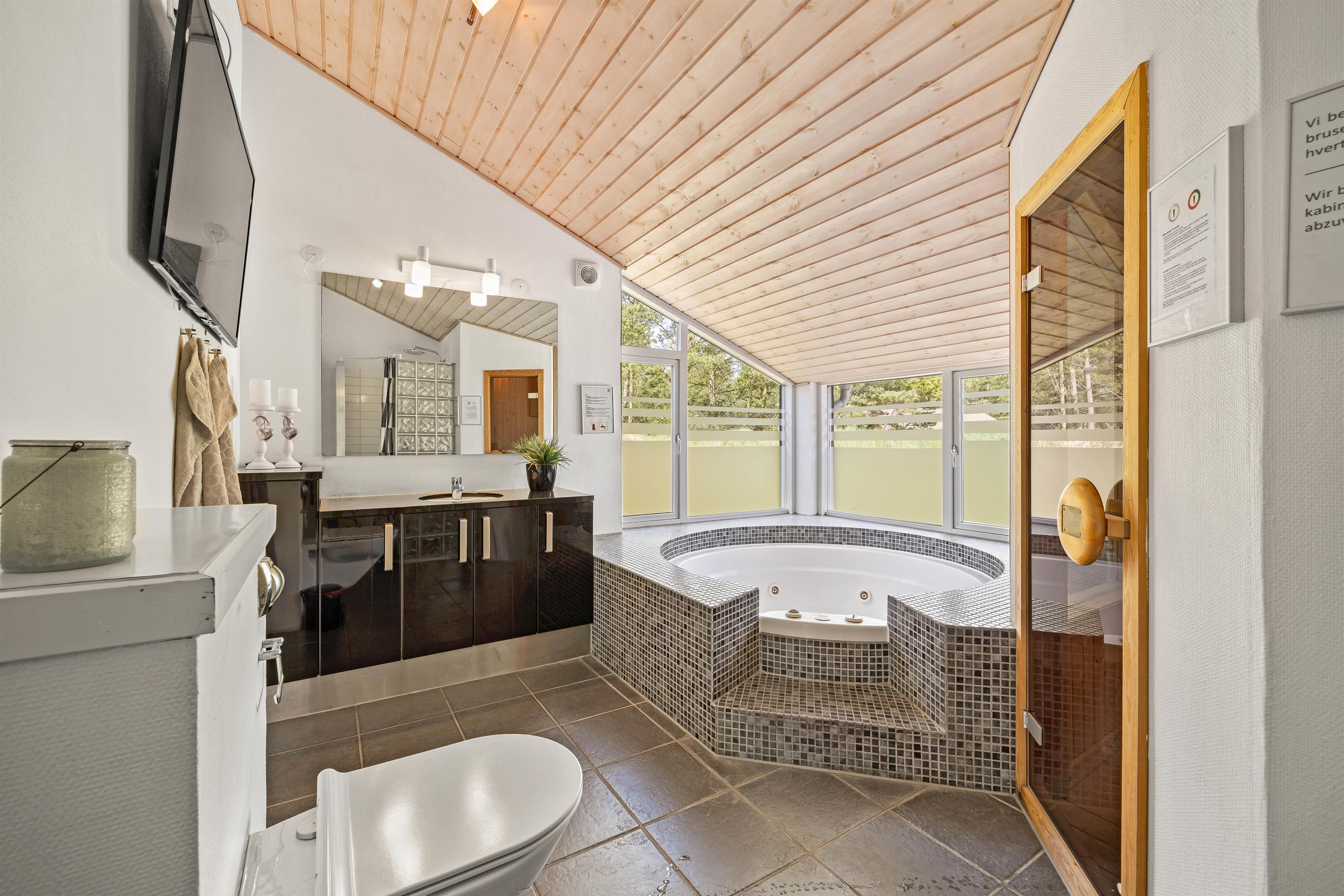 Feriehuset har 2 gode badeværelser med gulvvarme, hvoraf det ene er indrettet med spabad og sauna til afslapning og velvære. I sommerhuset er der desuden både vaskemaskine og tørretumbler, så I har mulighed for at vaske lidt tøj eller håndklæder, hvis det skulle blive nødvendigt.