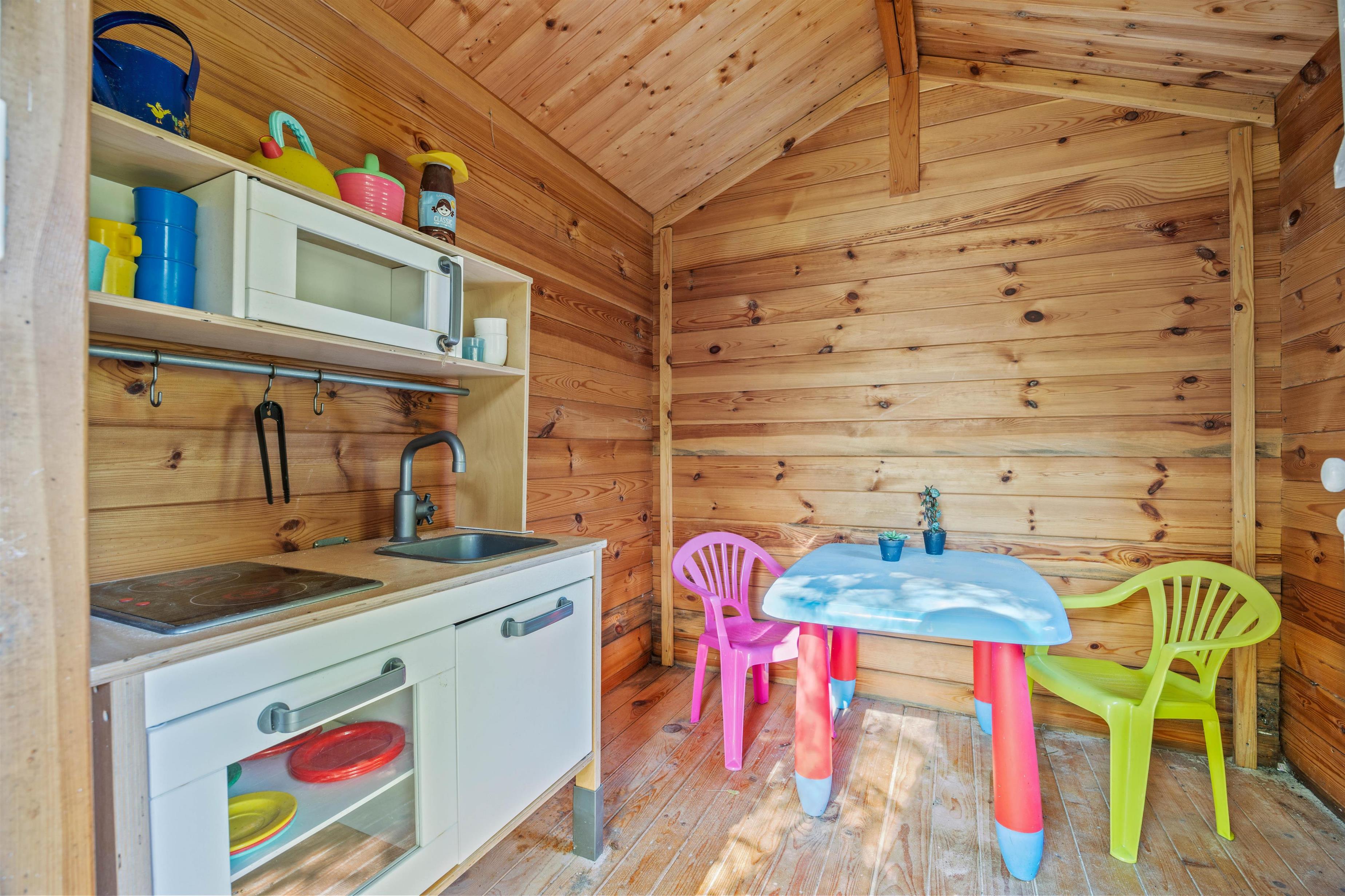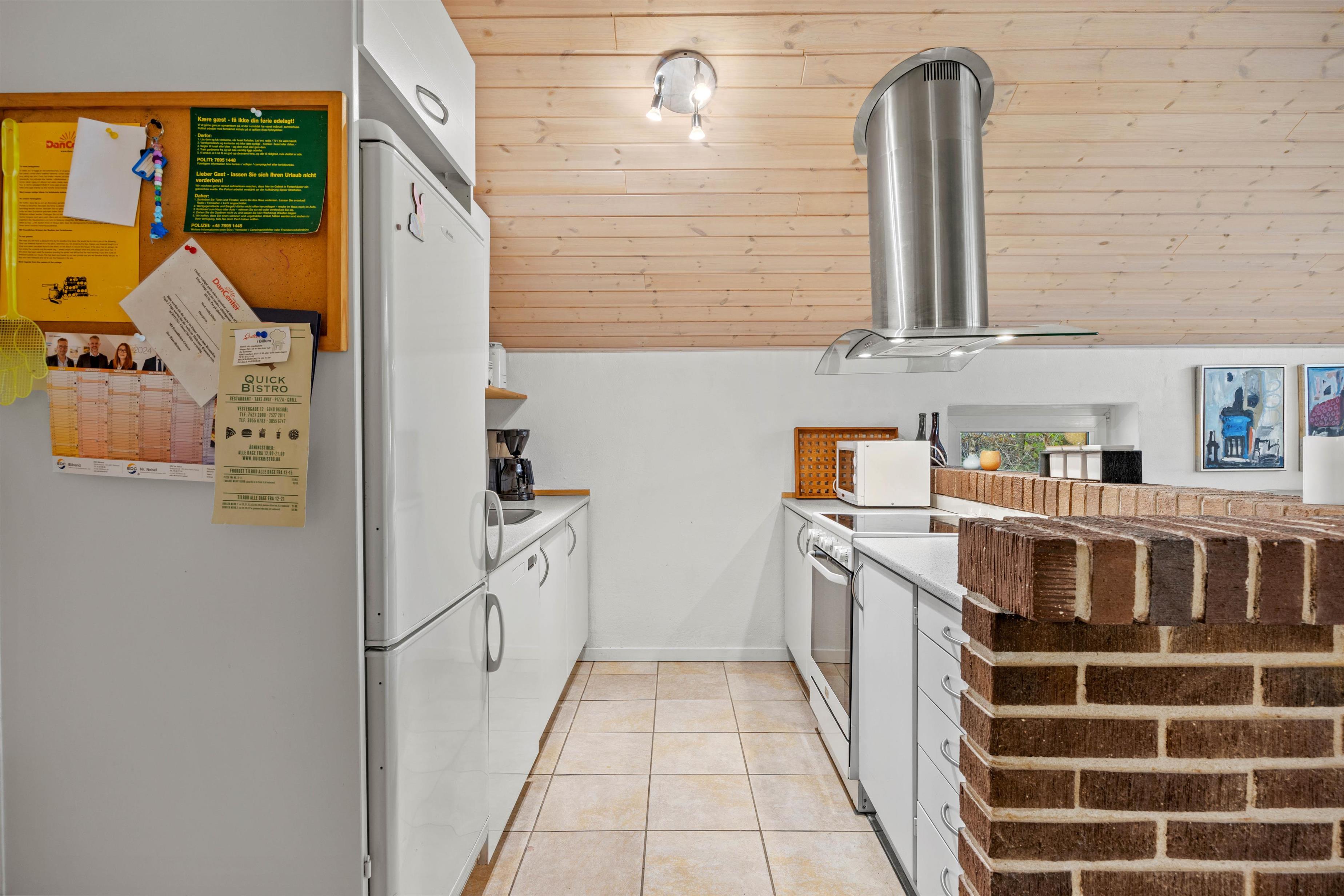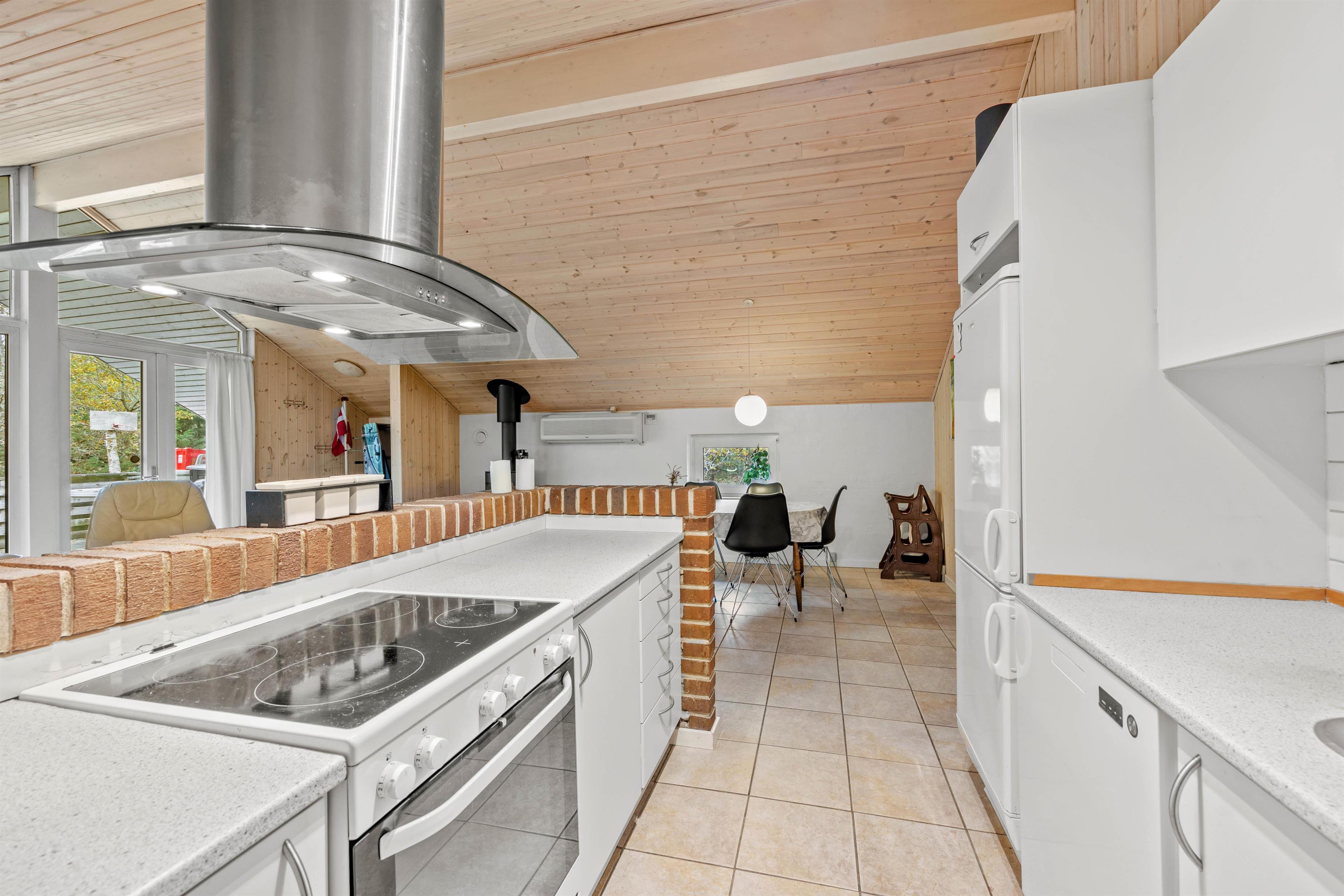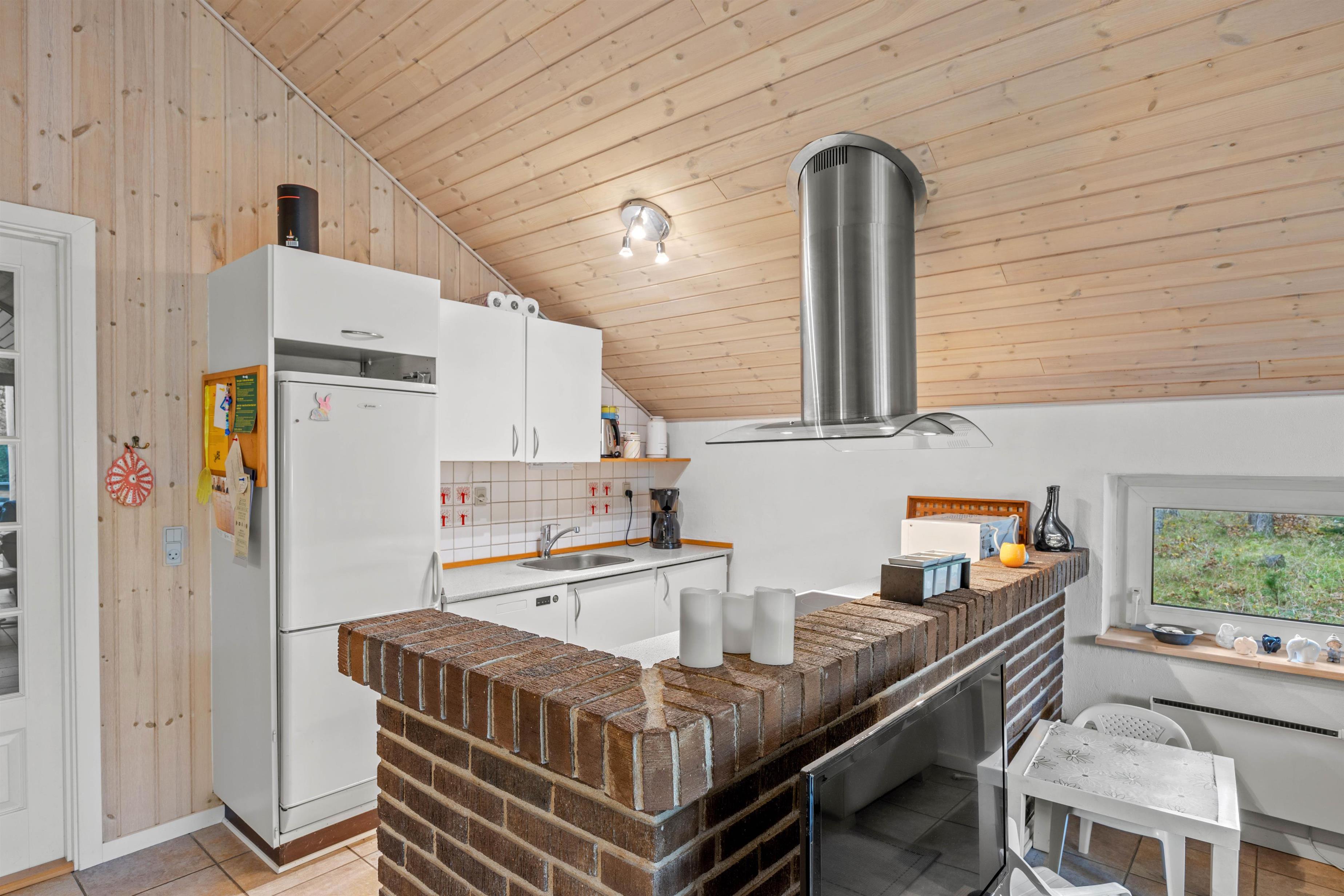 Det lille køkken er udstyret med en opvaskemaskine, som tager opvasken for dig, og en 70-liters fryser står også til rådighed for dig, hvis du gerne vil fryse en større mængde mad.