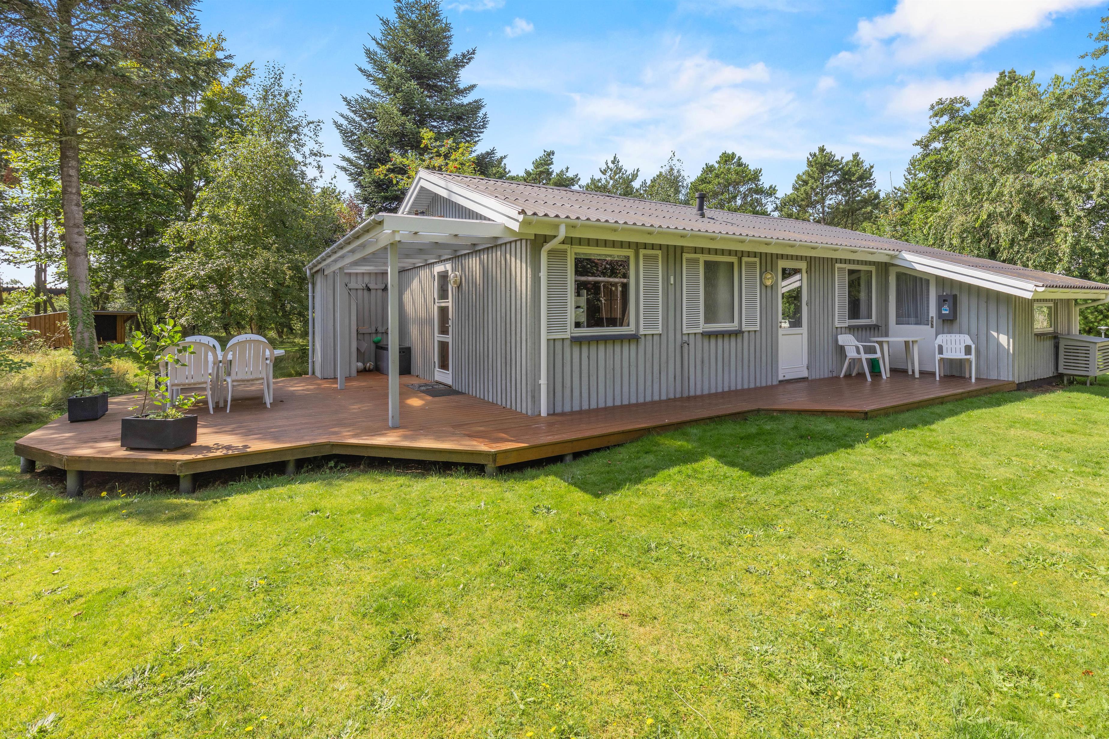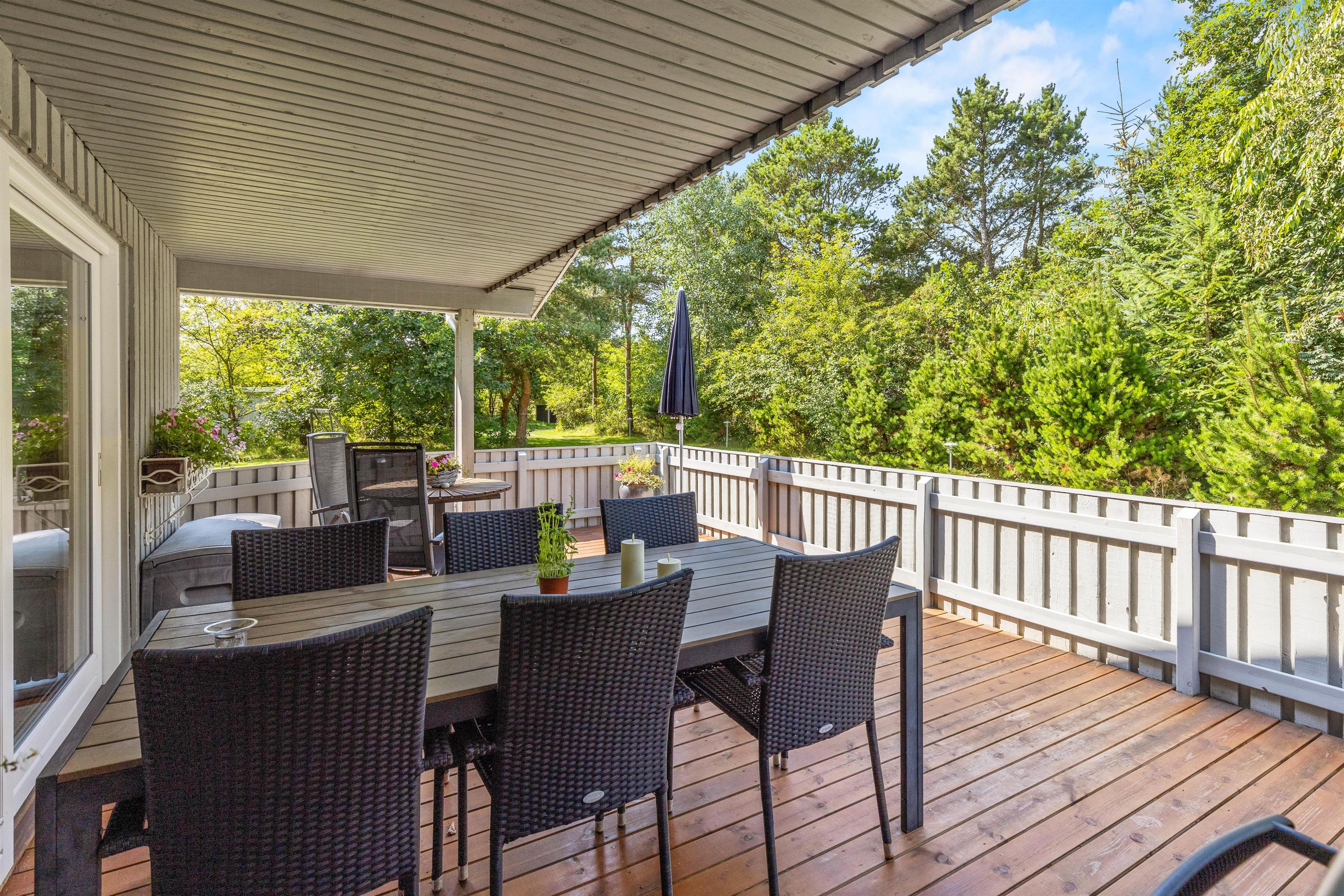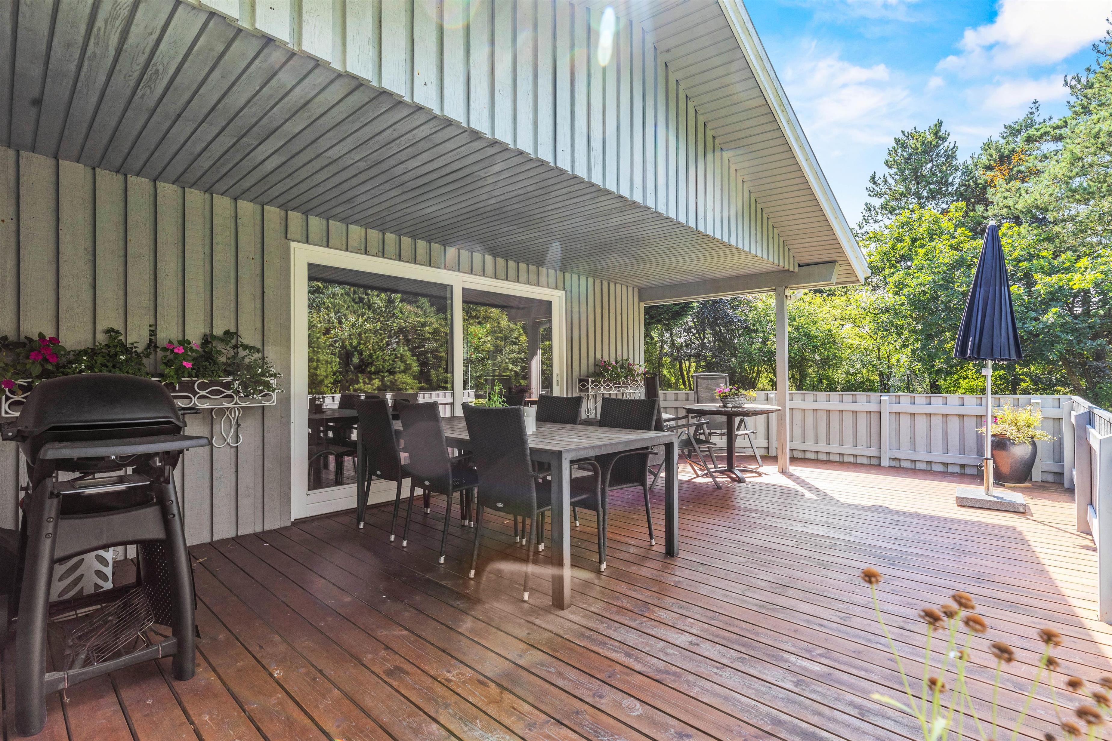 Sommerhuset er beliggende på en plænegrund på mere end 2.200 kvadratmeter, hvor I blandt andet kan slappe af i havemøbler og liggestole på den lukkede og delvist overdækkede terrasse.