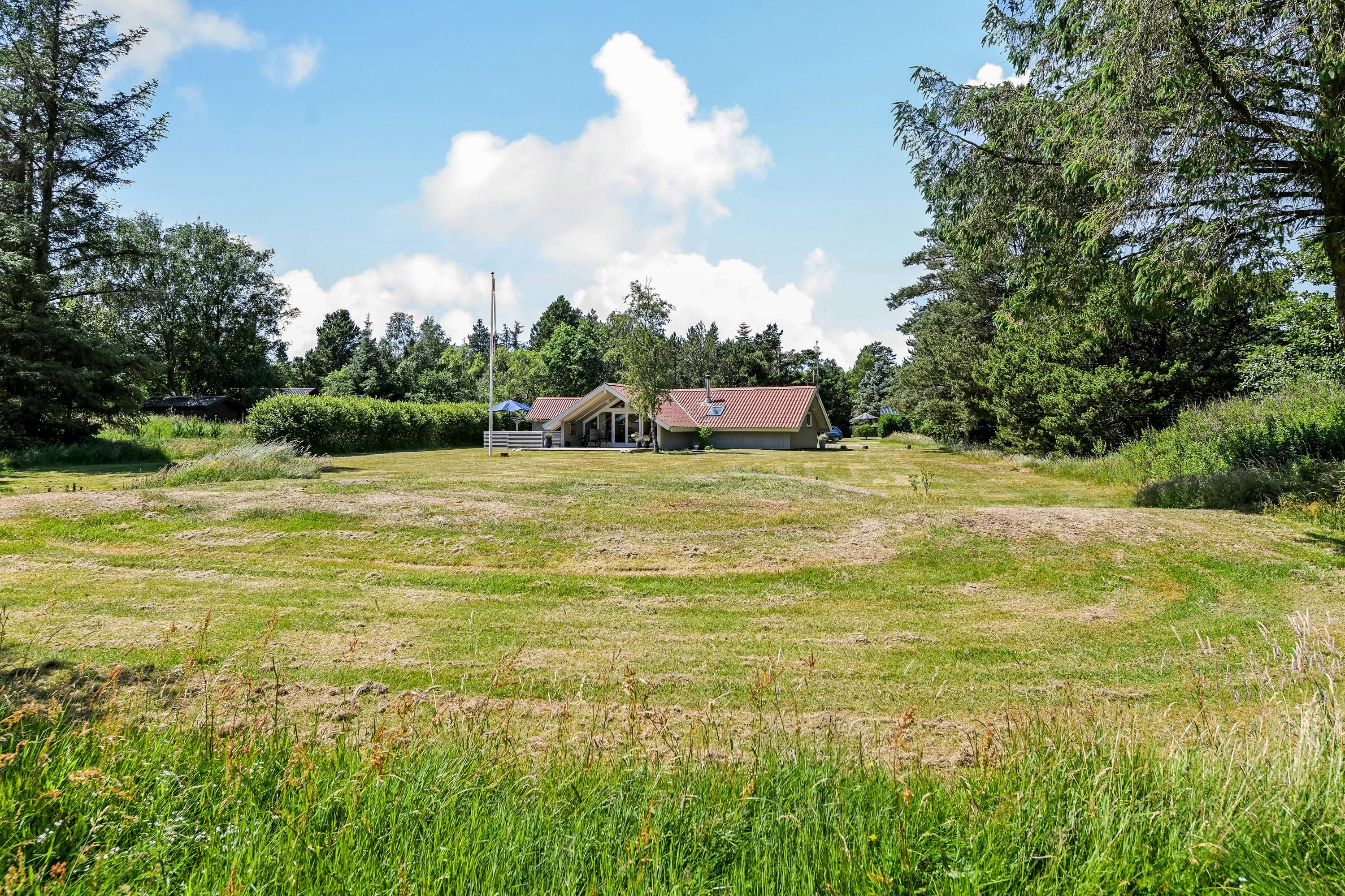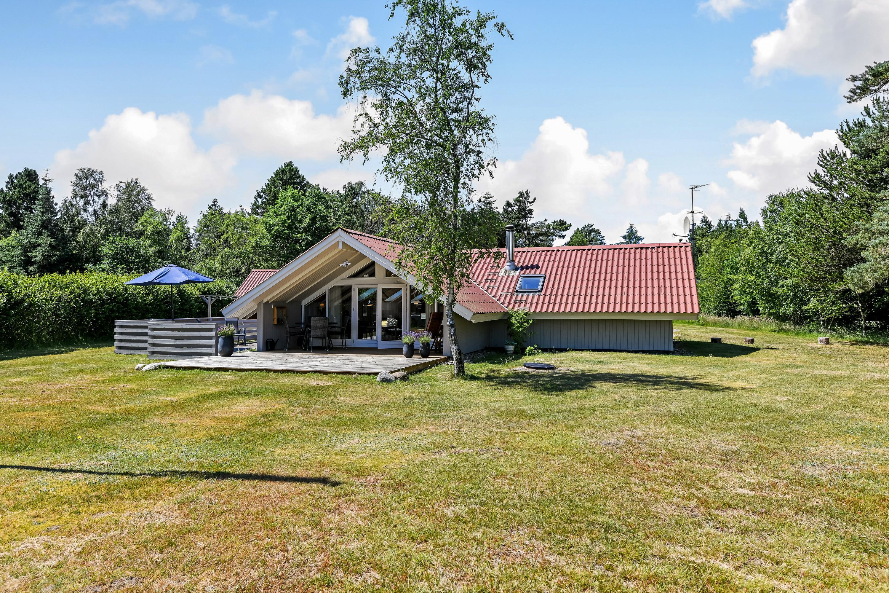 Sommerhuset ligger på en stor naturgrund med masser af skøn natur og høje træer, der indrammer grunden. I har masser af plads for jer selv, og her vil især hunden helt sikkert elske at løbe rundt for derefter at få sig en slapper i skyggen på den overdækkede del af terrassen.