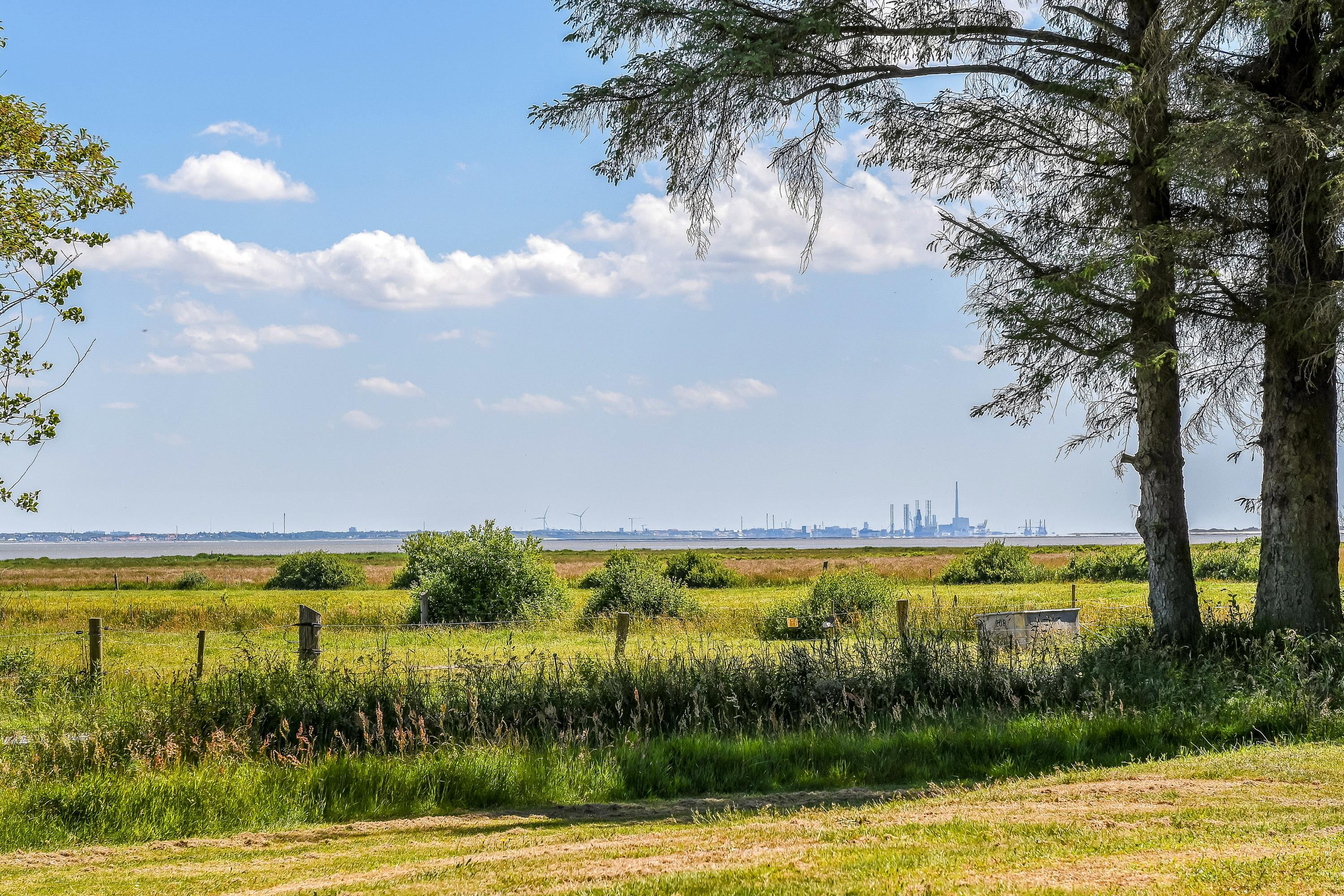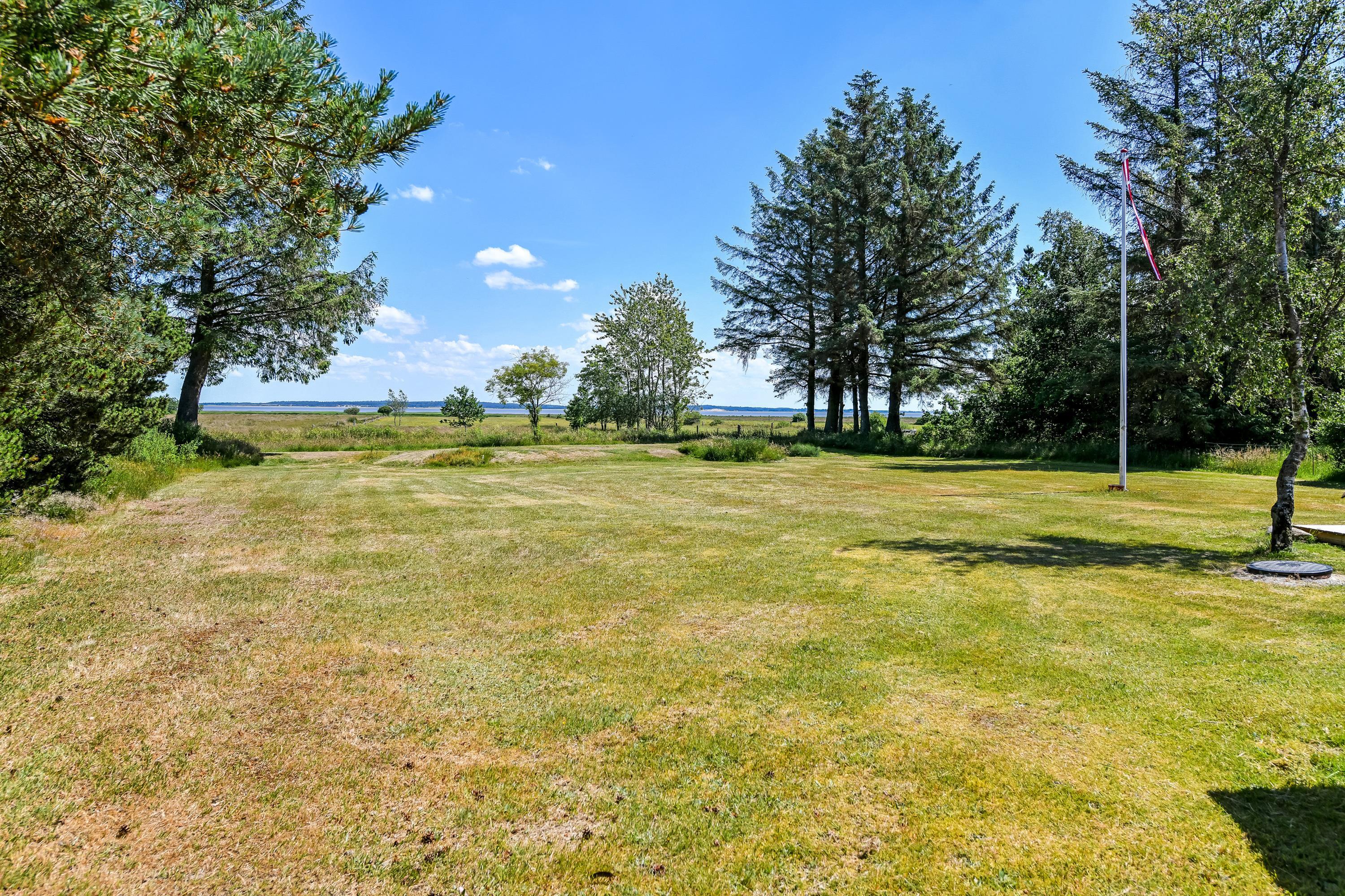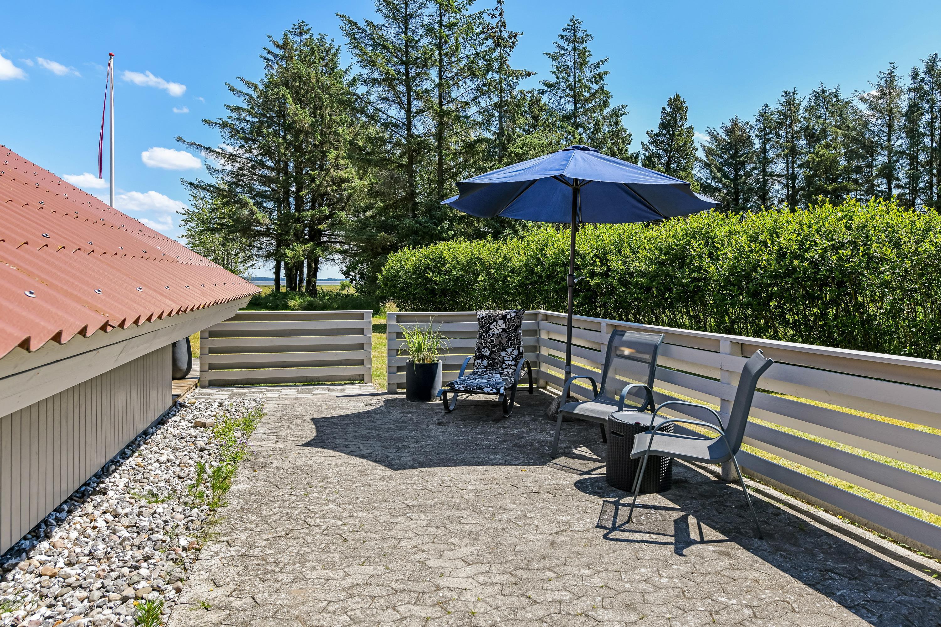 Stor have og delvis overdækket terrasse med udsigt til Ho-bugten