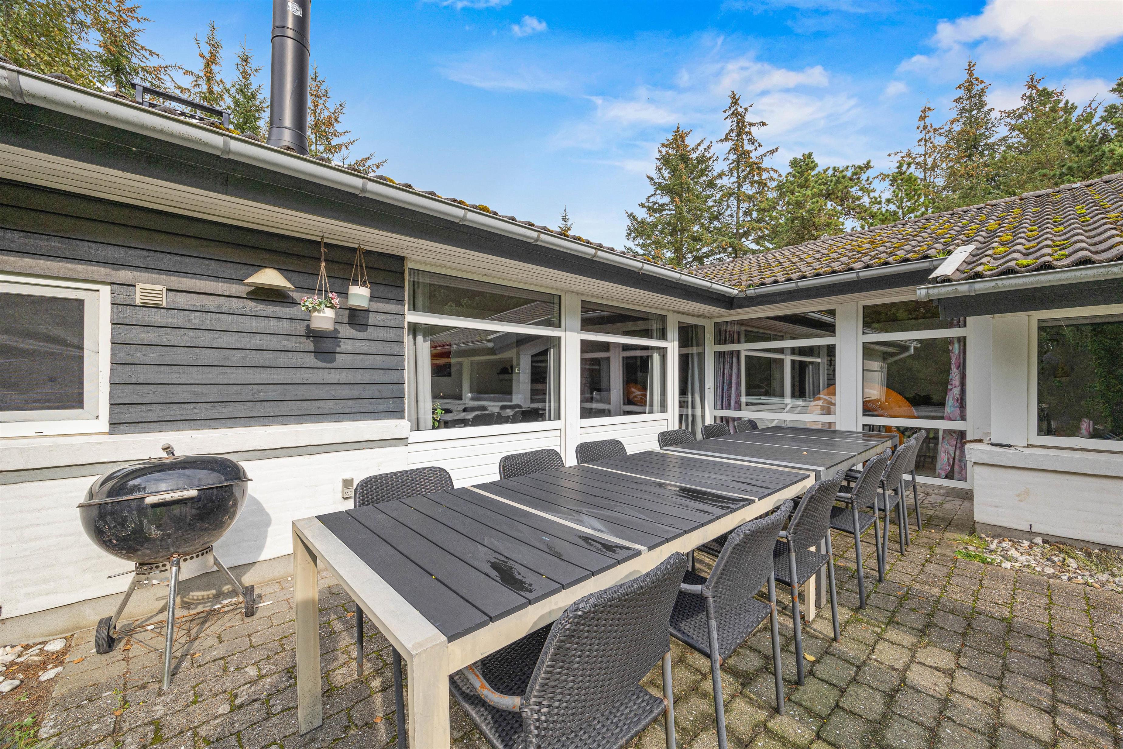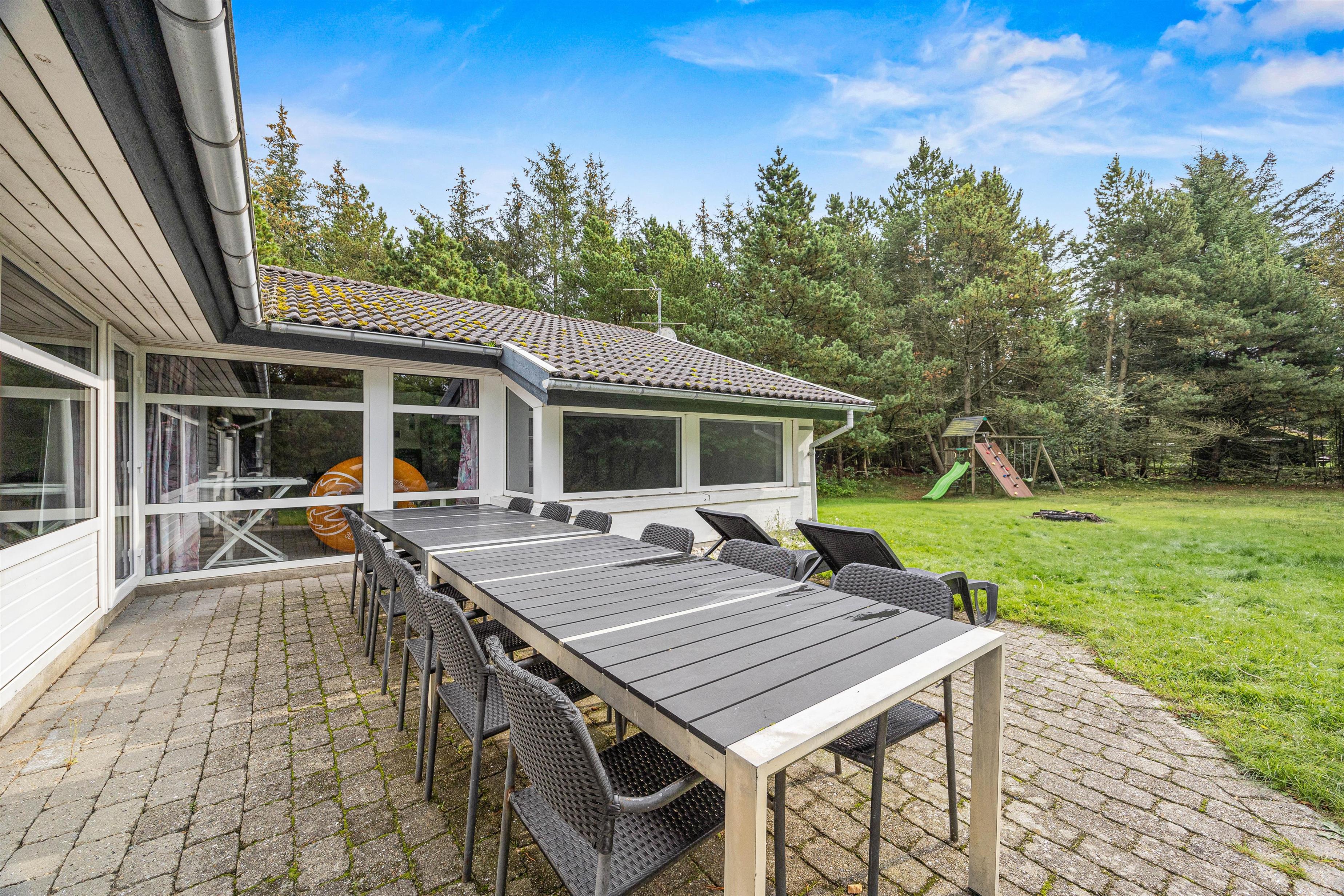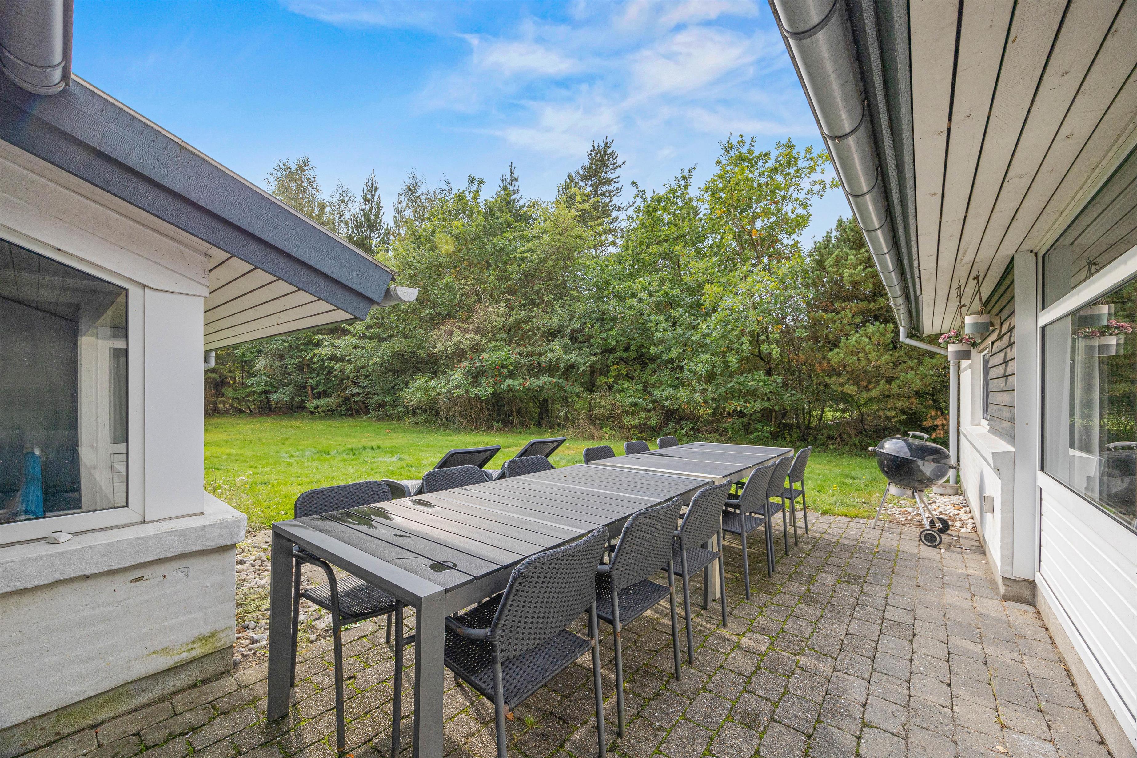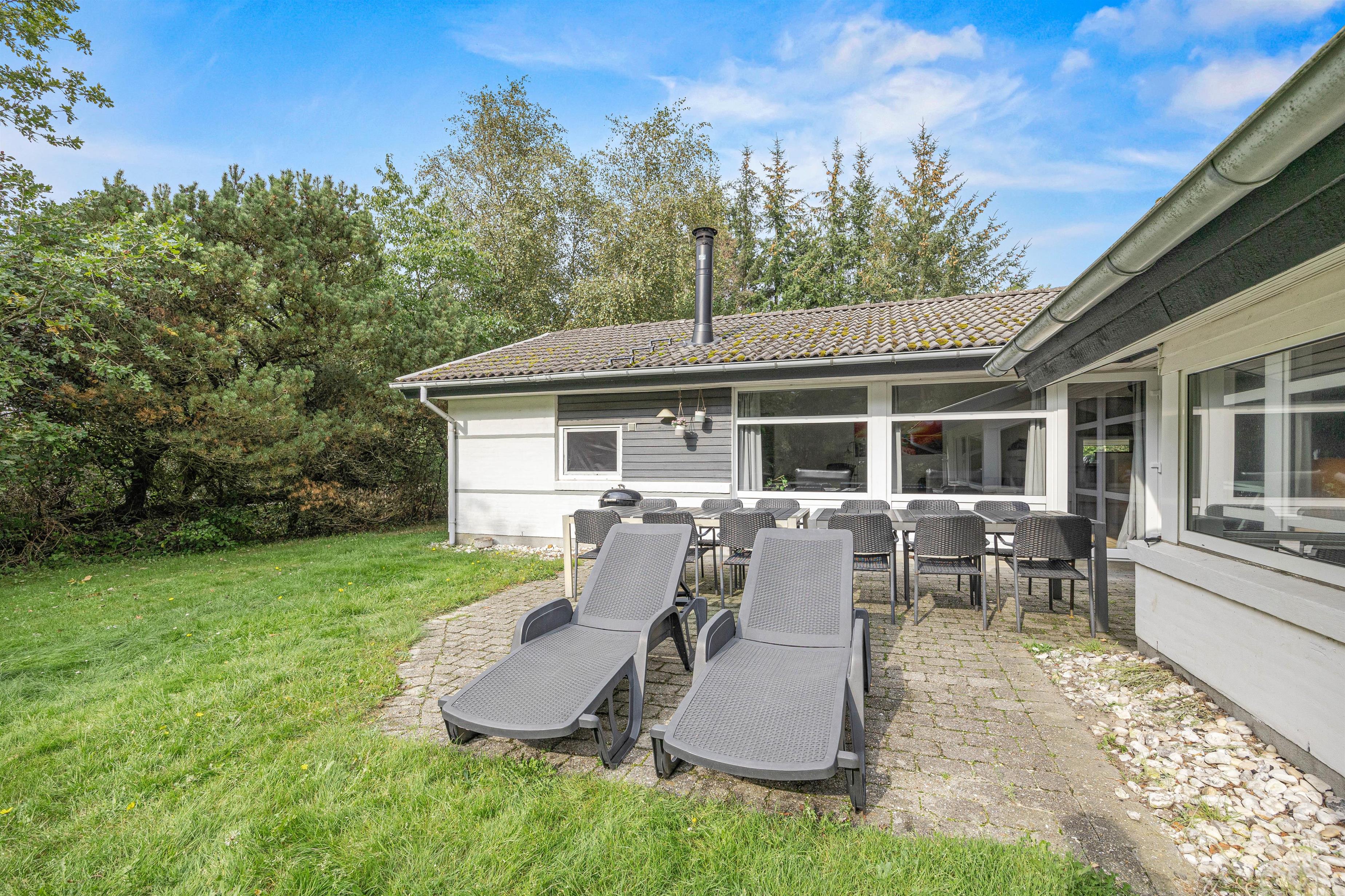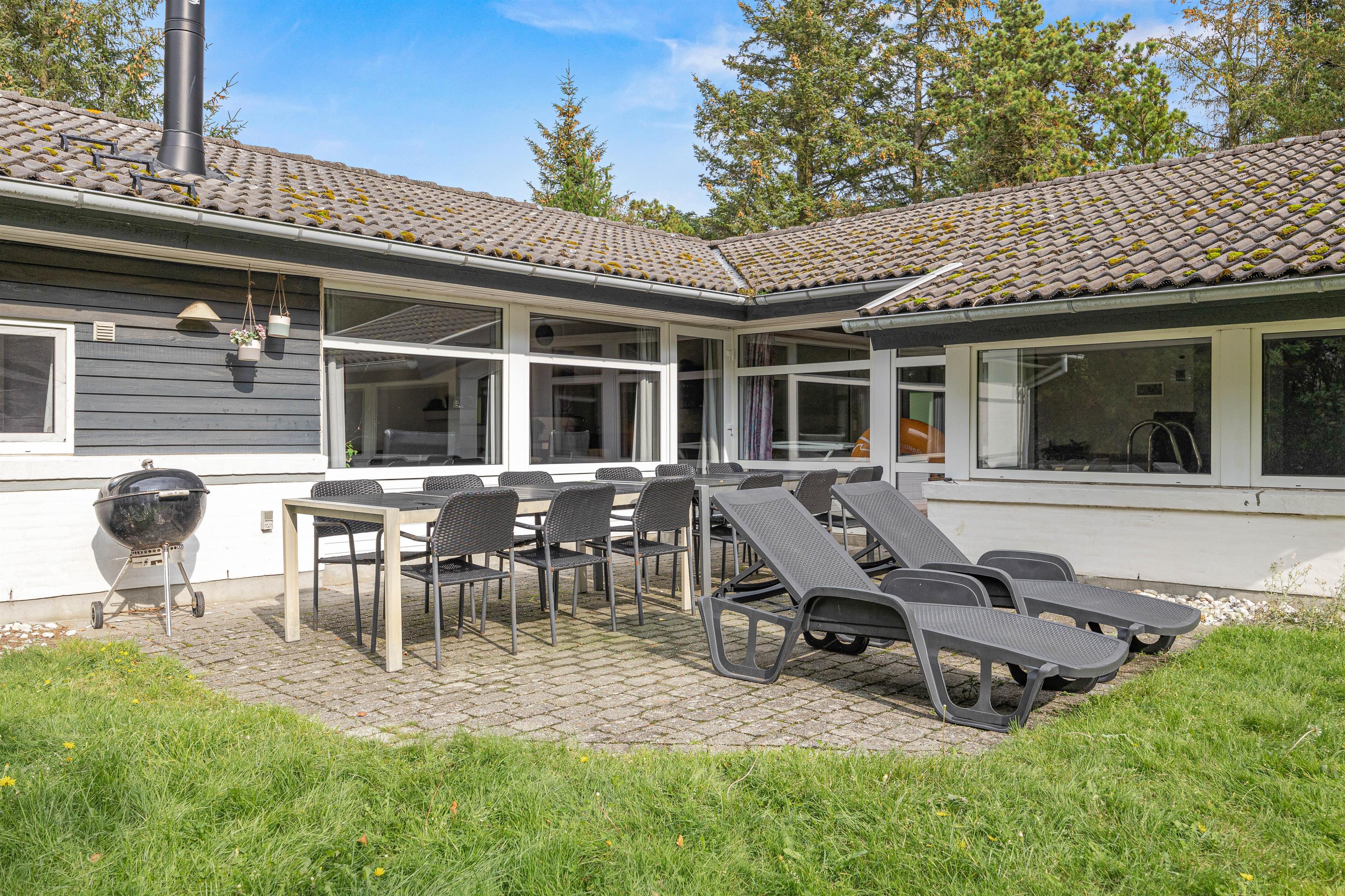 De solrige dage kan I nyde udenfor på den store terrasse. Her står både havemøbler, liggestole og grill klar til jer. Grunden er godt afskærmet af de høje træer og råder over en stor græsplæne, hvor børnene og hundene kan tumle rundt. Her kan I spille fodbold, kongespil og til familiens mindste er her også et gyngestativ.