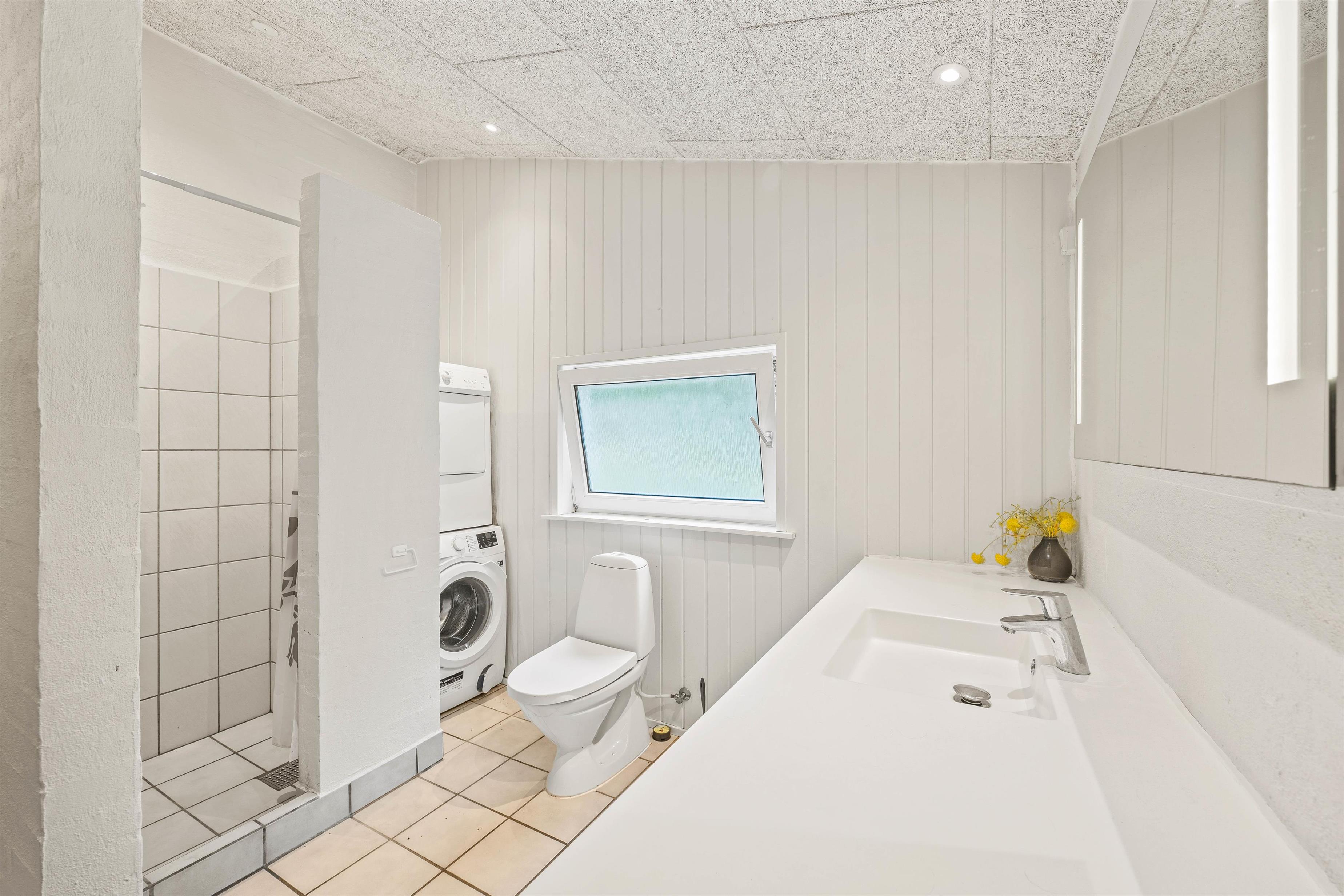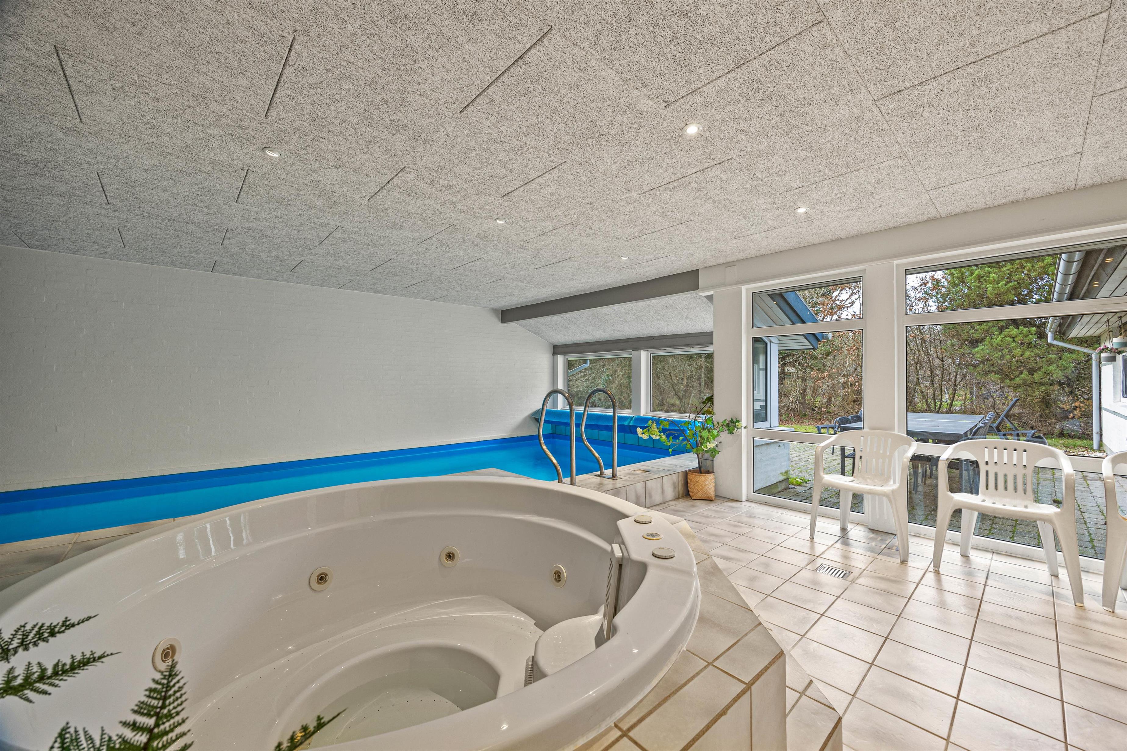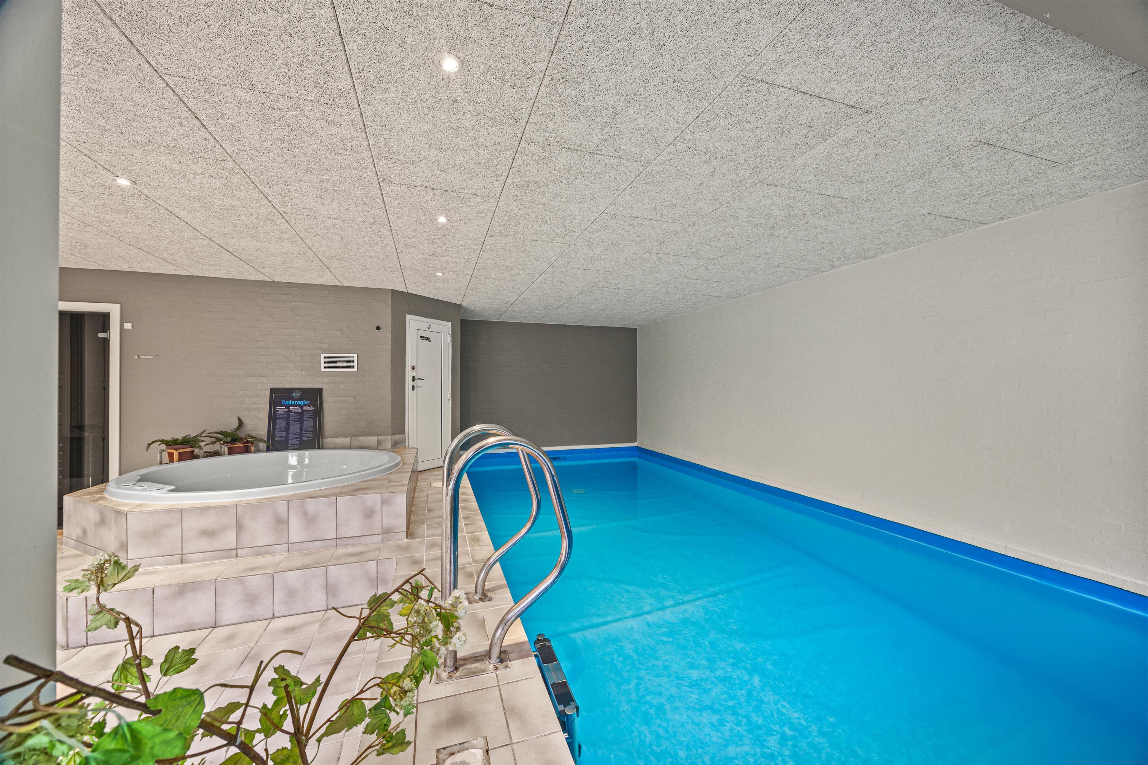 Et af højdepunkterne på Vestervænget 24 må uden tvivl være poolrummet, der gør jer uafhængige af vejret. Her kan I spille bold og plaske rundt i den 23m2 stor swimmingpool eller slappe af i den varme 4-personers spa – skønt er her også en sauna. Feriehuset rummer 2 badeværelser, begge med gulvvarme og det ene med vaskesøjle. Med vaskemaskine og tørretumbler kan I nemt opfriske strandhåndklæderne under opholdet.