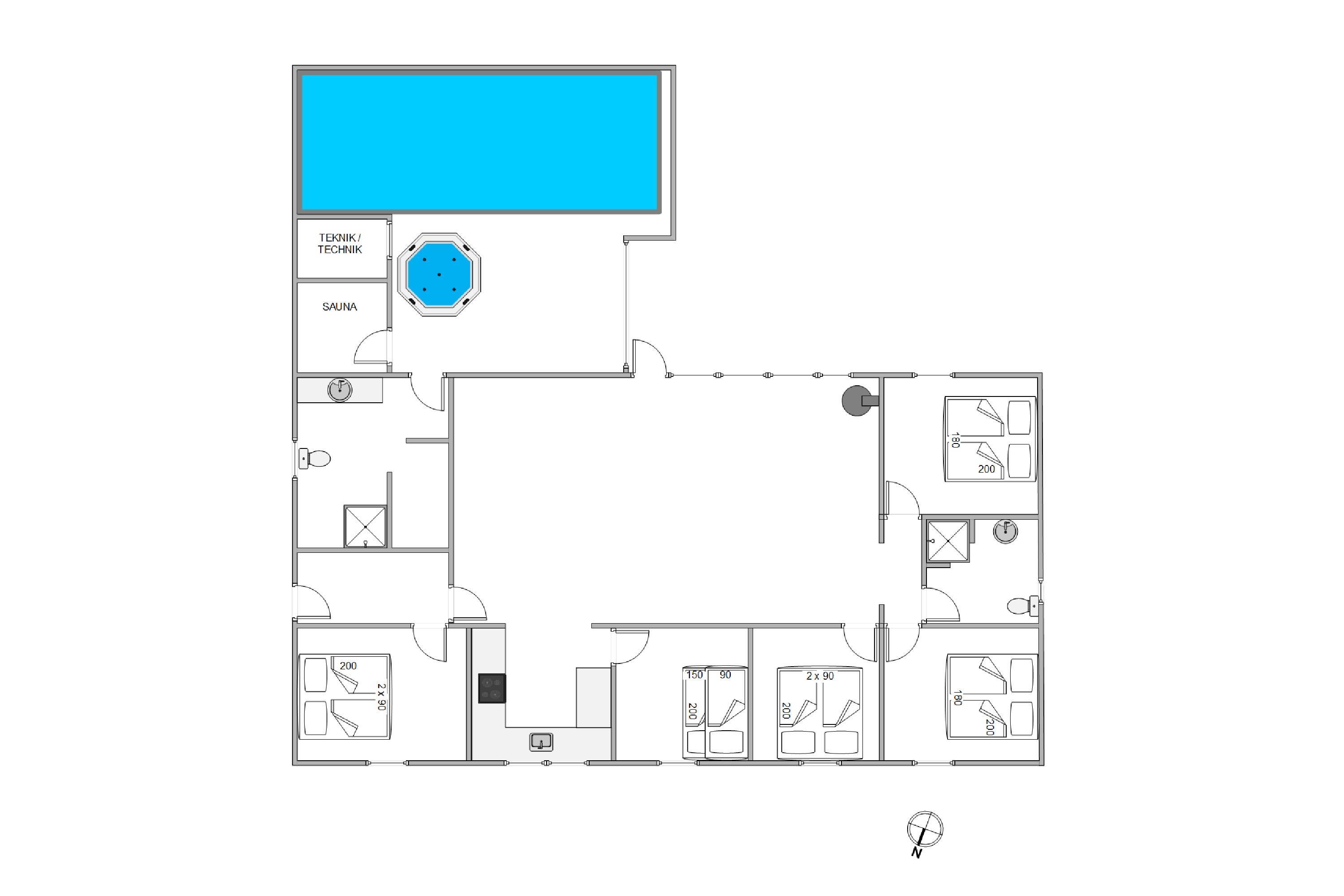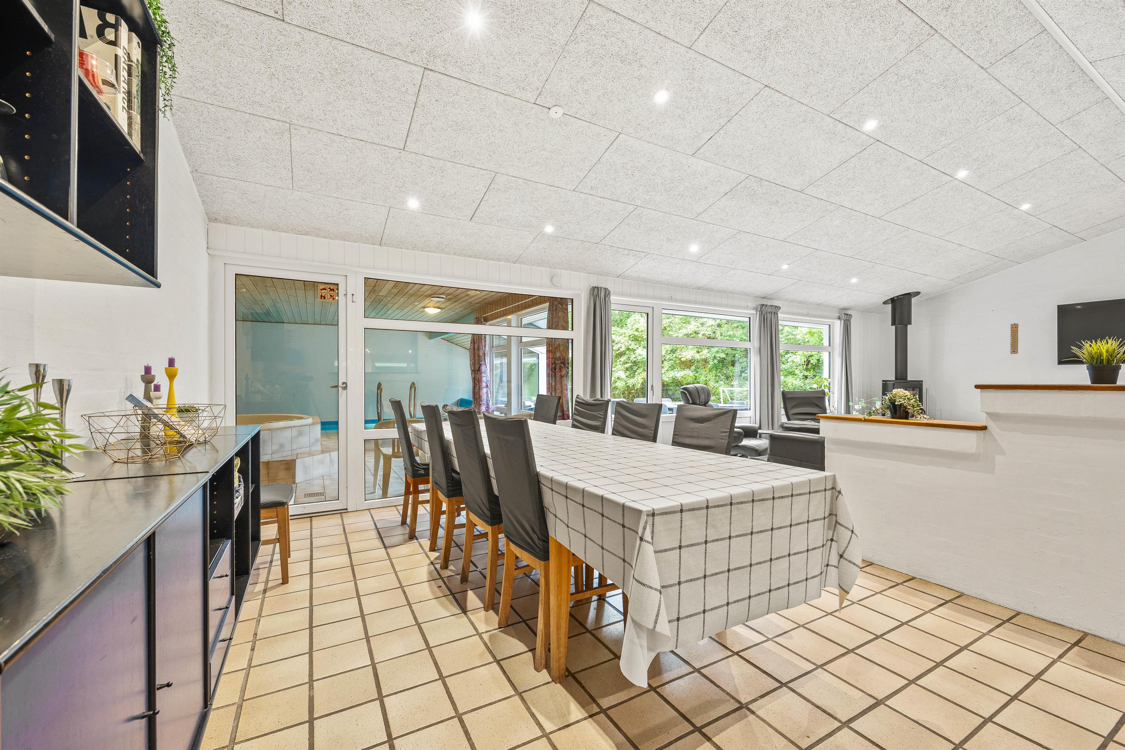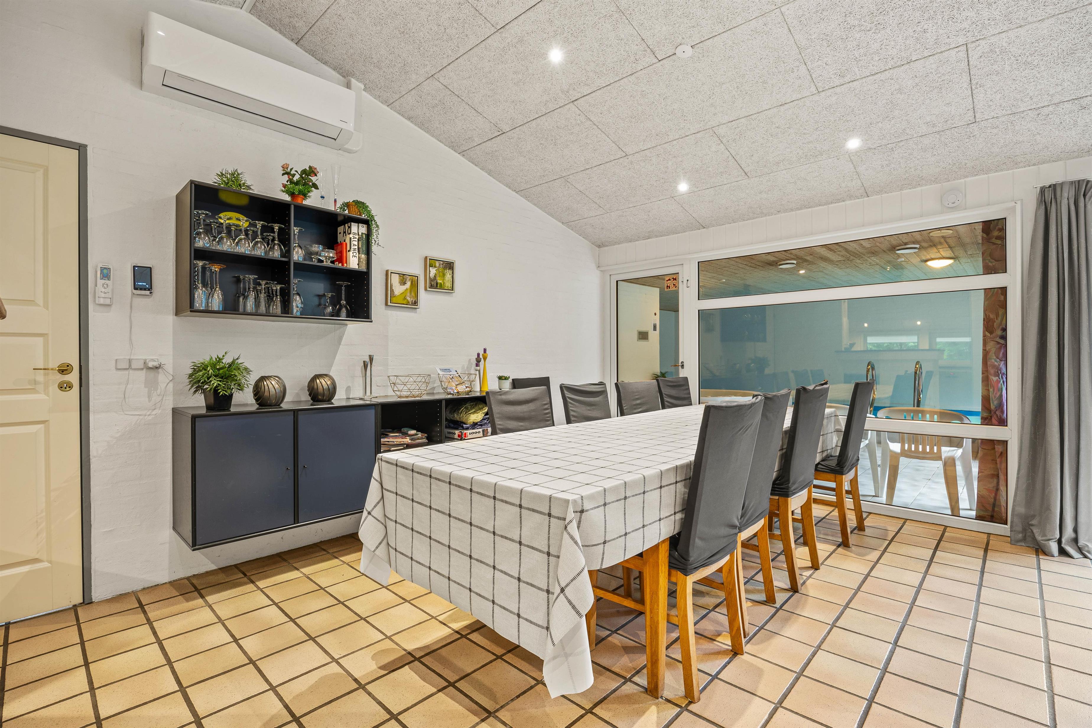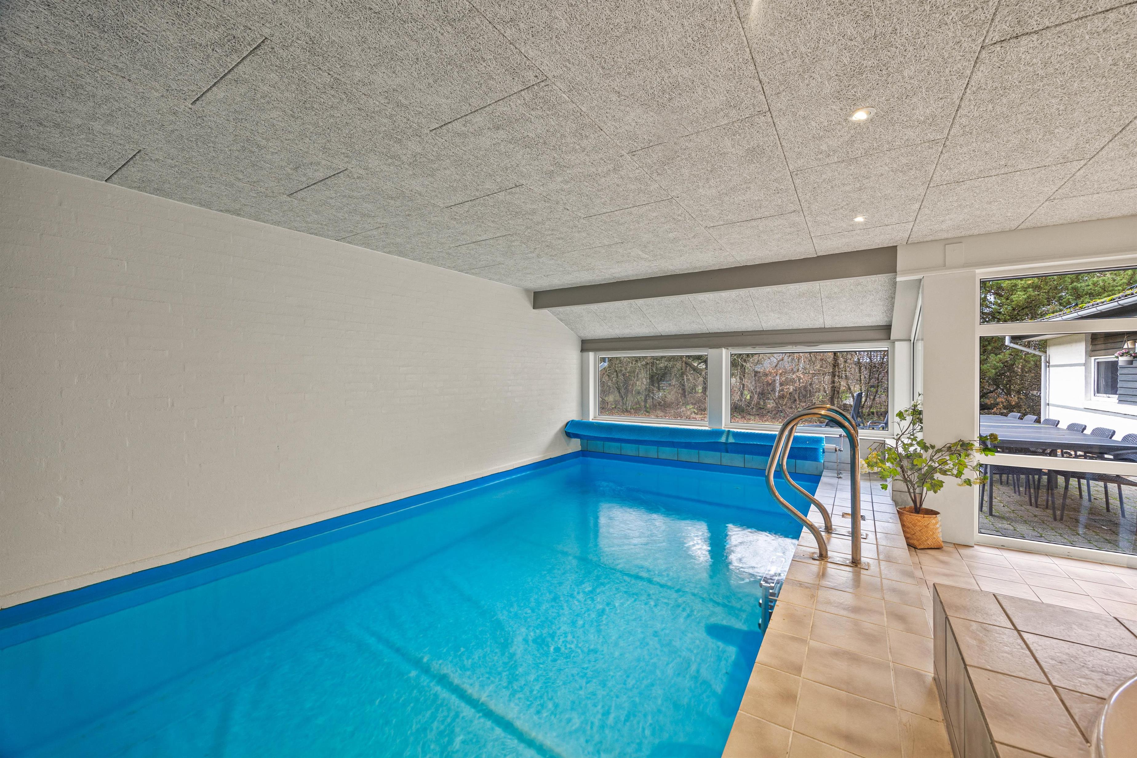 Et af højdepunkterne på Vestervænget 24 må uden tvivl være poolrummet, der gør jer uafhængige af vejret. Her kan I spille bold og plaske rundt i den 23m2 stor swimmingpool eller slappe af i den varme 4-personers spa – skønt er her også en sauna. Feriehuset rummer 2 badeværelser, begge med gulvvarme og det ene med vaskesøjle. Med vaskemaskine og tørretumbler kan I nemt opfriske strandhåndklæderne under opholdet.