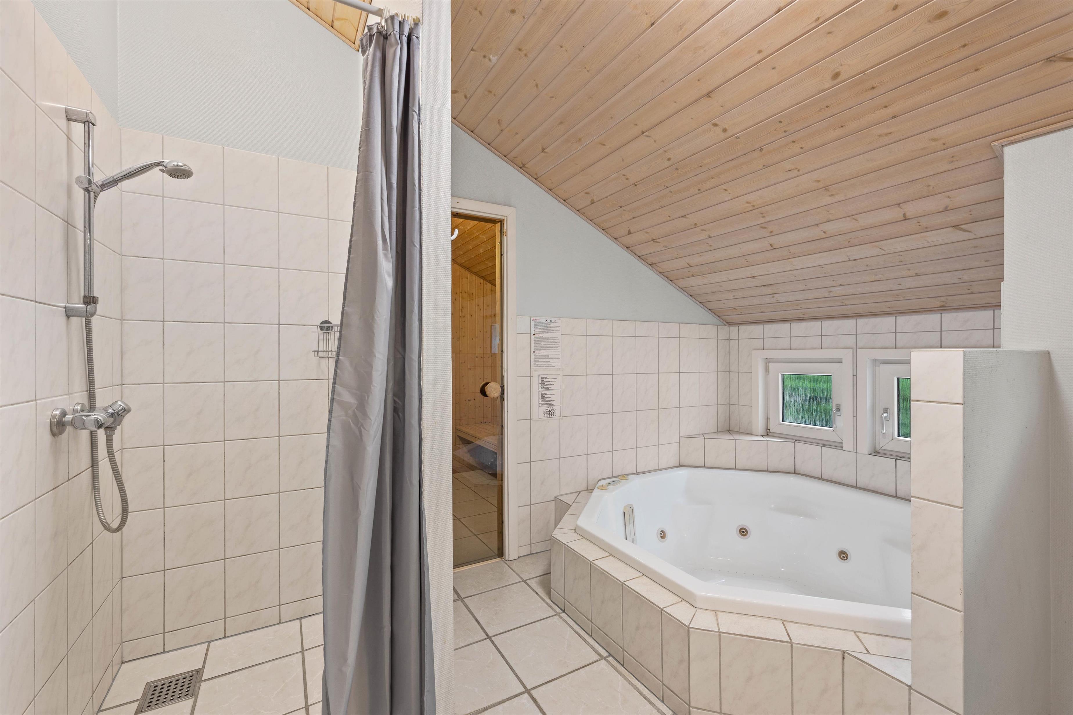 På badeværelset kan I sætte jer til rette i det skønne spabad, hvor I kan slappe fuldstændig af i det boblende vand. Efterfølgende kan I rykke ind i den dejlige sauna, der forkæler med masser af afslapning i varmen.