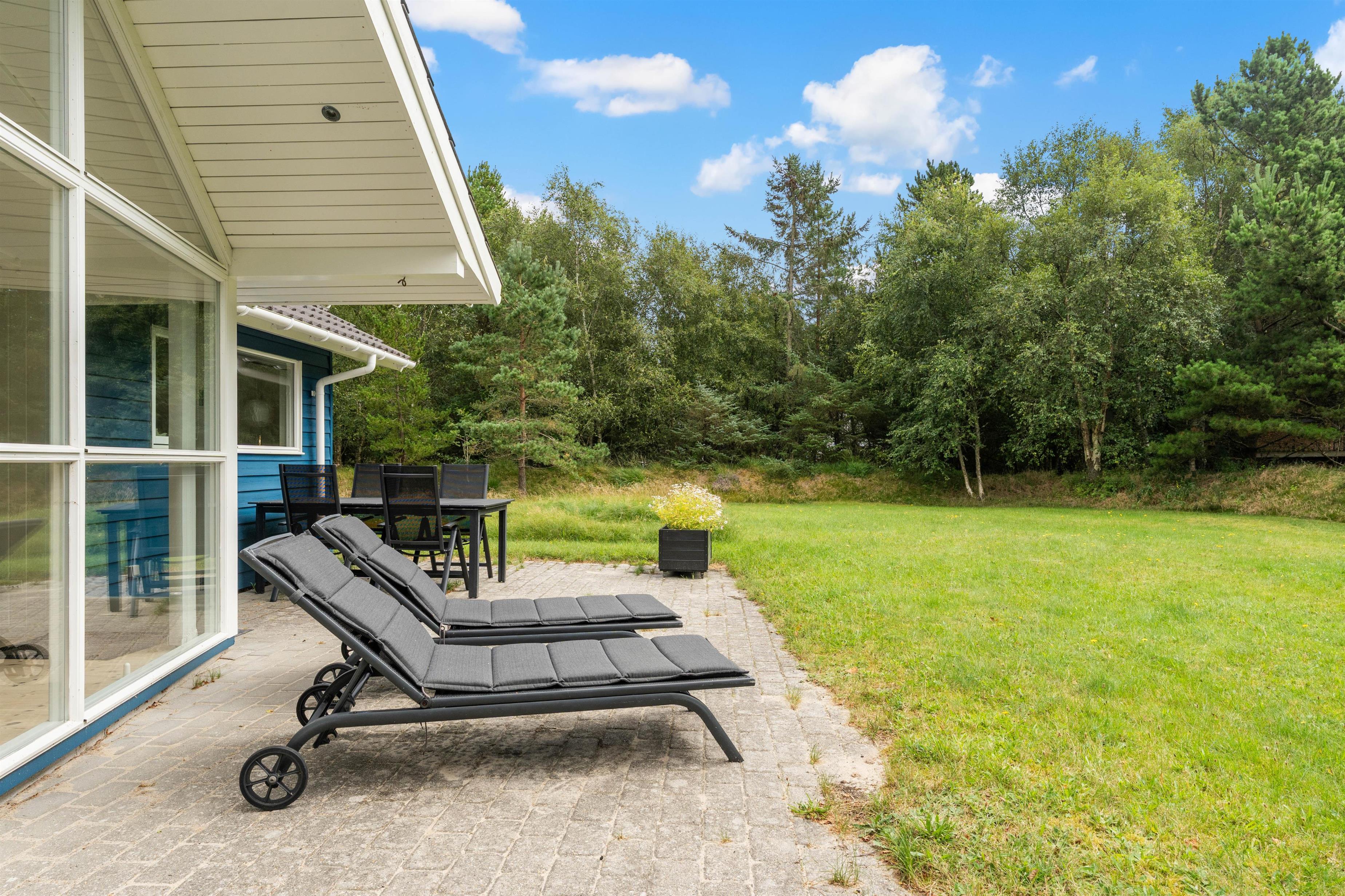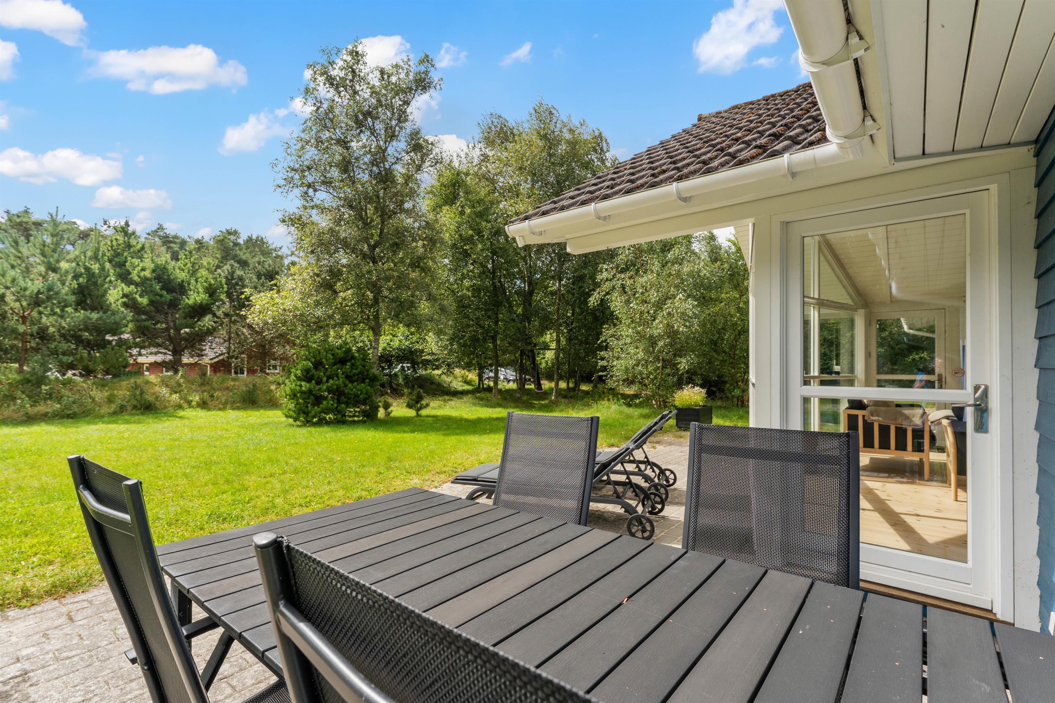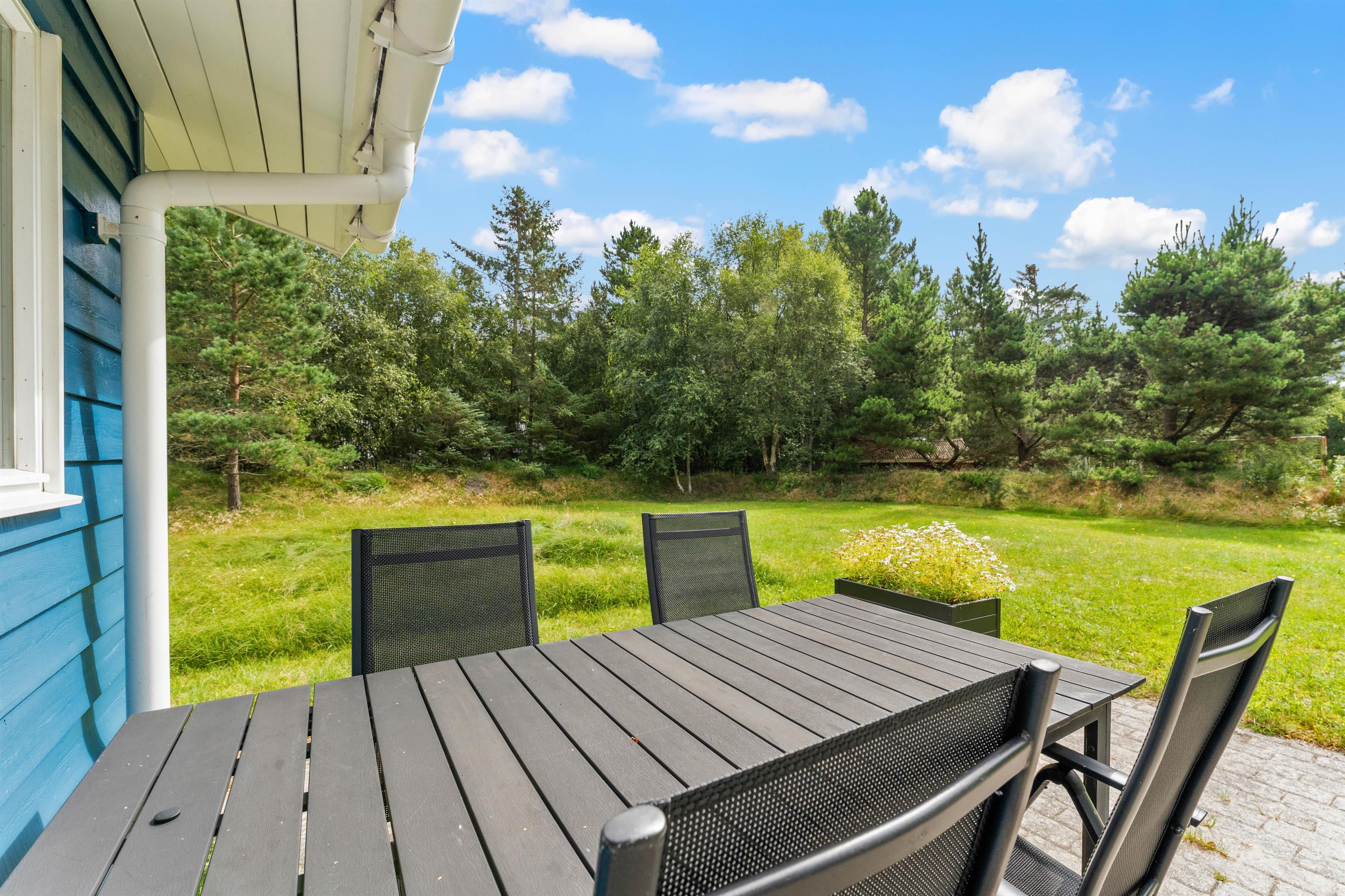 På den åbne terrasse står havemøbler og liggestole klar fra start til at give jer nogle afslappende dage udenfor i de flotte omgivelser, og på de lune sommeraftener kan I runde af med at tænde op i grillen og nyde et godt glas rødvin, mens aftensolen går ned bag træerne.