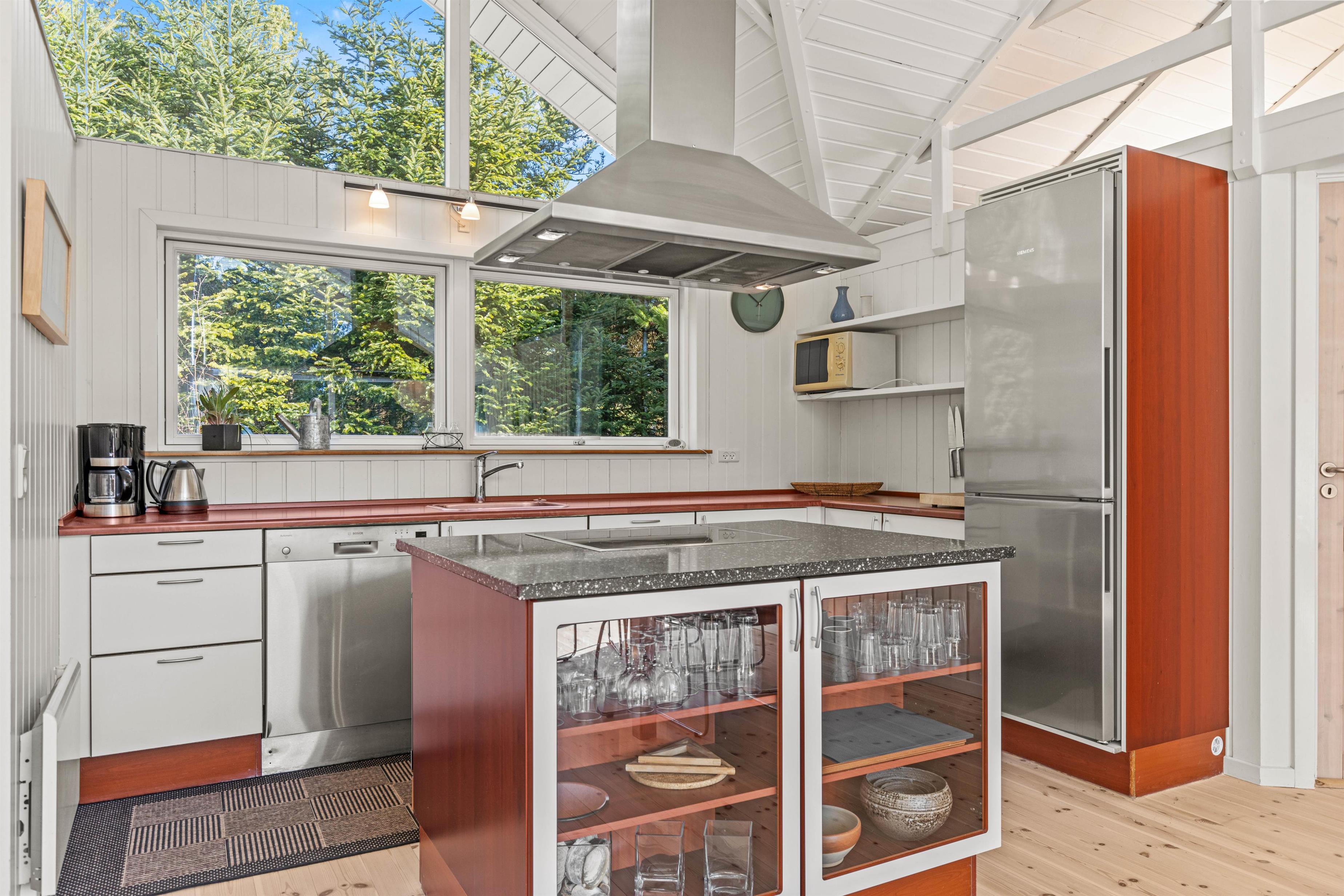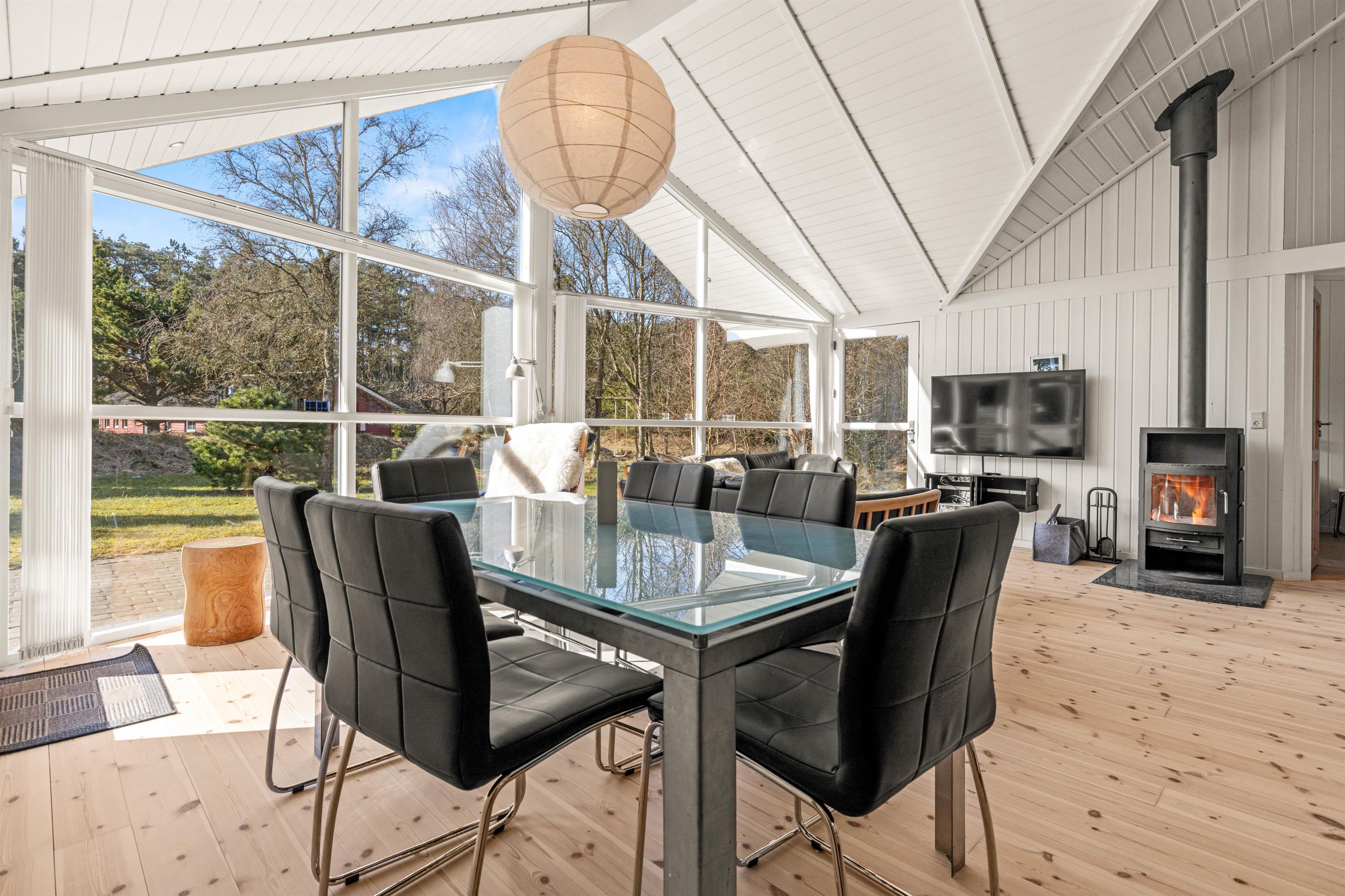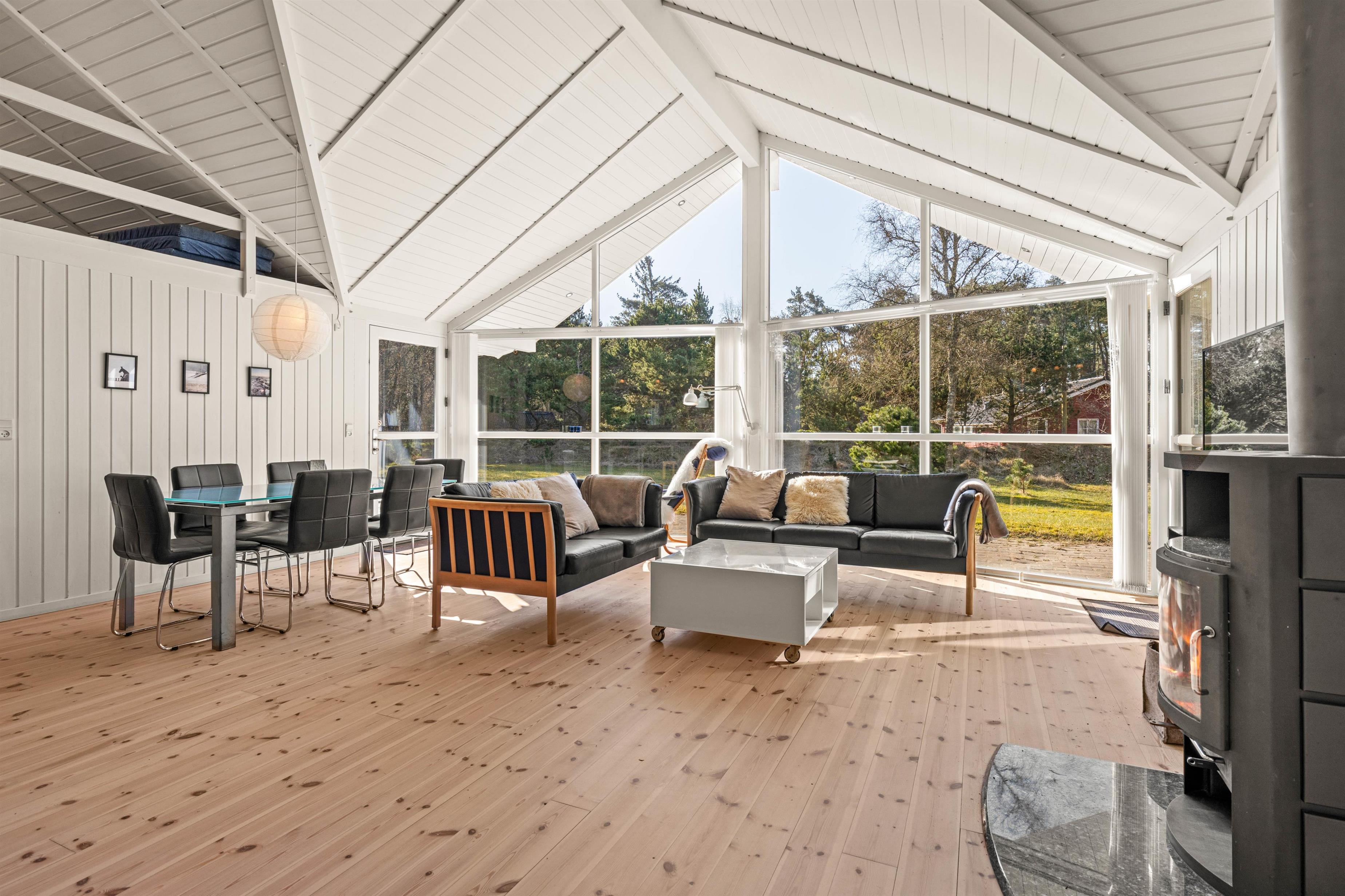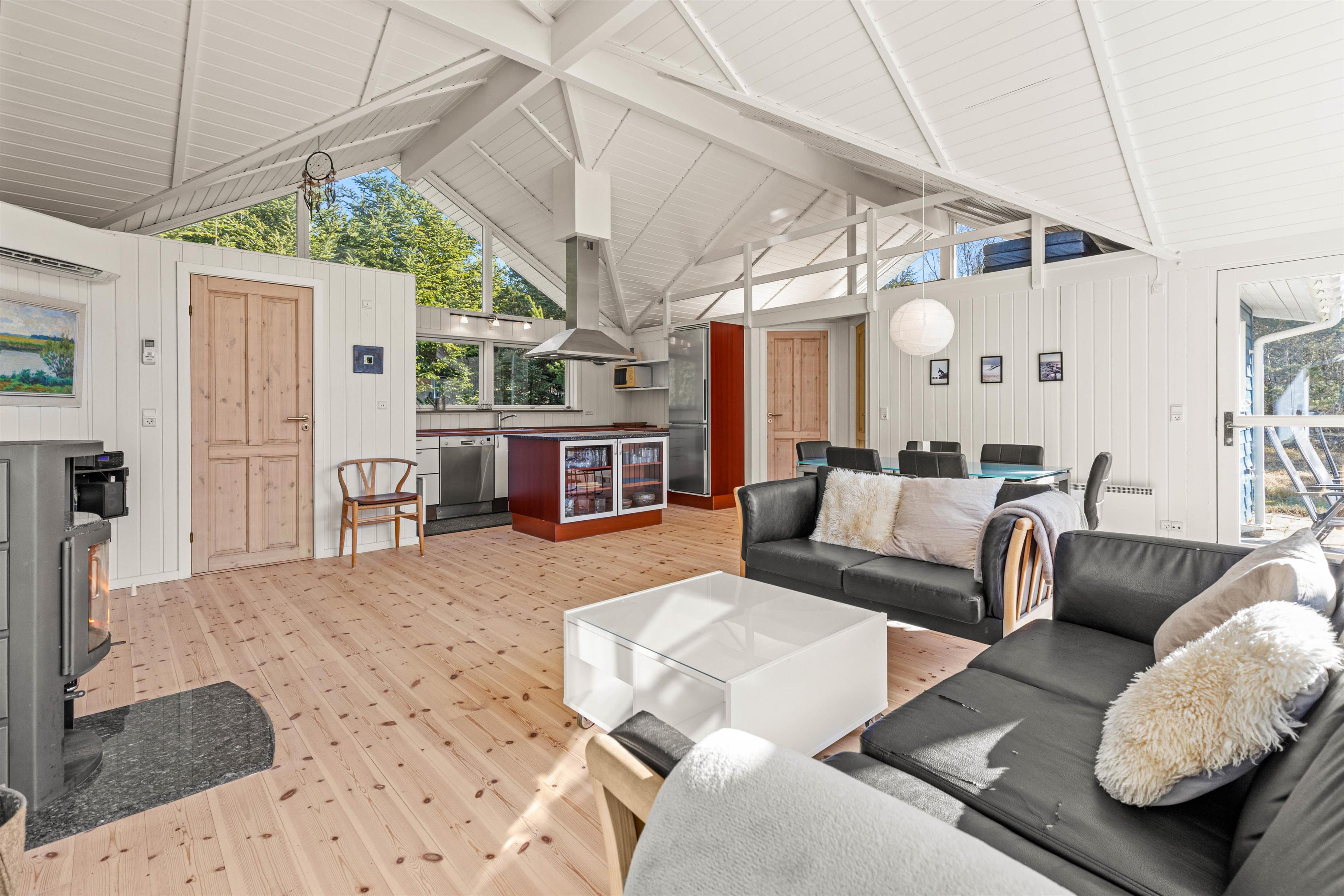 På den åbne terrasse står havemøbler og liggestole klar fra start til at give jer nogle afslappende dage udenfor i de flotte omgivelser, og på de lune sommeraftener kan I runde af med at tænde op i grillen og nyde et godt glas rødvin, mens aftensolen går ned bag træerne.