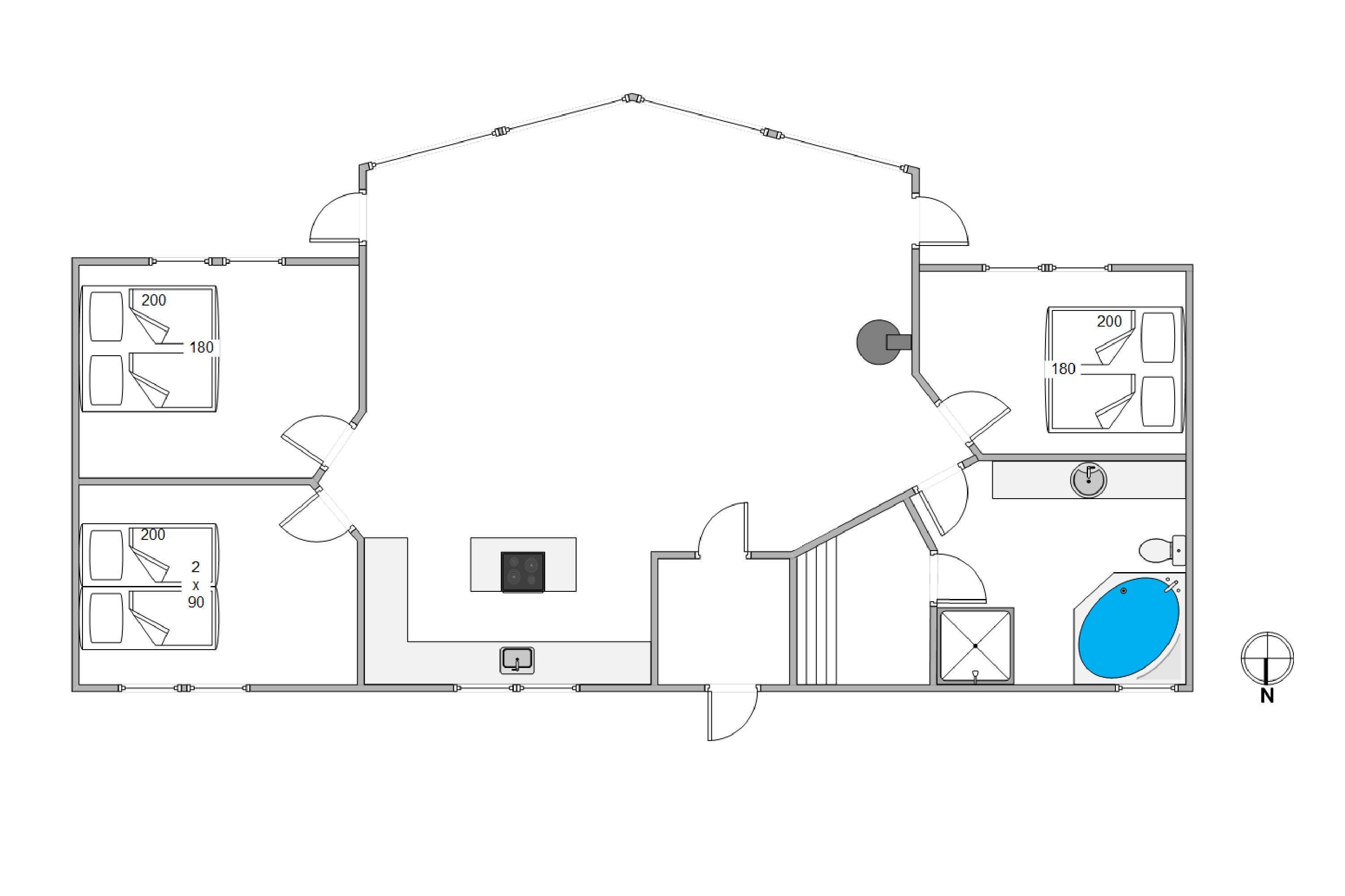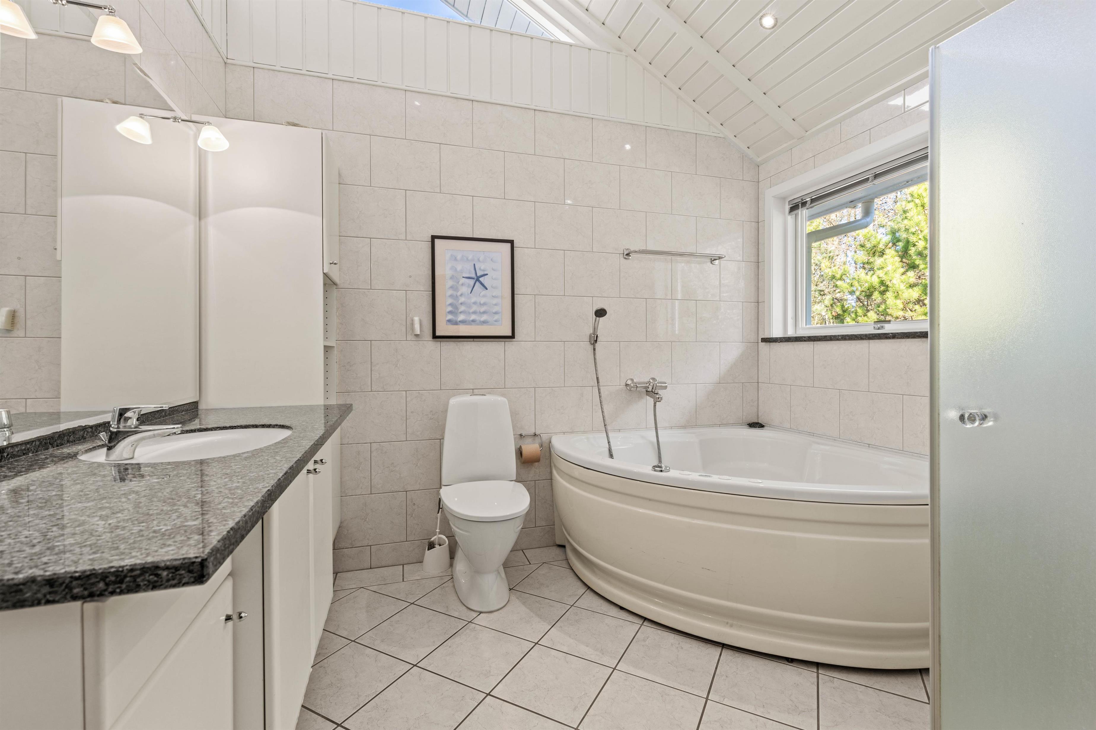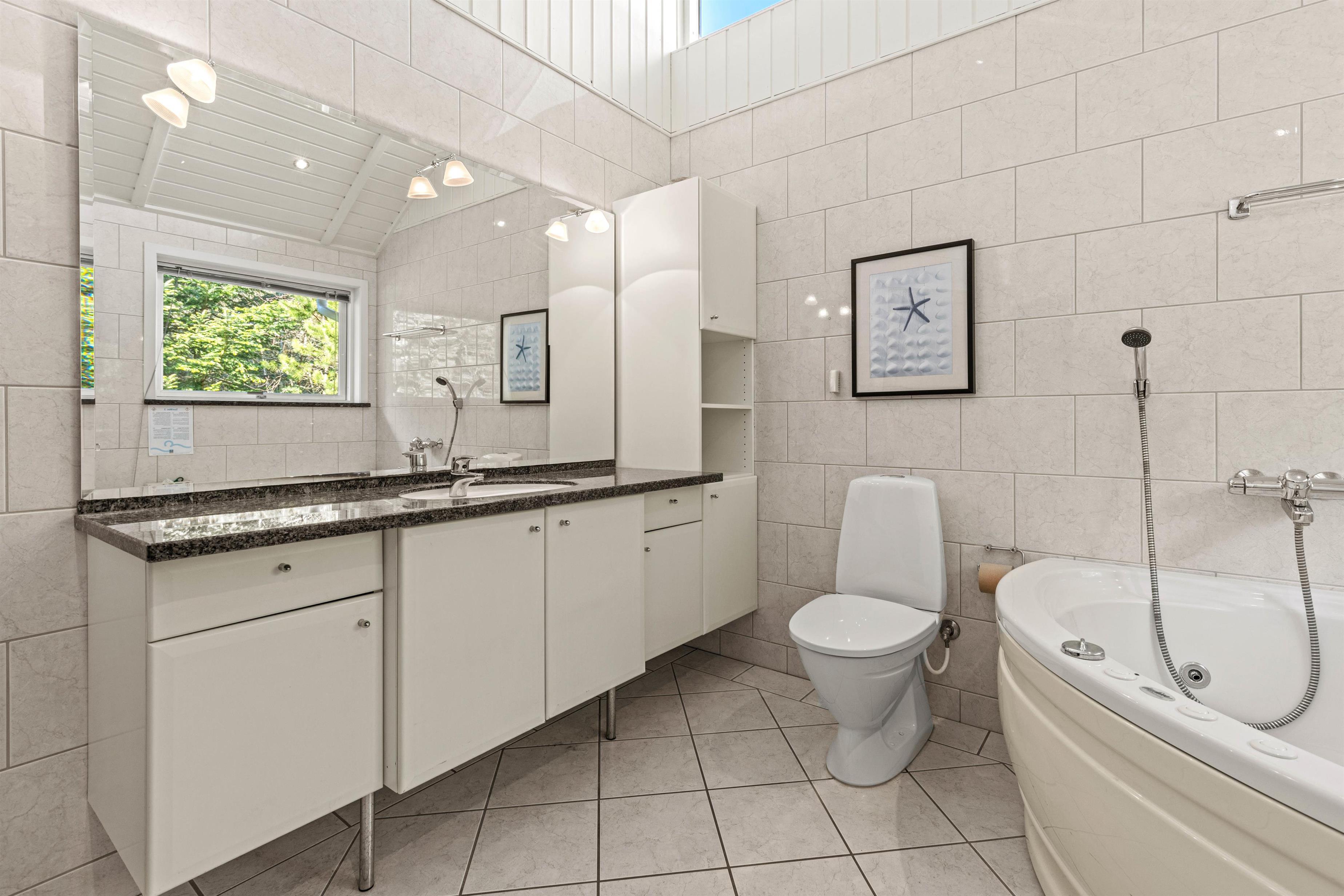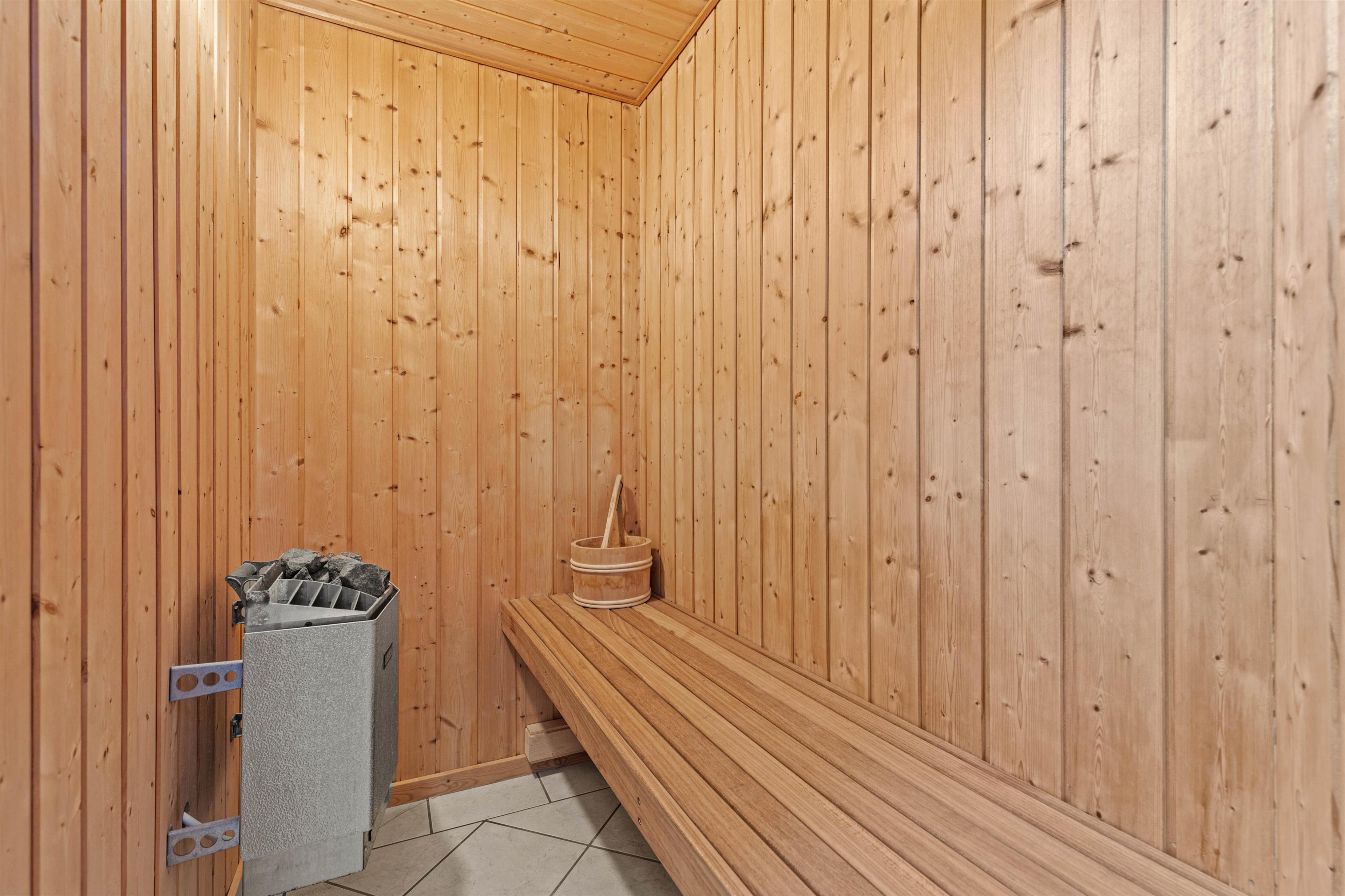 Den moderne indretning gør sig gældende i hele huset, og selv på badeværelset er der sørget for det nyeste nye - her står en lækker sauna og et dejligt spabad klar til at gøre ferien endnu mere afslappende og forfriskende.