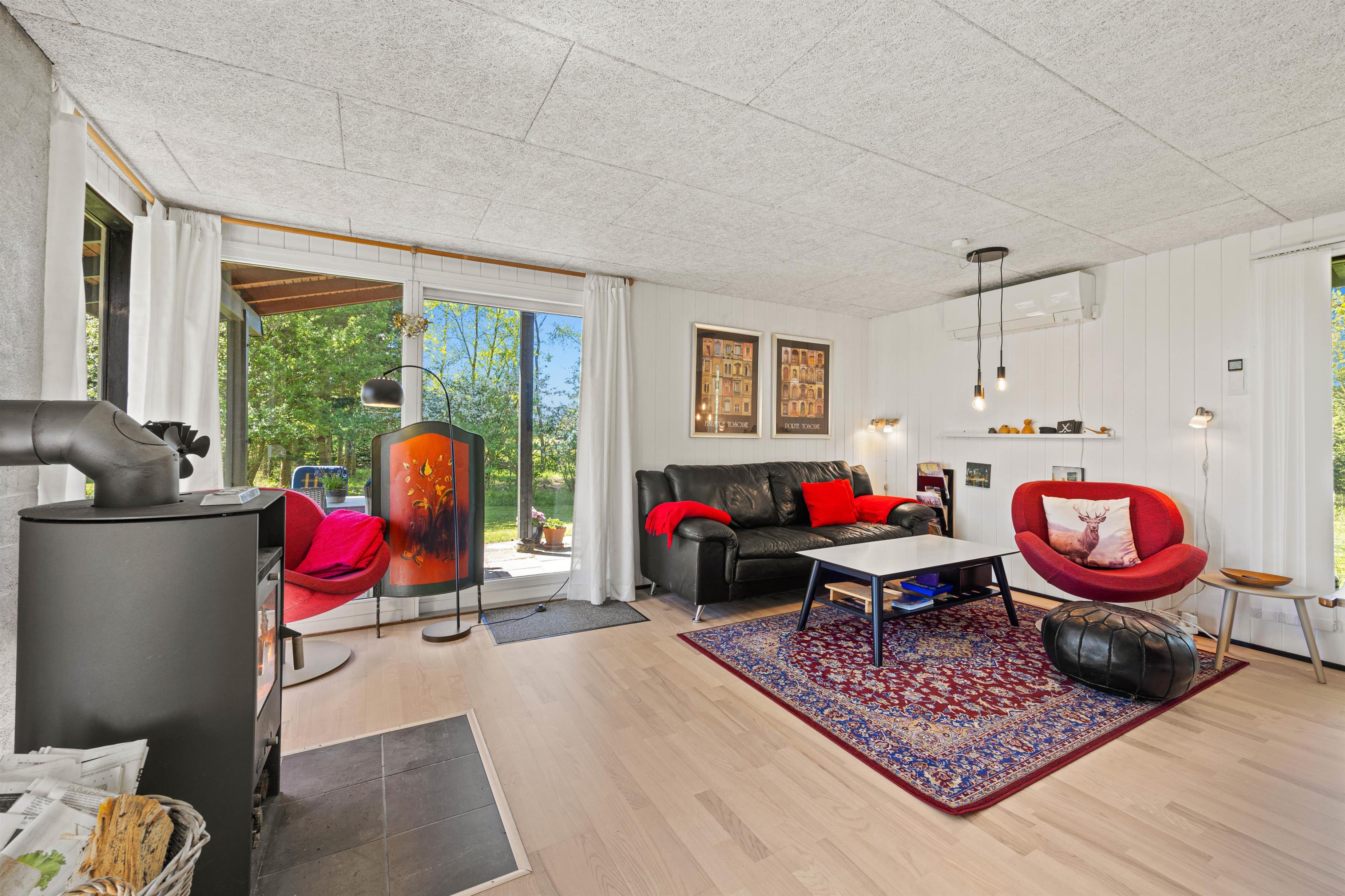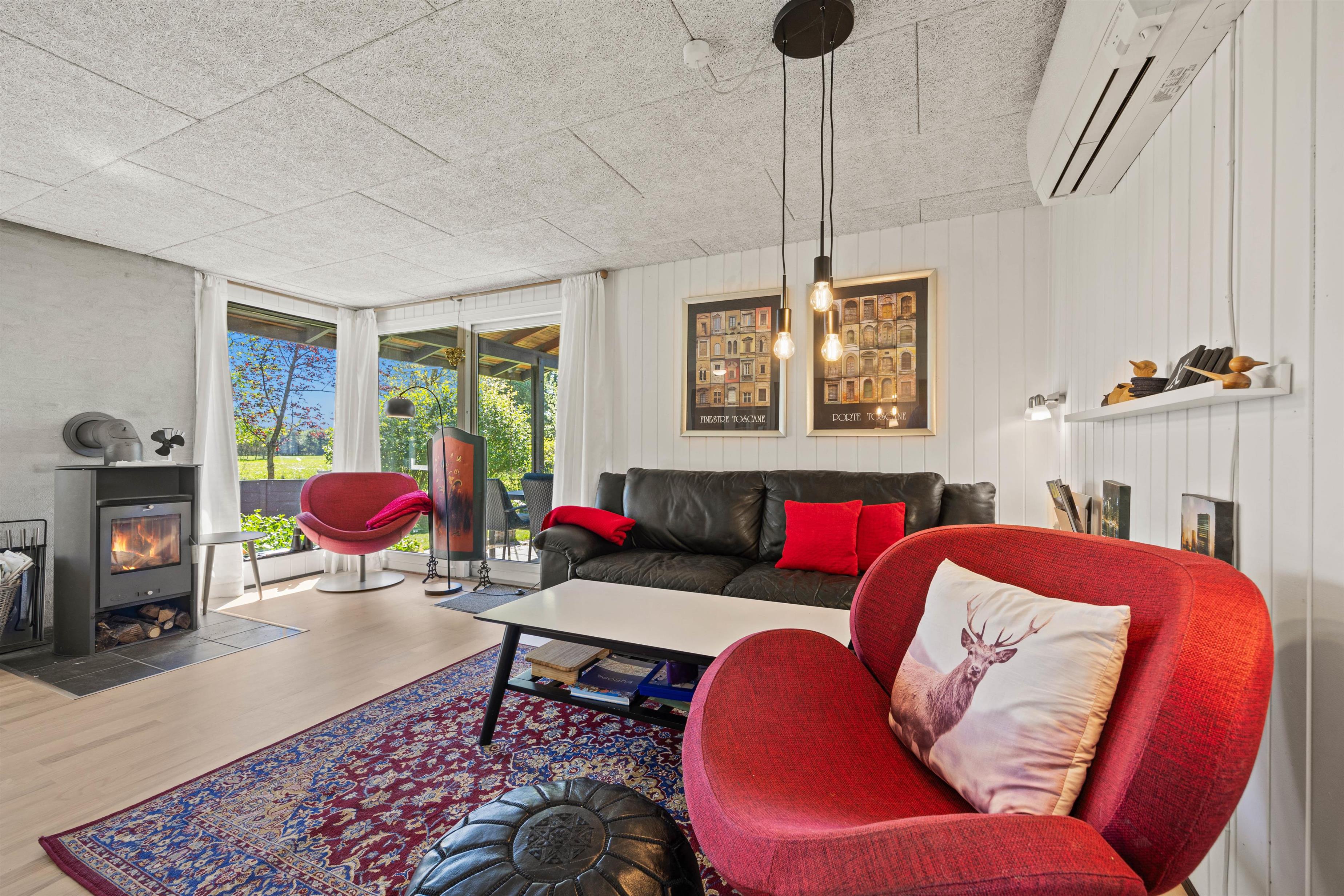 Godt mætte kan I slappe af i sofahjørnet i stuens hyggekrog, og er der regn og rusk udenfor, er der lagt op til hygge indendørs, tæt på brændeovnen over en varm drik.