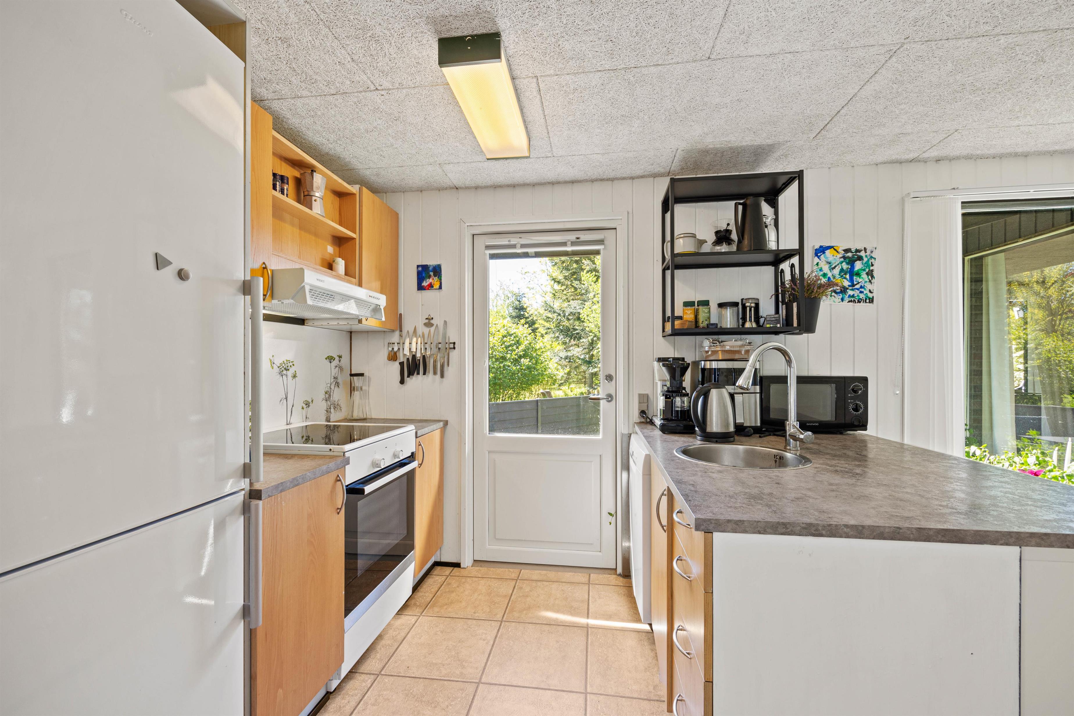 Når I har taget et forfriskende bad i sommerhusets badeværelse, hvor gulvvarmen luner jeres fødder, kan I i køkkenet på Fyrrevænget 29 kokkerere dejlig feriemad og samtidigt følge med i de øvrige aktiviteter i husets hjerte.