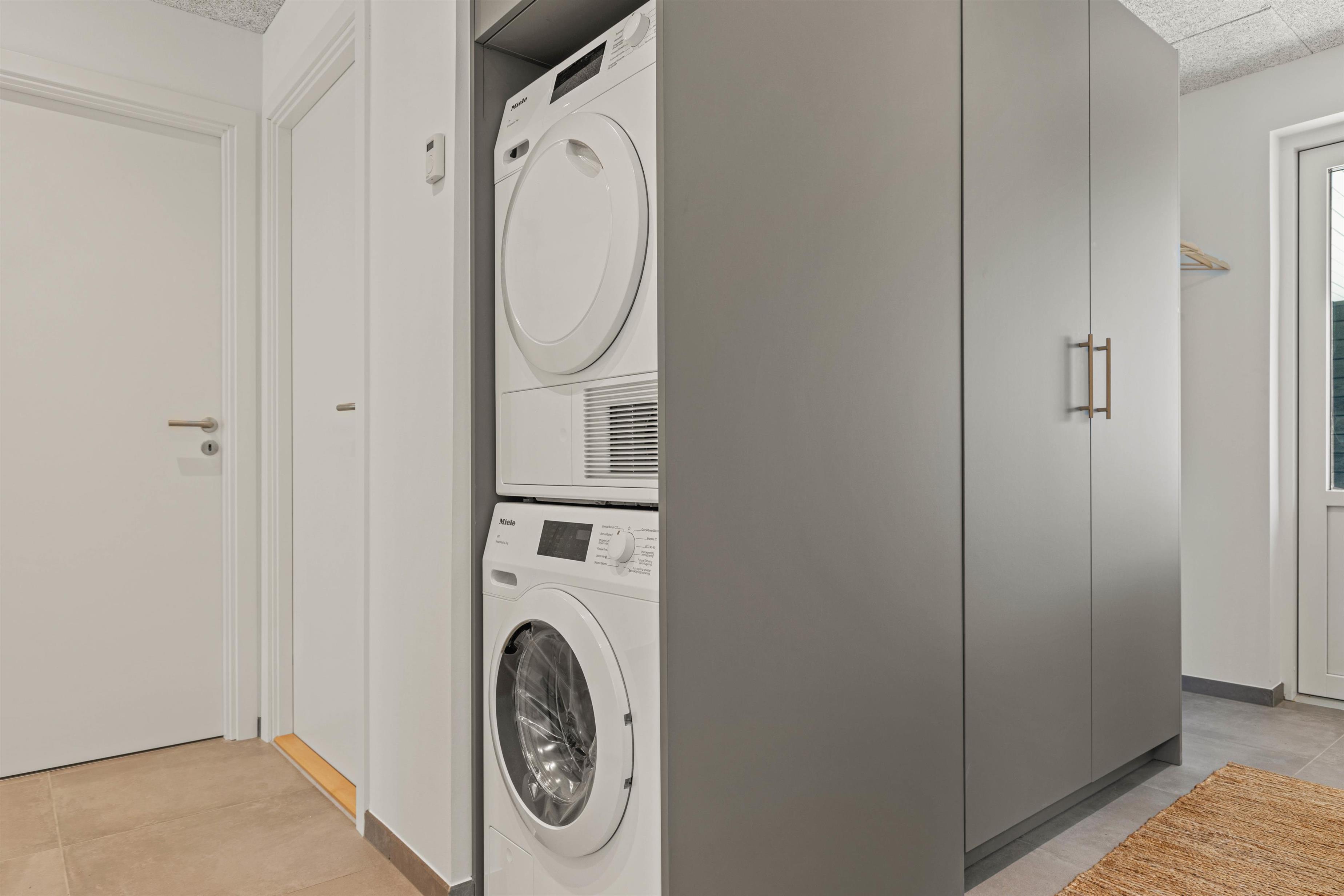 Det veludstyrede køkken har naturligvis alt moderne udstyr – opvaskemaskine, store køle/fryseskabe, ovn i løftehøjde og induktionskogeplade på køkkenøen. Derved kan kokken og køkkenhjælperne stadig deltage i samtalen ved spisebordet eller se, hvem der vinder i brætspillet. Der er god plads til alle i de lækre sofaer, der frister til hygge og samvær foran brændeovnen.
