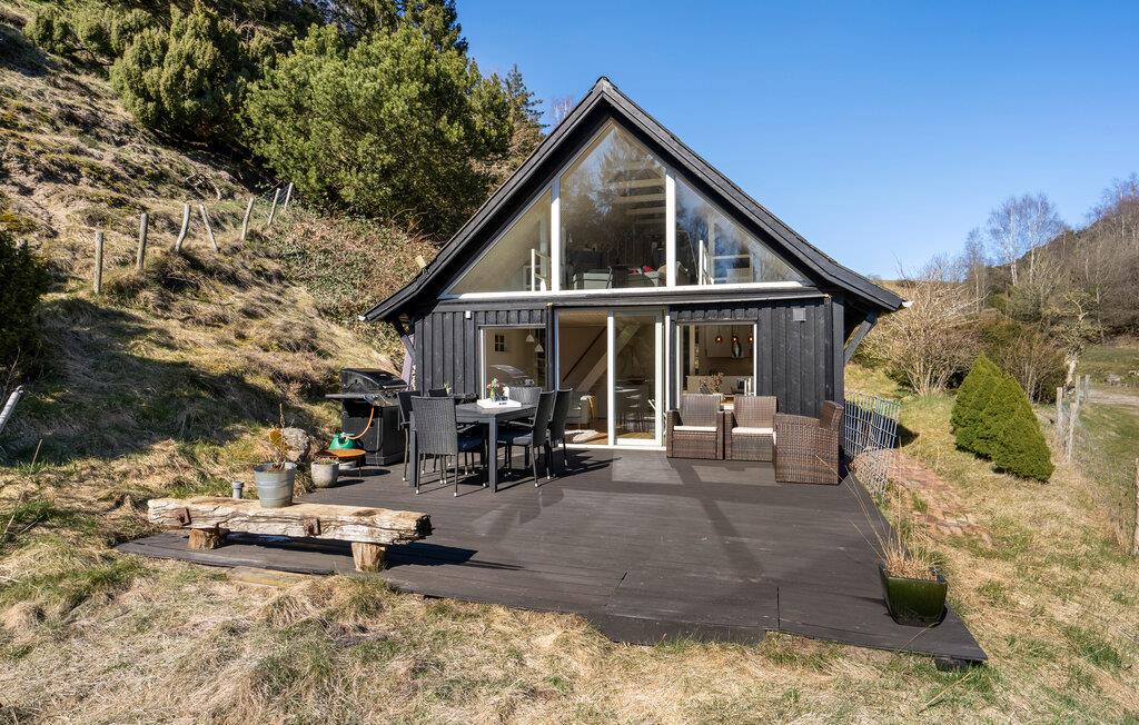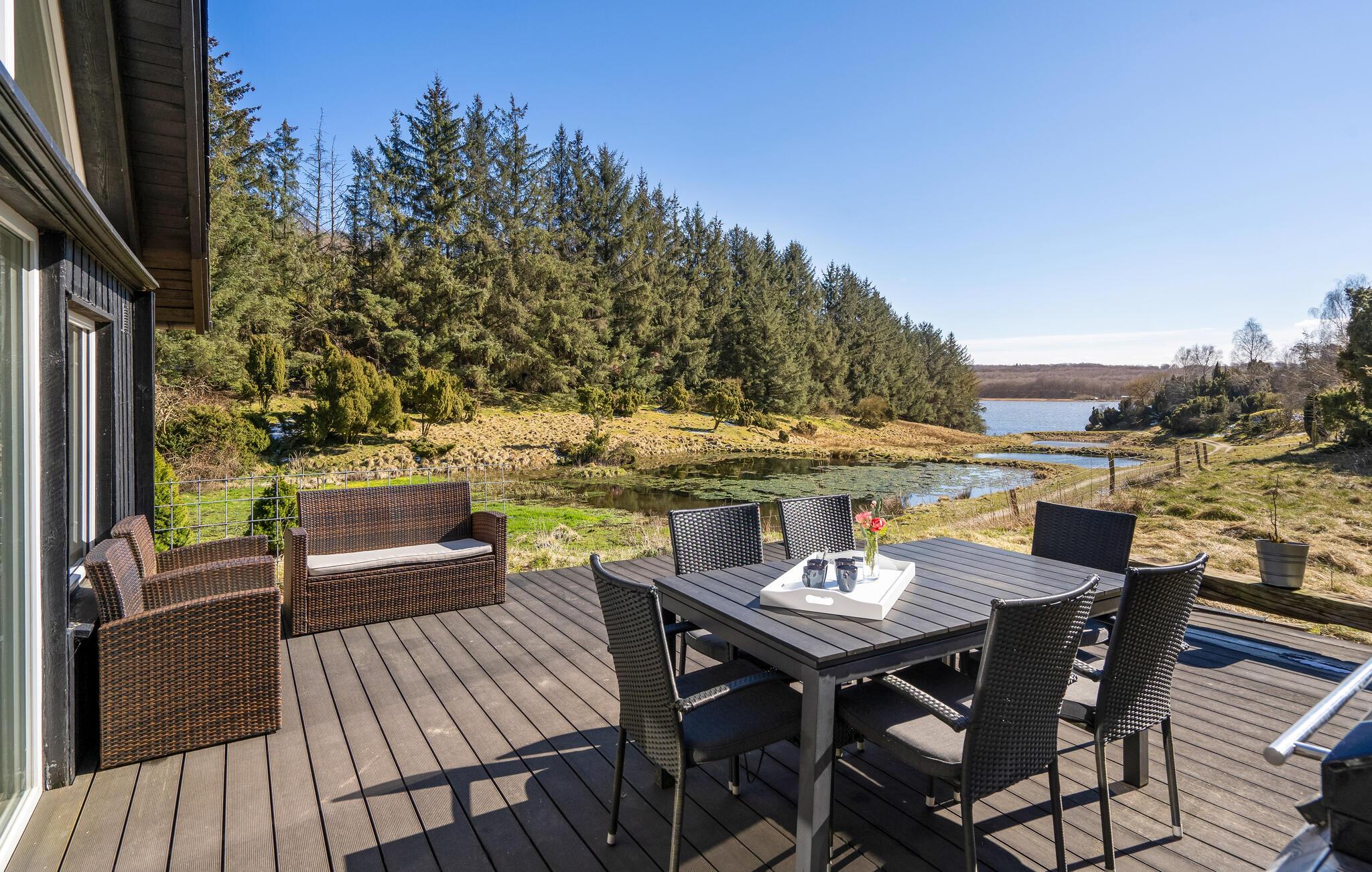 En beliggenhed som denne ses sjældent. Huset ligger idyllisk indlejret i fjordlandskabet på en lille, vindbeskyttet skråning med udsigt over vandet. Dette hus indbyder til en afslappende ferie i fuldstændig harmoni med naturen. Træd ud af døren, og I har de smukkeste omgivelser at gå lange ture i og et af landets bedste farvande til fiskeri. Der er også en golfbane få hundrede meter fra huset.