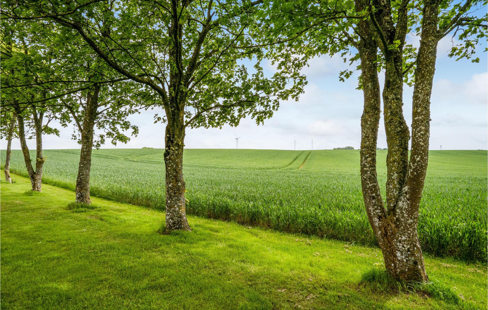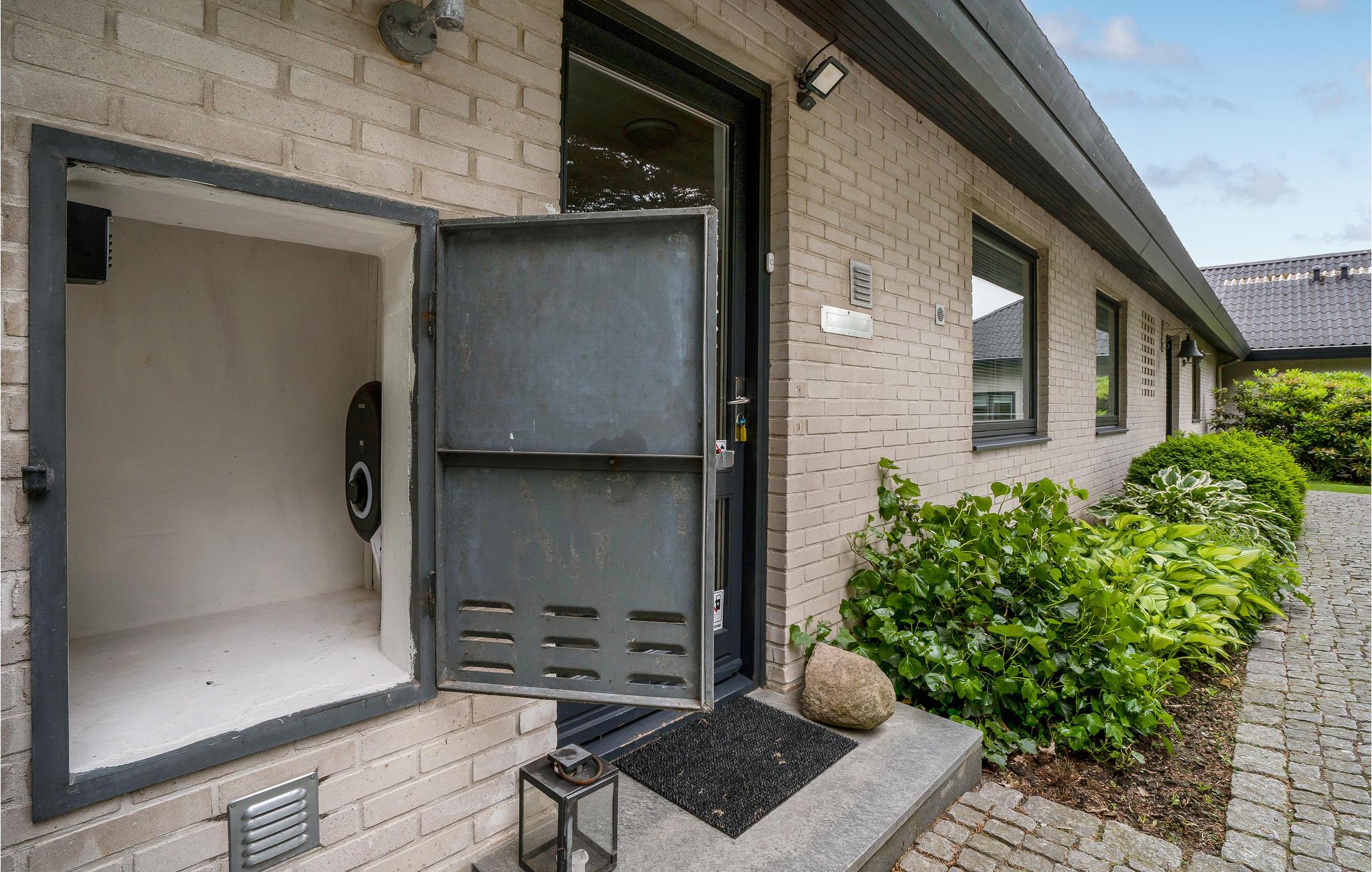 Huset har flere udgange til den åbne terrasse, der har en dejlig udsigt over landskabet. På terrassen står en stor grill samt gode havemøbler til alle gæster, og markisen kan køres ud efter behov. På den store græsplæne er der god plads til boldspil og udeaktiviteter.