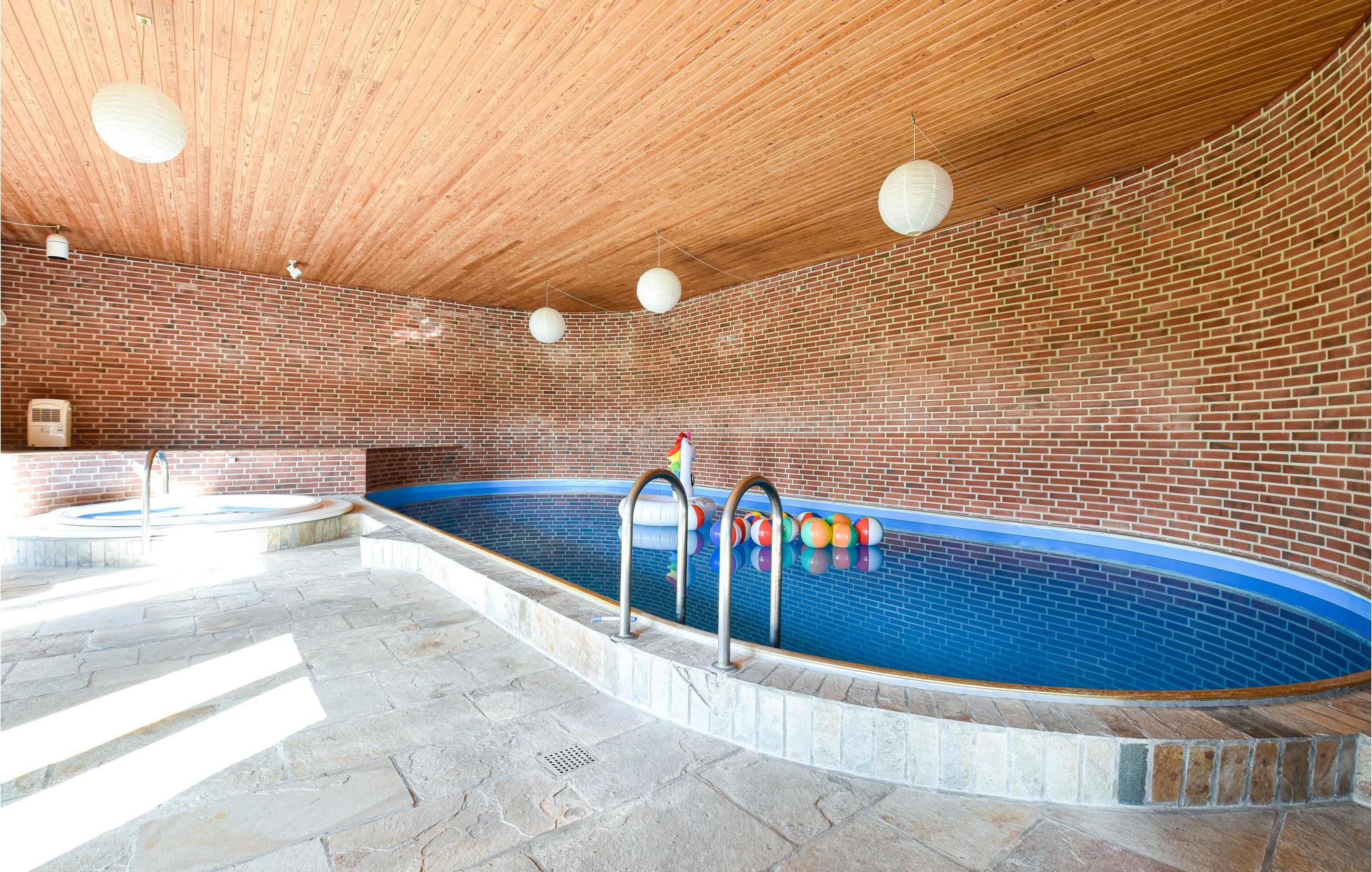 Denne unikke, store og arkitekttegnede feriebolig ligger landligt kun 3 km udenfor Holstebro. Her har I idyllen fra landet og samtidig byens muligheder lige rundt om hjørnet. Huset, med sine imponerende 550 m², danner perfekte rammer for den helt store aktive familieferie. Huset har en kæmpestor swimmingpoolafdeling med en intet mindre end 40 m² stor, oval swimmingpool, standvandsspa til 8 personer og en meget rummelig sauna. Der er omklædningsrum med bruser og et badeværelse tilknyttet poolrummet.