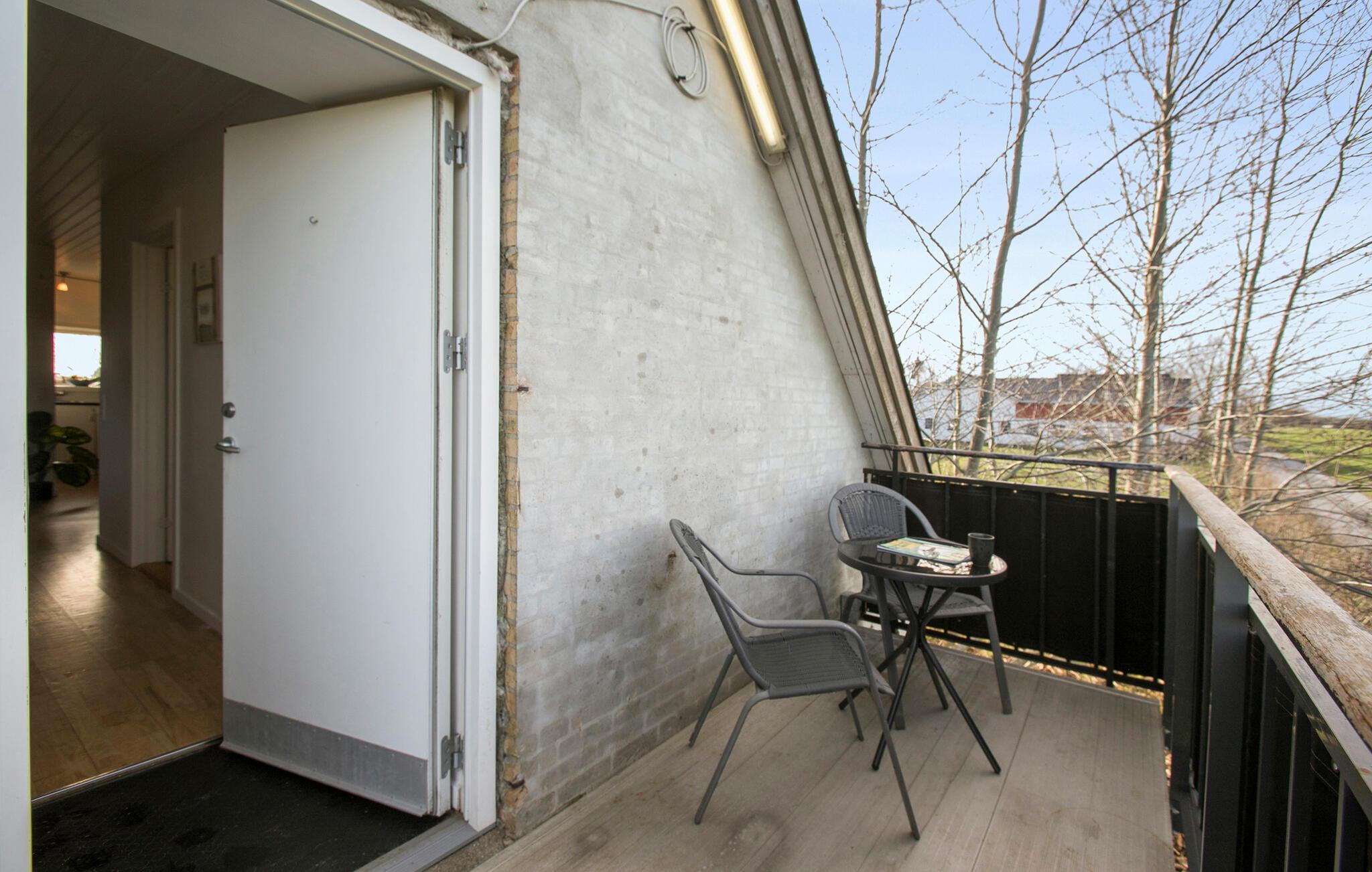 Hyggelig ferielejlighed på første sal i Dalmose med åben planløsning og altan, perfekt til fredelige dage på landet.