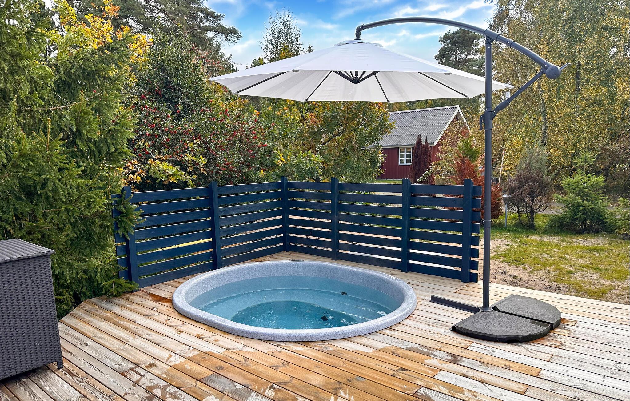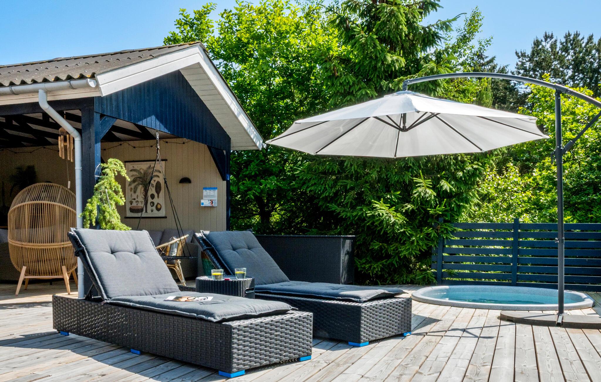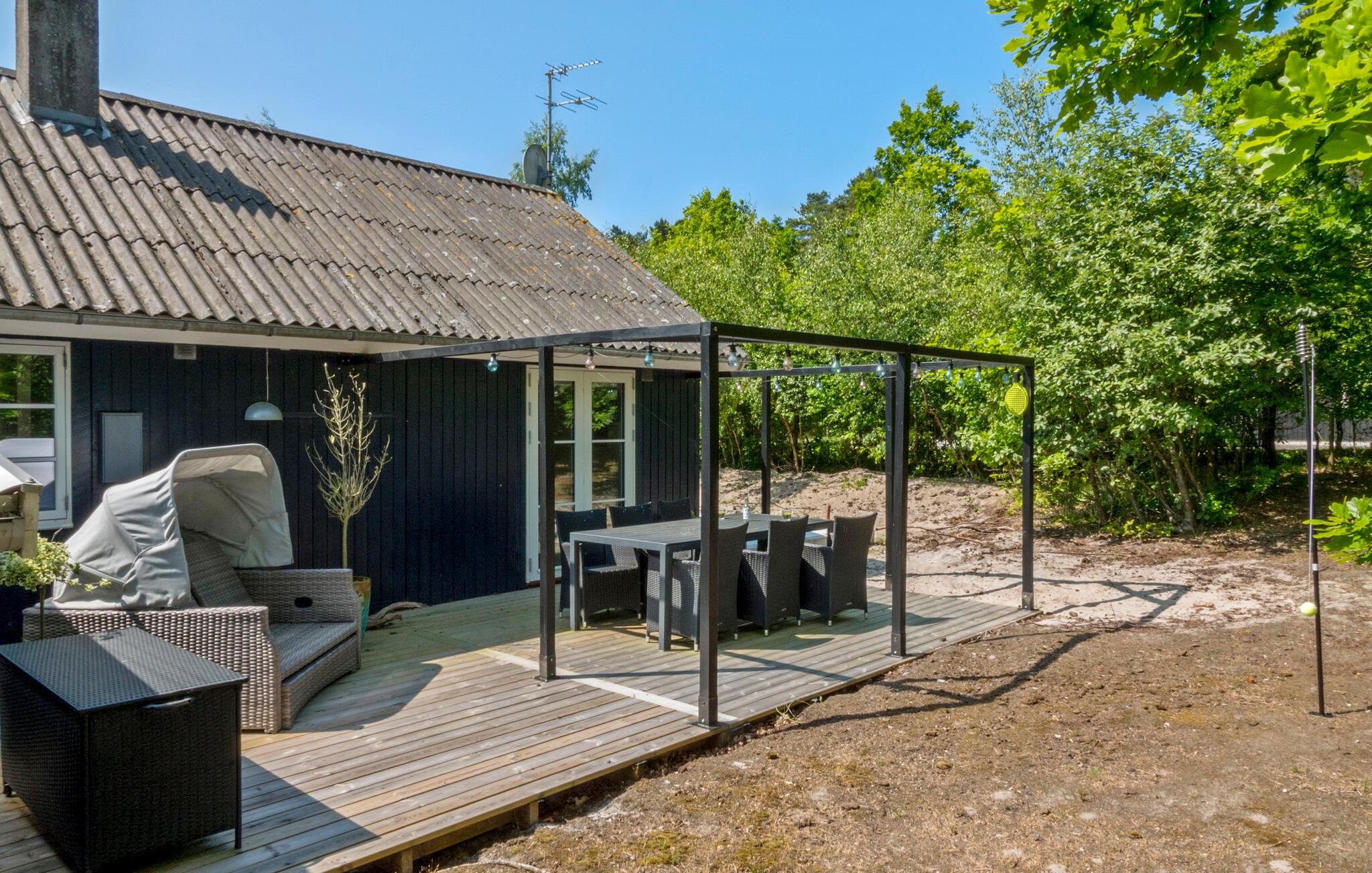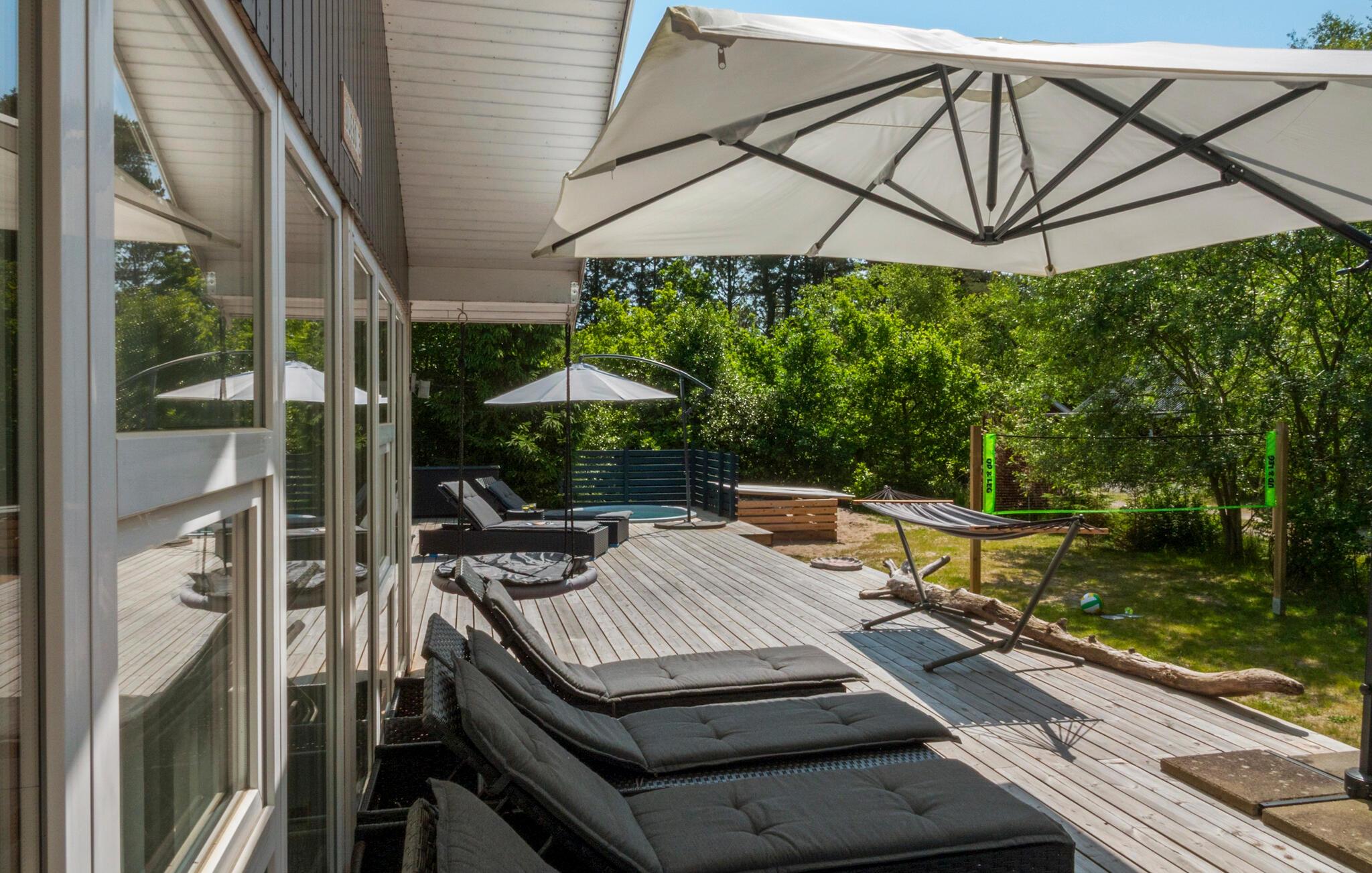 Huset har tre terrasser. Den ene vender mod øst, hvor I stille og roligt kan nyde morgensolen med en god kop kaffe og friskbagte rundstykker. Der er en stor sydvendt terrasse med mange flotte havemøbler samt en hyggelig overdækket terrasse med udekøkken og loungemøbler. På de varme dage kan I bage en lækker pizza i udekøkkenet, ligesom I kan grille en lækker frokost og bare nyde solen, naturen og den friske luft. På terrassen finder I en udendørs bruser med koldt og varmt vand og en opvarmet terrassepool med luftdyser og belysning. Om aftenen kan I samles om den sagte ild på bålpladsen og bage snobrød. Bag huset mod nord er den tredje terrasse med havebord og loungesofa. Lad børnene gå på opdagelse på den store naturgrund, hvor de kan boltre sig med de gode legeredskaber som legetårn, gynger og sandkasse.
