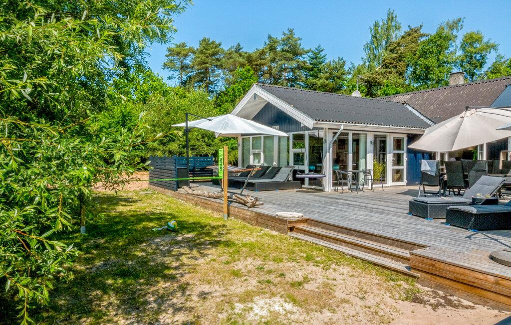 Hyggeligt og moderne sommerhus ved stranden med aktiviteter, terrassepool og udekøkken for en perfekt familieferie.