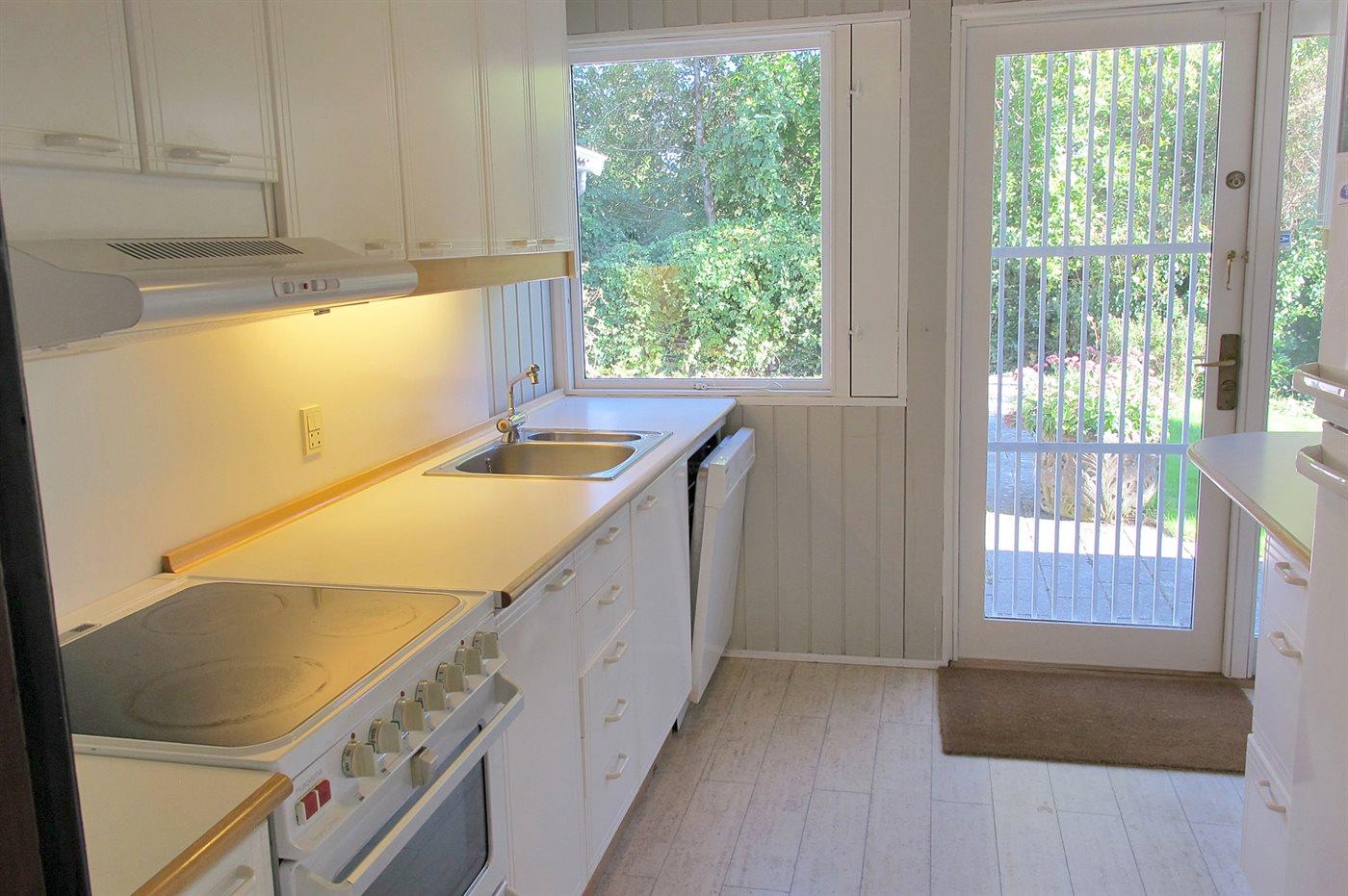 Køkkenet er udstyret med 1 køleskab. Der er 4 keramiske kogeplader, varmluftovn samt opvaskemaskine.