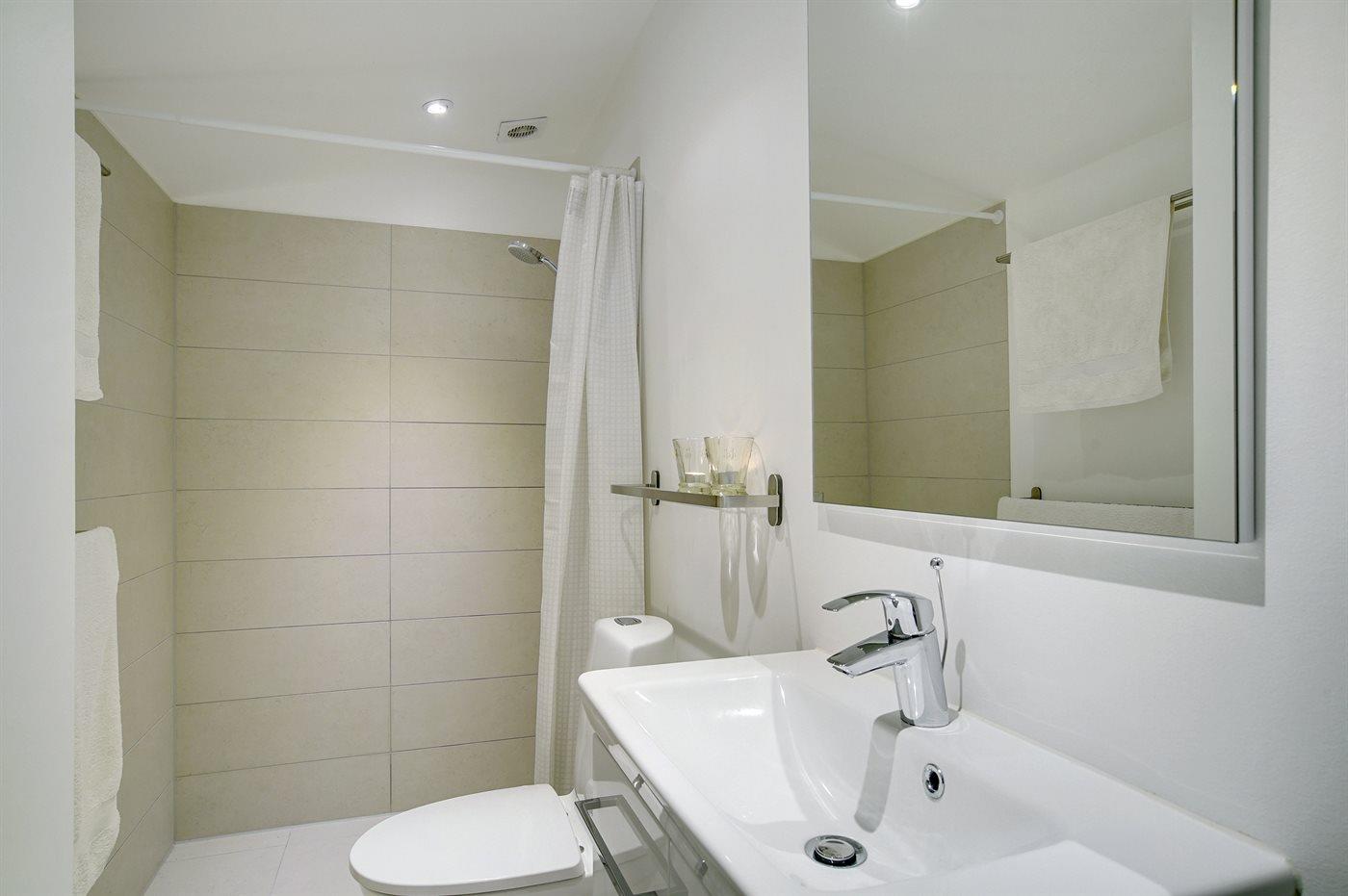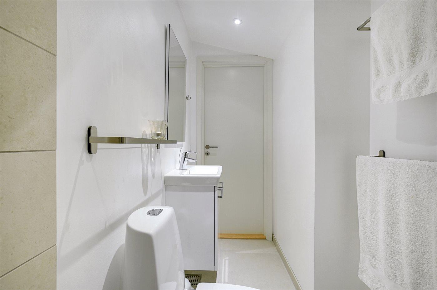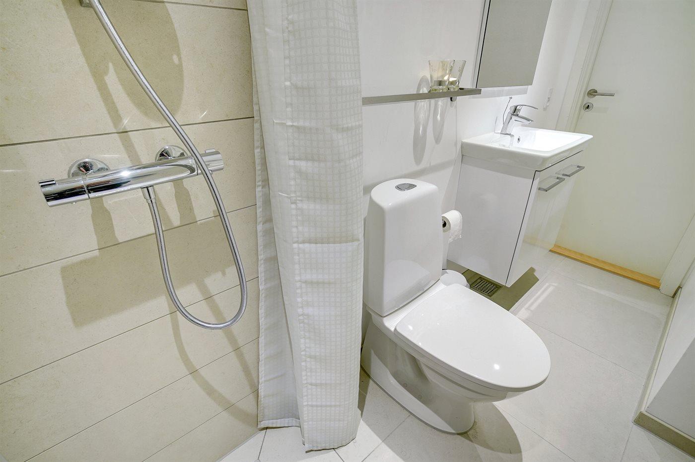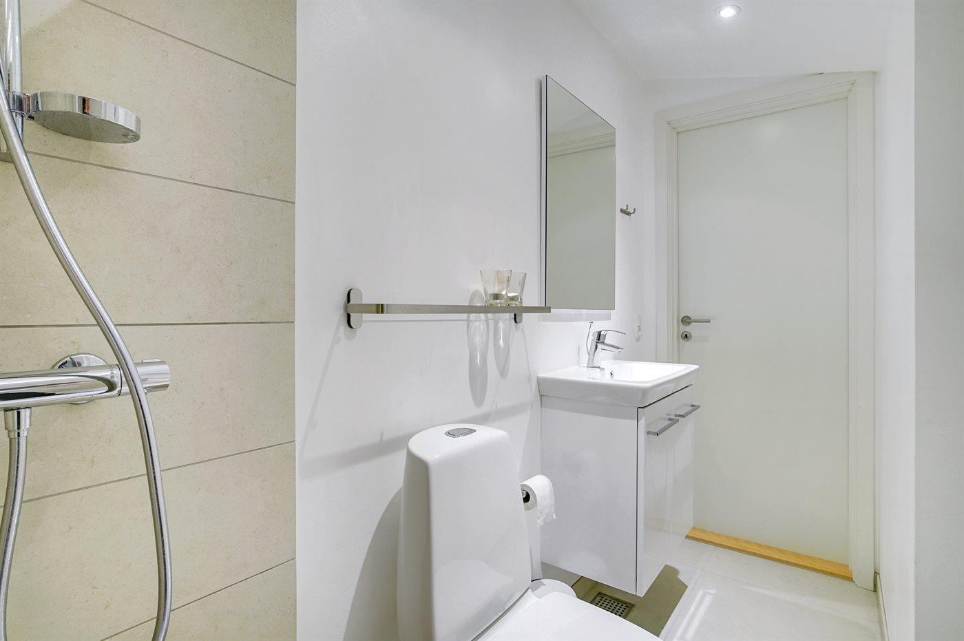 Der er 2 badeværelser med bruseniche og 2 toiletter. Der er gulvvarme på 1 badeværelse.
