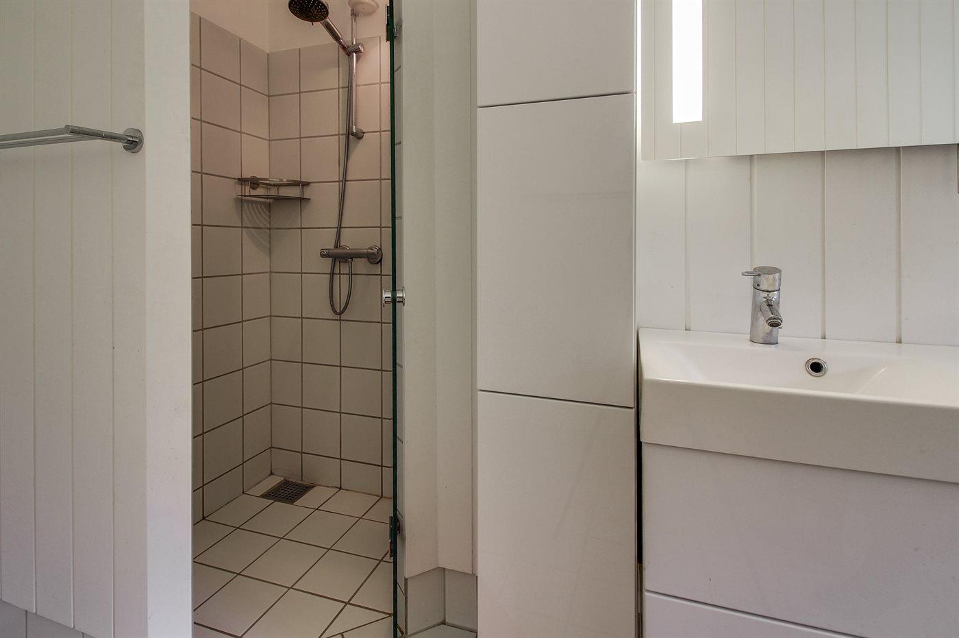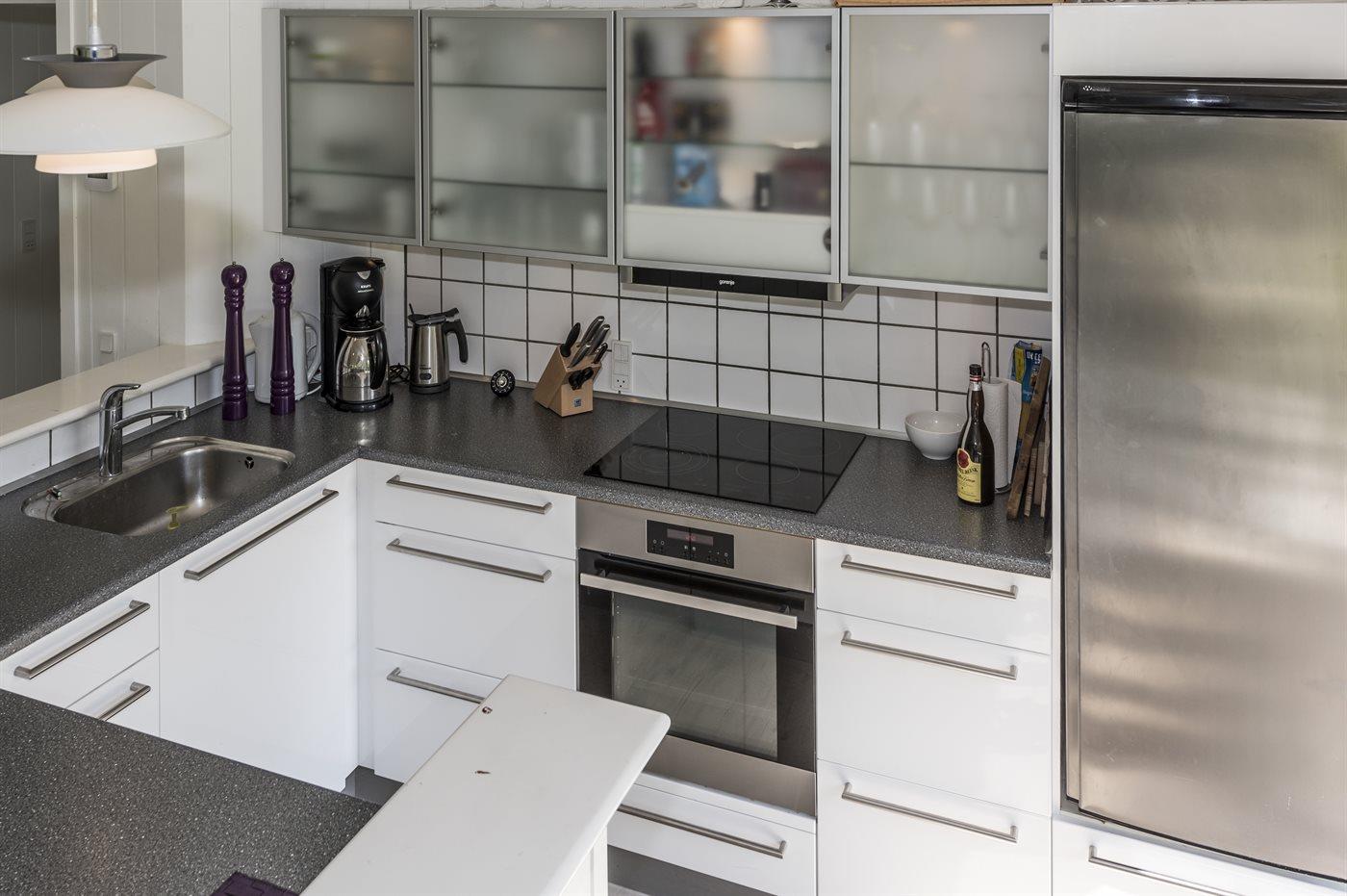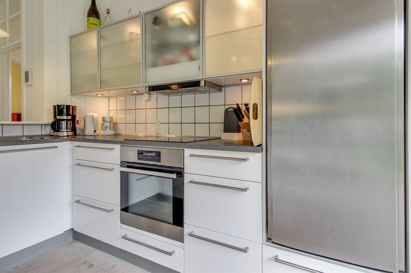 Køkkenet er udstyret med 2 køleskabe. Der er 4 keramiske kogeplader, varmluftovn, mikrobølgeovn samt opvaskemaskine. Der er 1 badeværelse med bruseniche og 1 toilet. Der er gulvvarme på 1 badeværelse.