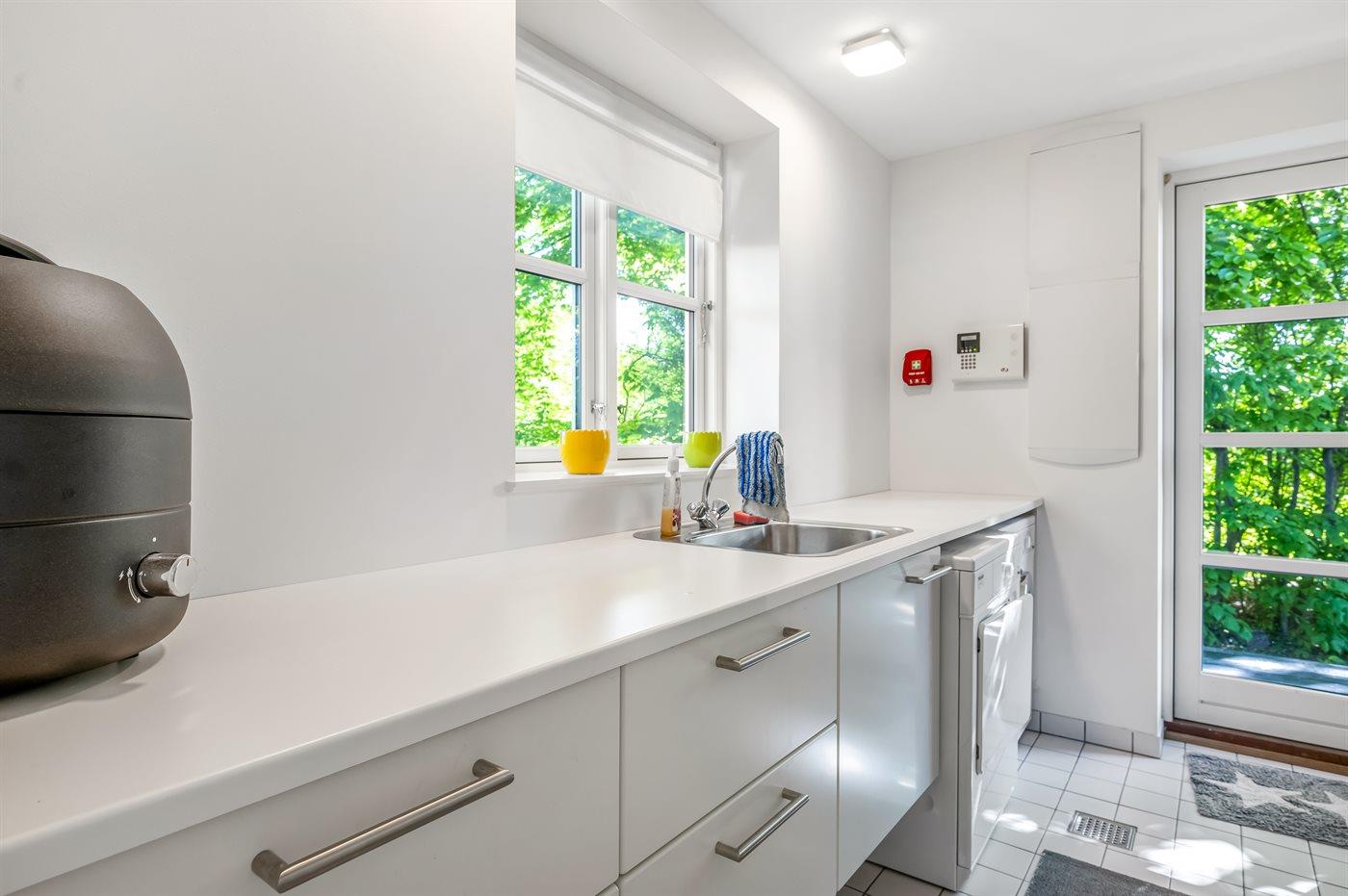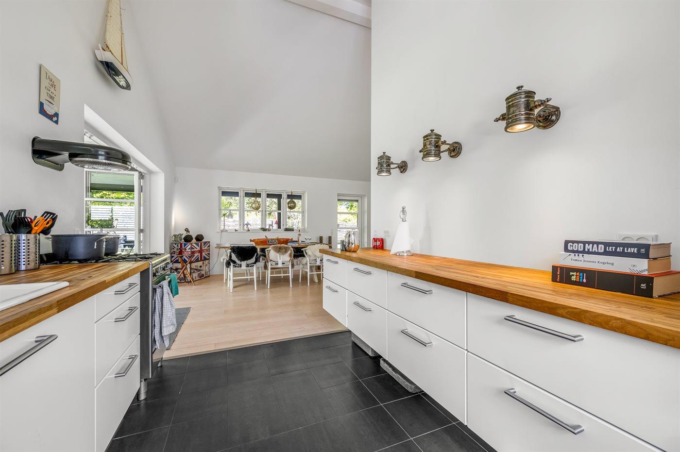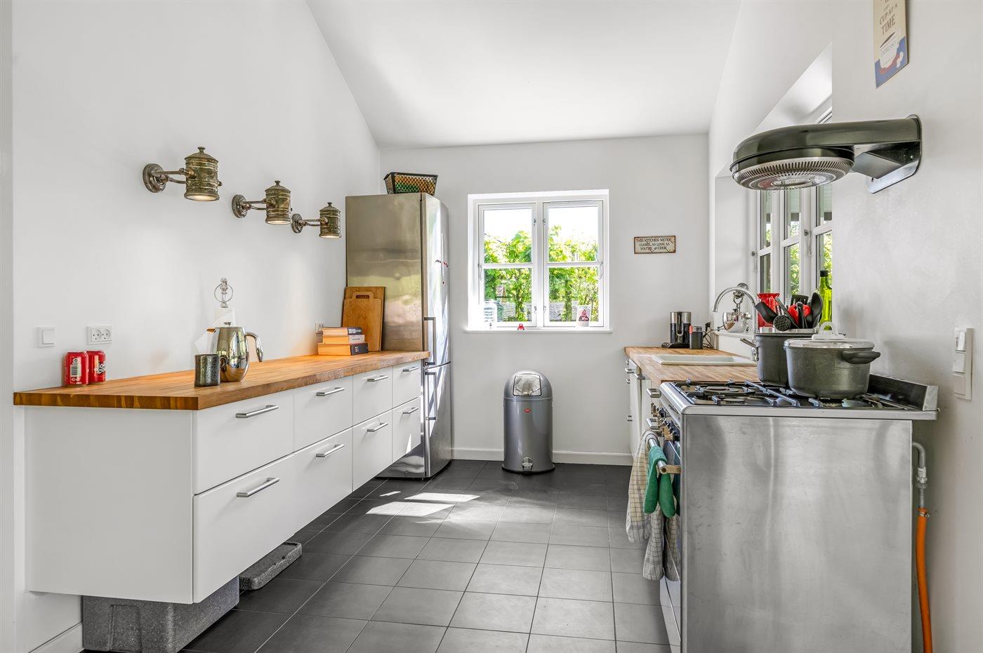 Køkkenet er udstyret med 1 køleskab. Der er 4 gasblus, varmluftovn samt opvaskemaskine.