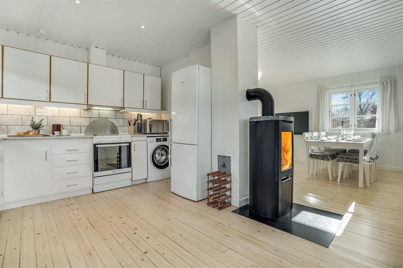 Køkkenet er udstyret med 1 køleskab. Der er 4 keramiske kogeplader, varmluftovn samt opvaskemaskine.