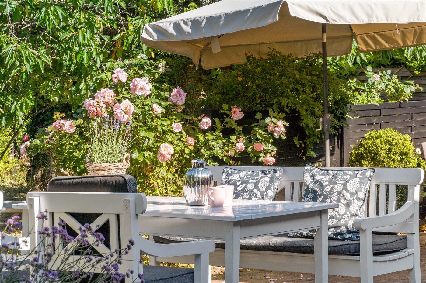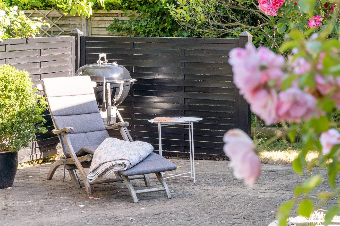 Charmerende sommerhus i Hornbæk med sort facade, hyggelig terrasse og kort afstand til strand og byliv.