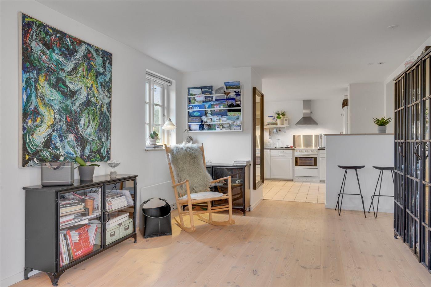 Køkkenet er udstyret med 1 køleskab. Der er 4 keramiske kogeplader, varmluftovn, mikrobølgeovn samt opvaskemaskine.