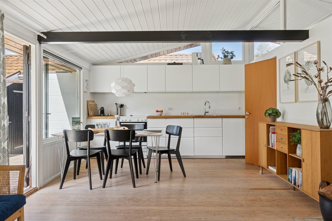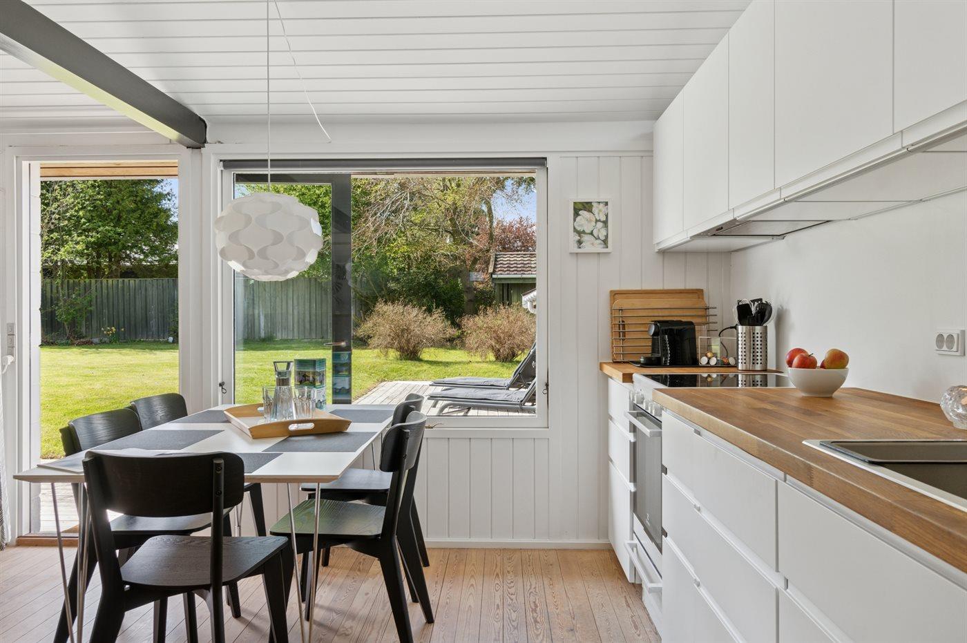 Køkkenet er udstyret med 1 køleskab. Der er 4 keramiske kogeplader, varmluftovn samt opvaskemaskine.