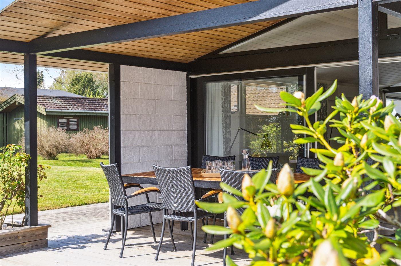 Dejligt sommerhus med køkken/alrum og udgang til skønt terrasseområde, både åbent og overdækket med havemøbler og udsigt over grunden med rig mulighed for sol, skygge, afslapning og madlavning på gasgrillen.