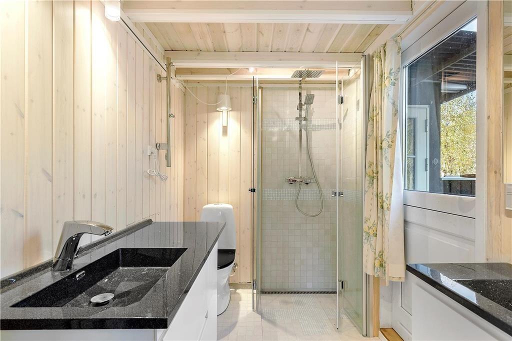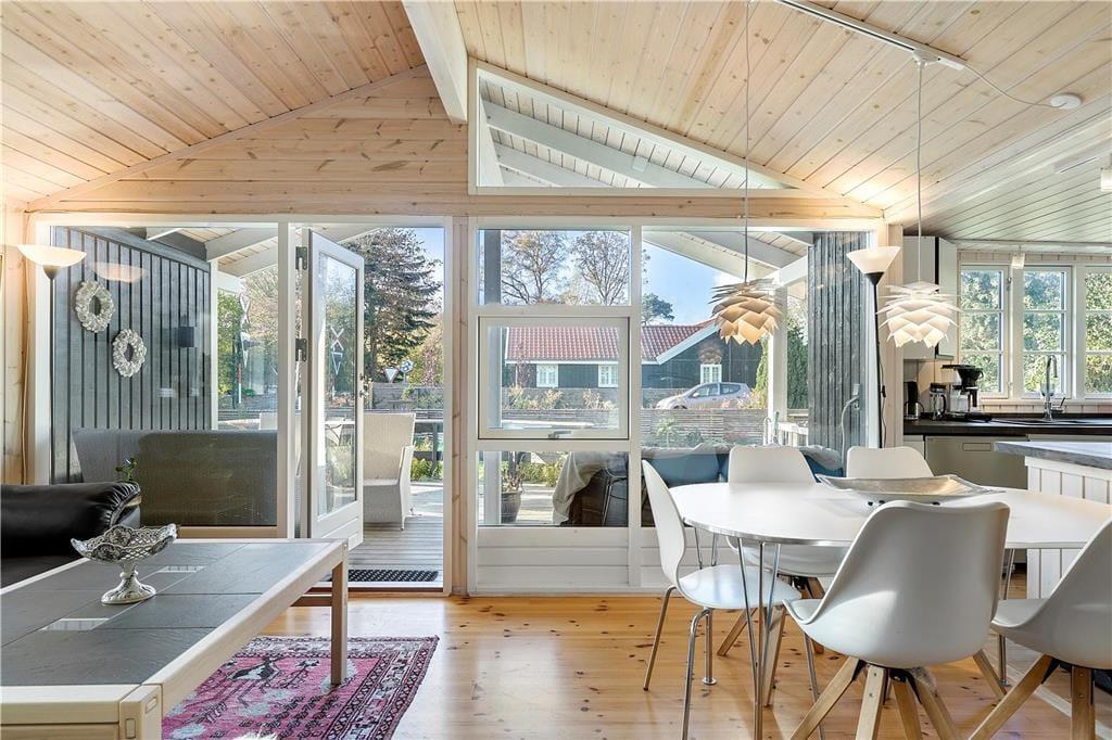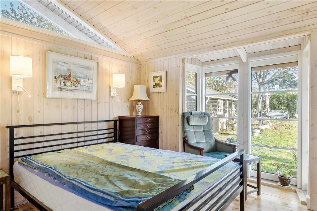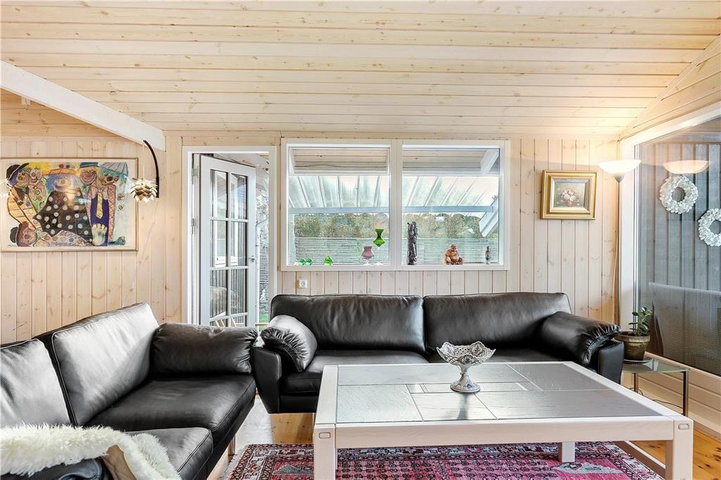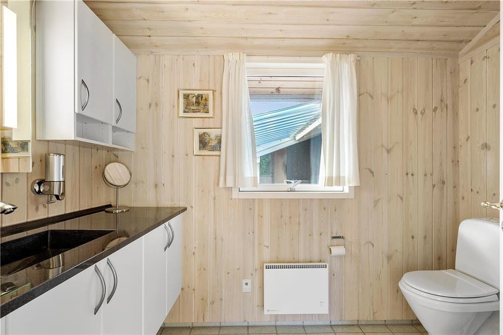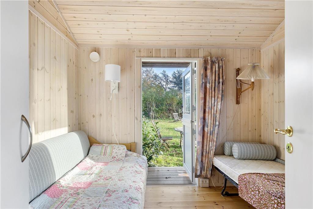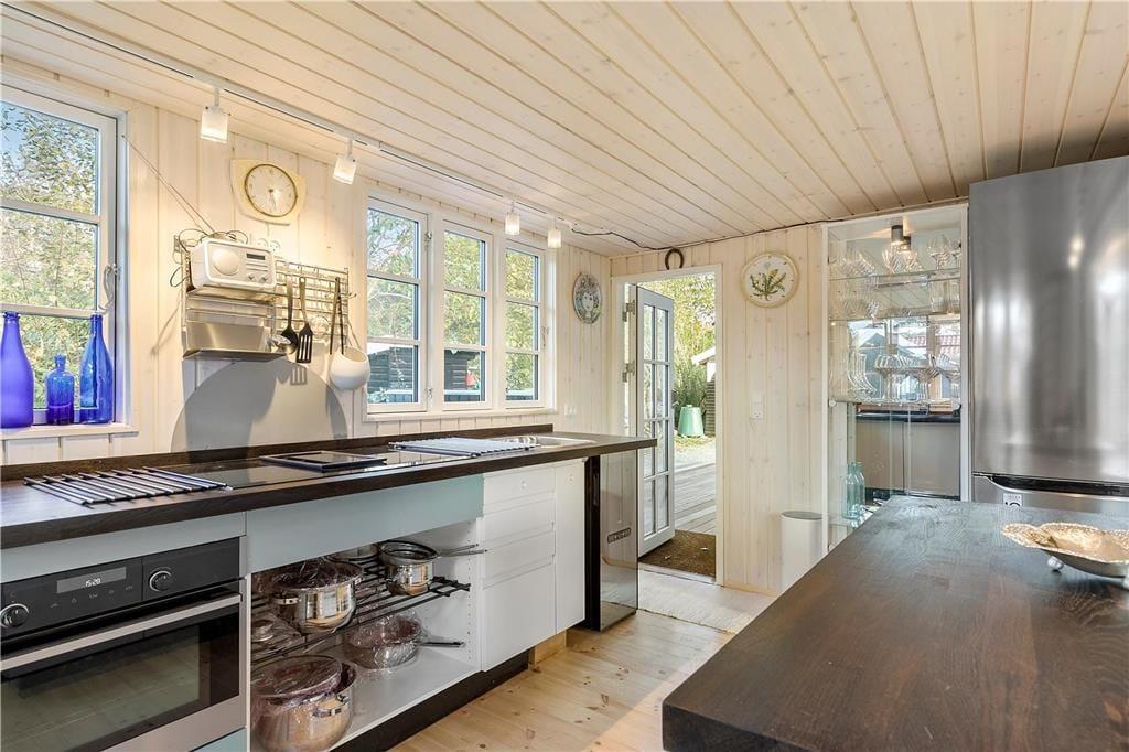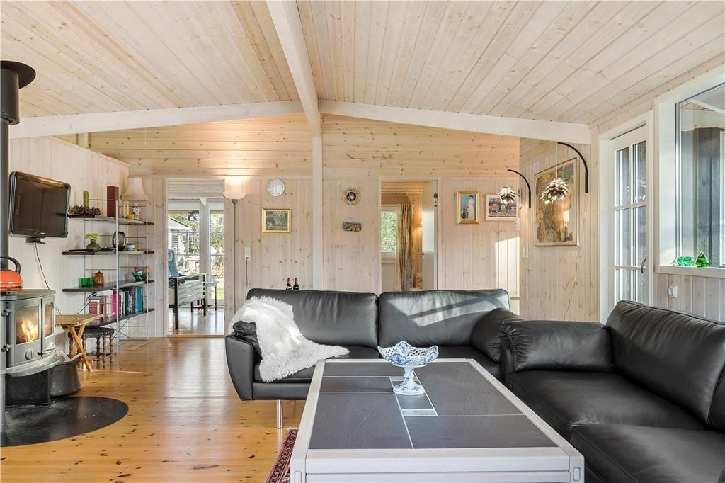 Når du træder ind i sommerhuset, mødes du af et lyst og åbent køkken, der er fuldt udstyret med alt, hvad du behøver for at tilberede lækre måltider. Køkkenet er i åben forbindelse med opholdsstuen, hvor komfortable siddepladser foran brændeovnen indbyder til hyggelige aftener med brætspil efter en dag på stranden. Huset rummer tre soveværelser, der sikrer gode sovepladser til hele familien, samt to badeværelser, hvilket giver ekstra komfort under opholdet.