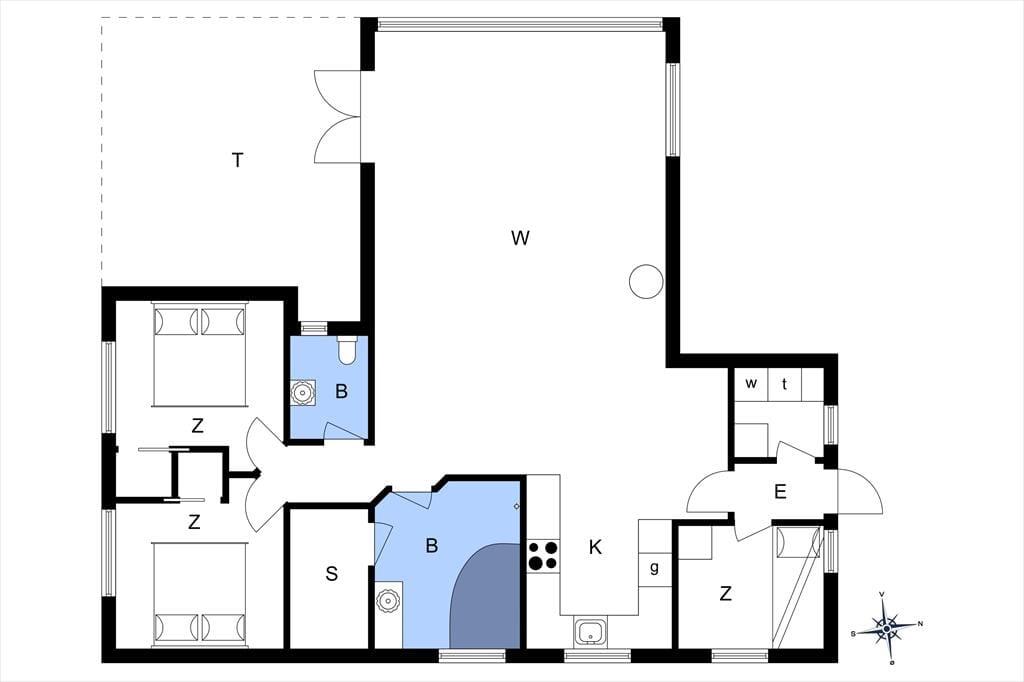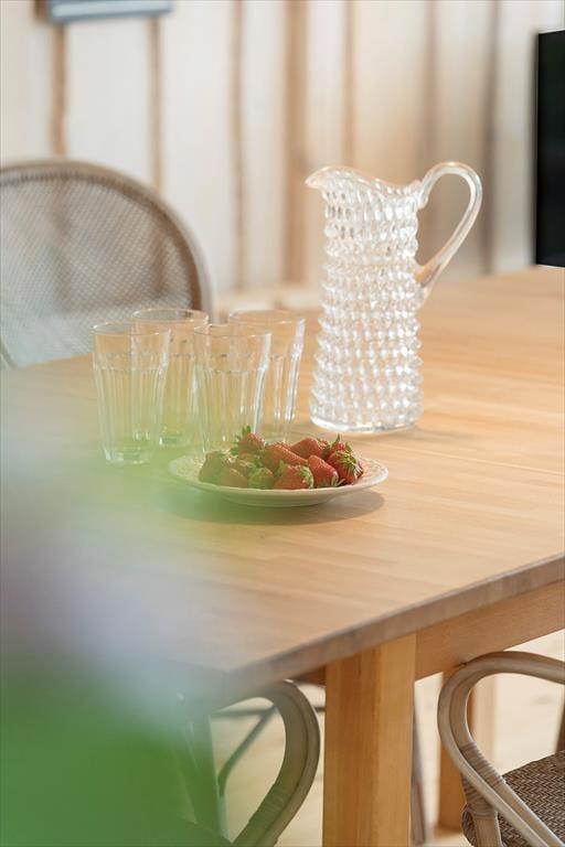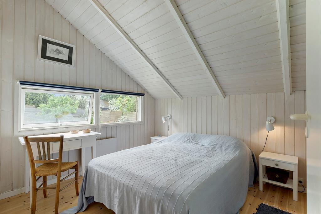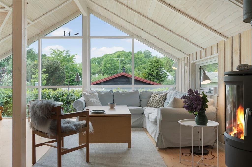 Når du træder ind i sommerhuset, mødes du af en lys og venlig atmosfære, hvor store vinduespartier inviterer naturen helt tæt på. I den rummelige opholdsstue kan du samle familien til hyggelige stunder – uanset om det er over en god middag, en brætspilsaften eller blot til afslapning foran brændeovnen, mens flammerne knitrer og spreder varme. Køkkenet ligger i åben forbindelse med stuen, så det er nemt at være sammen, også når måltiderne tilberedes. Husets soveværelser giver jer hver især mulighed for at finde ro, når dagen går på hæld, og i badeværelset er der god plads til hverdagens rutiner og et bad efter en tur på stranden.