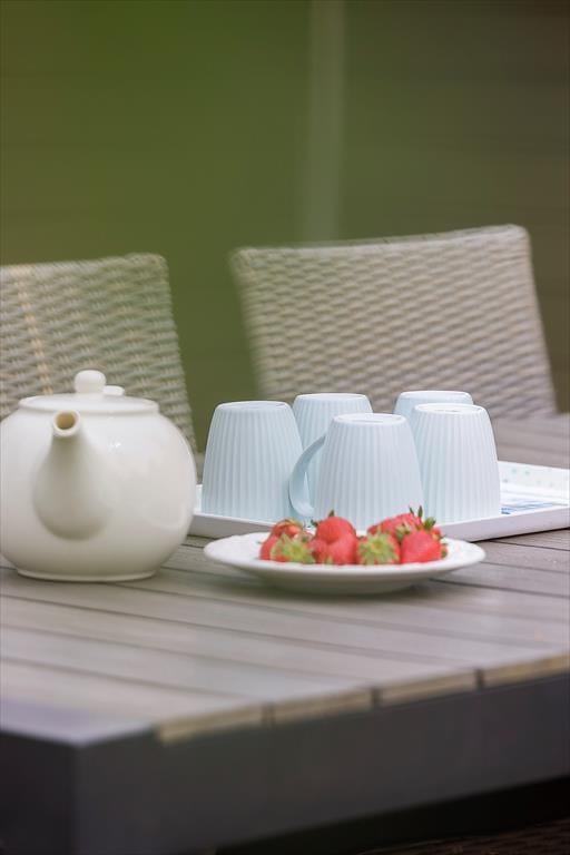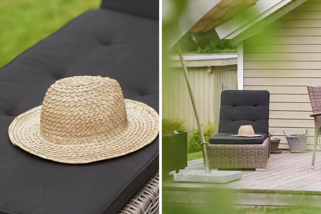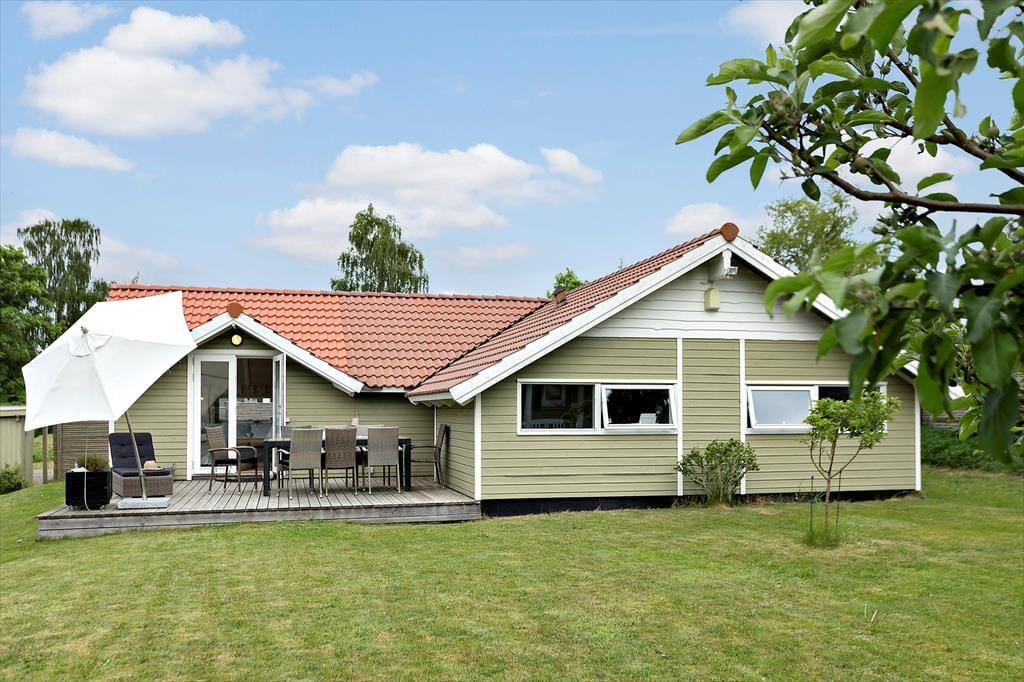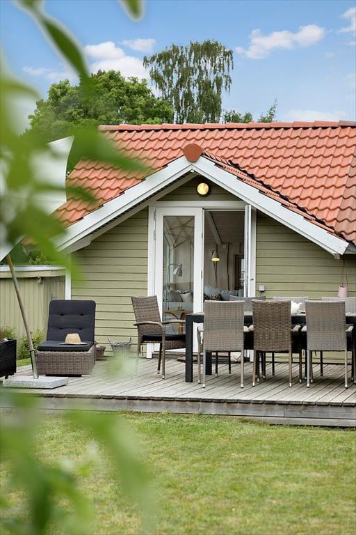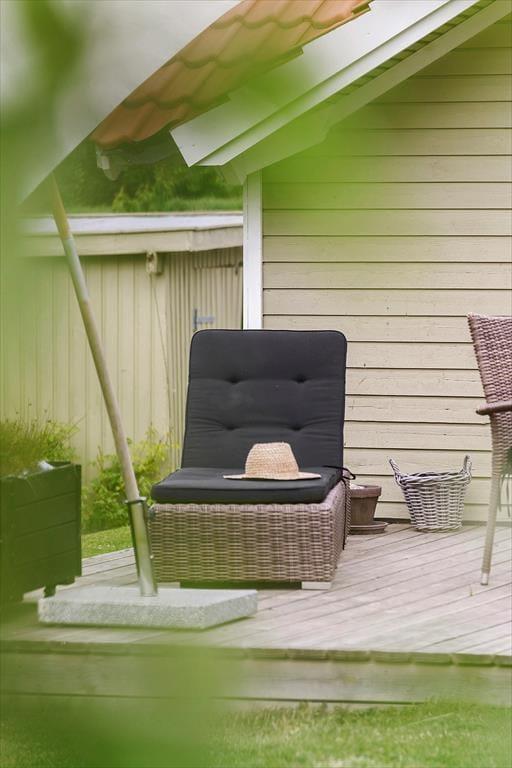 Udenfor byder sommerhuset på en dejlig have og en solrig terrasse, der indbyder til afslapning dagen lang. Her kan du begynde morgenen med en kop kaffe under de første solstråler, nyde eftermiddagens fuglesang eller samle familien til grillmiddag, når aftenen falder på. Haven er et skønt sted for både leg og afslapning – omgivet af grønne træer, der skaber en naturlig ramme om ferielivet. Når mørket sænker sig, er det oplagt at blive siddende ude og betragte den stjerneklare himmel, mens du mærker roen brede sig.
