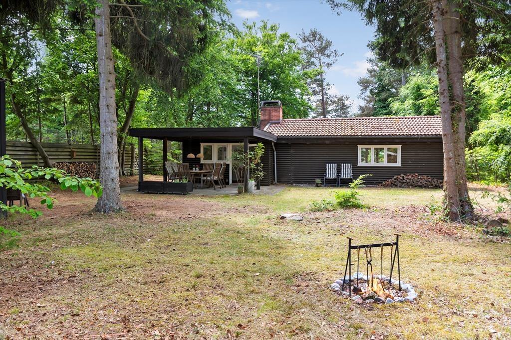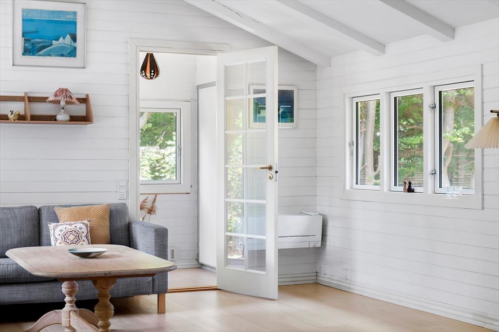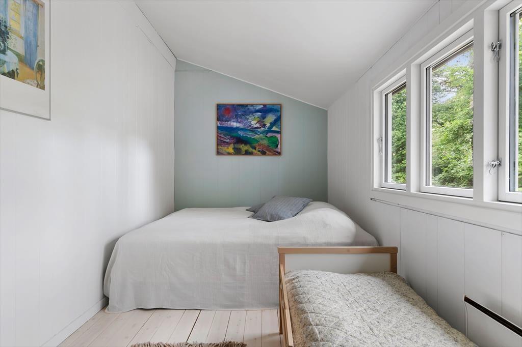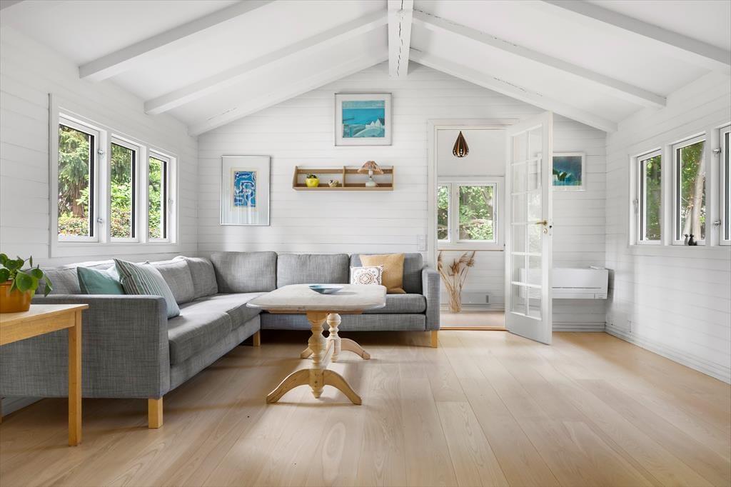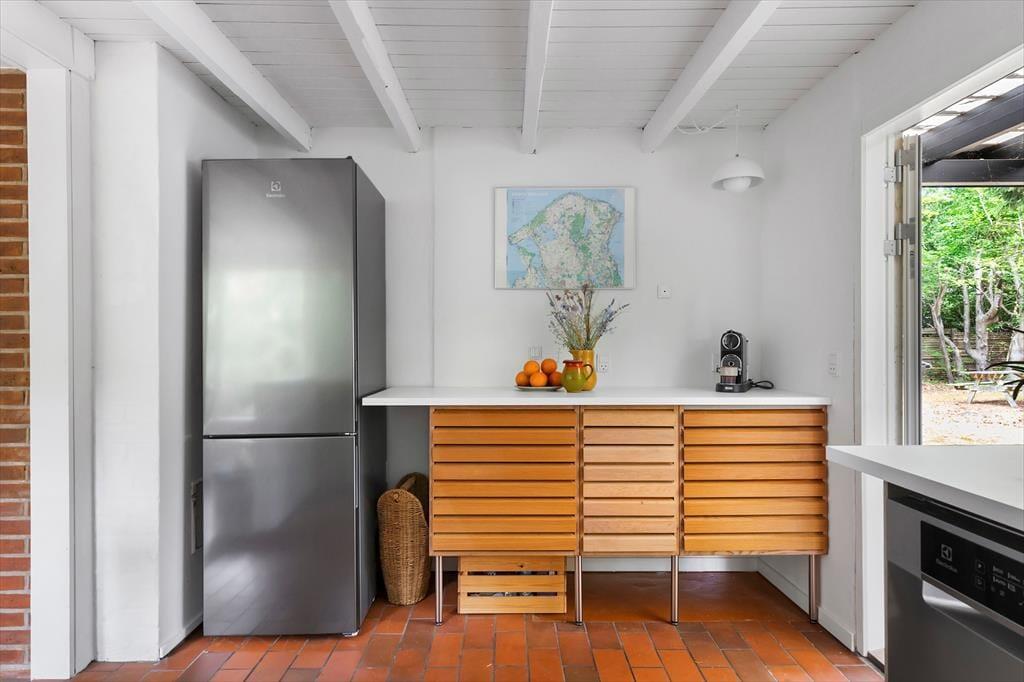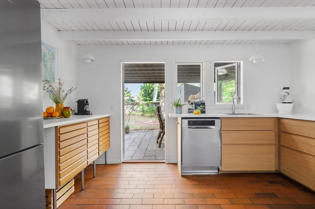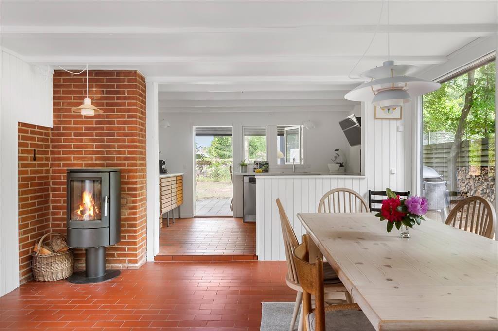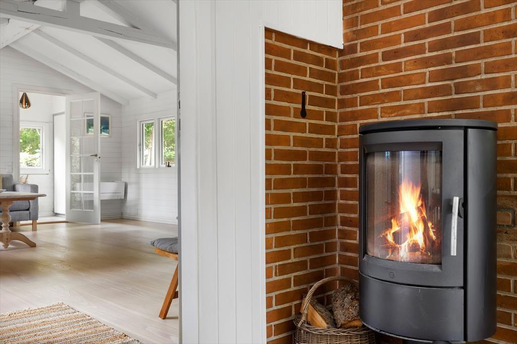 Det første, du møder, er en indretning, der stråler af sommerstemning og varme. Det åbne køkken og den lyse spisestue hænger naturligt sammen og skaber en indbydende ramme om både madlavning og måltider med familien. Store vinduespartier og udgang til terrassen trækker lyset helt ind i rummet, og brændeovnen bidrager med både varme og hyggelig stemning på kølige dage. Her kan du nyde morgenkaffen med udsigt til haven, mens flammerne knitrer sagte i baggrunden. Det første, du møder, er en indretning, der stråler af sommerstemning og varme. Det åbne køkken og den lyse spisestue hænger naturligt sammen og skaber en indbydende ramme om både madlavning og måltider med familien. Store vinduespartier og udgang til terrassen trækker lyset helt ind i rummet, og brændeovnen bidrager med både varme og hyggelig stemning på kølige dage. I forlængelse af spisestuen finder du opholdsstuen, hvor komfortable møbler indbyder til afslapning. Her kan du smide benene op i sofaen og fordybe dig i en god bog eller blot lade dagens oplevelser falde på plads i ro og fred. Soveværelserne er indrettet med tanke på både komfort og funktionalitet – det ene med dobbeltseng og barneseng, og det andet med dobbeltseng. Indretningen er enkel og hjemlig – præcis som et klassisk dansk sommerhus skal være.