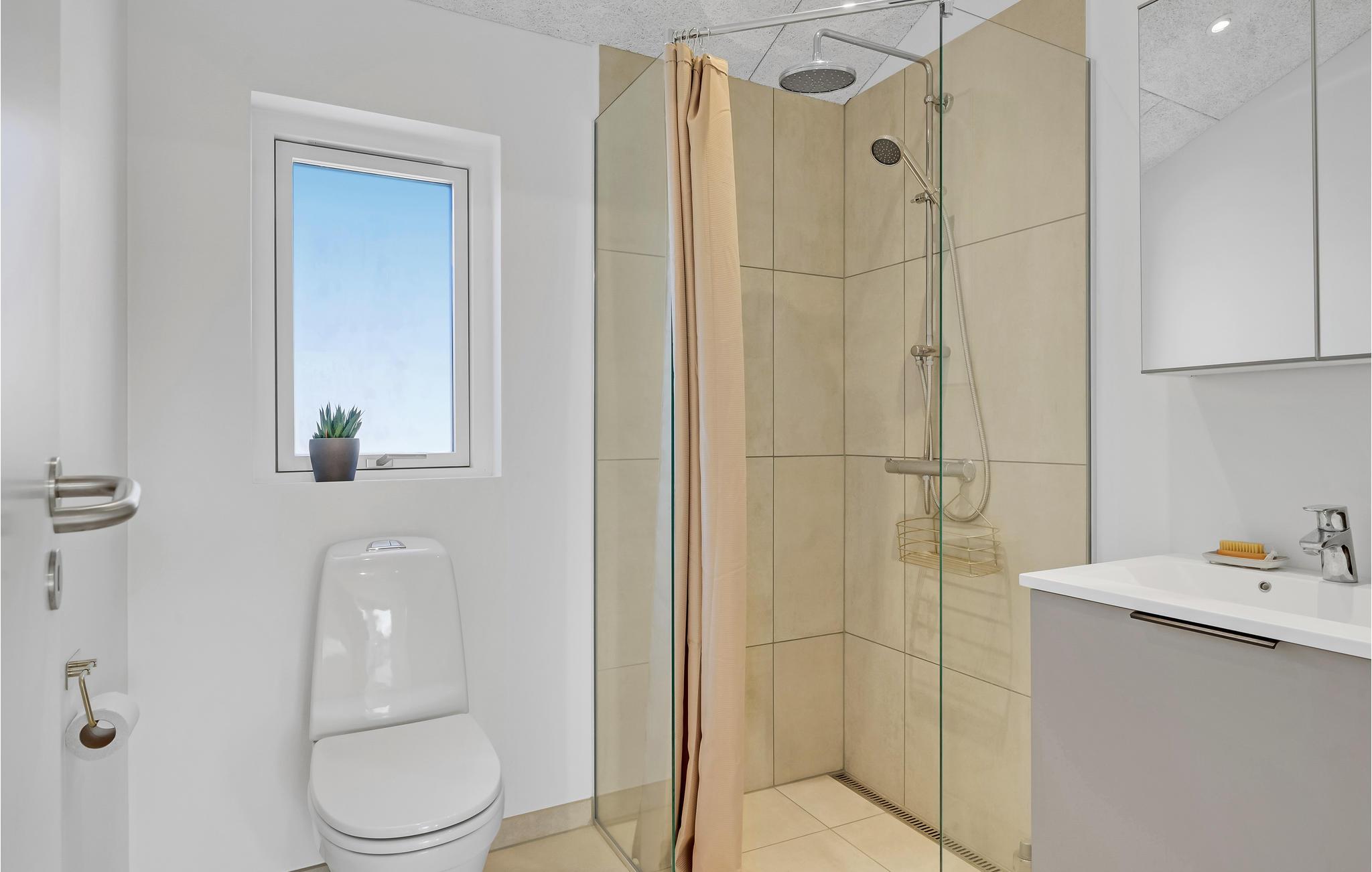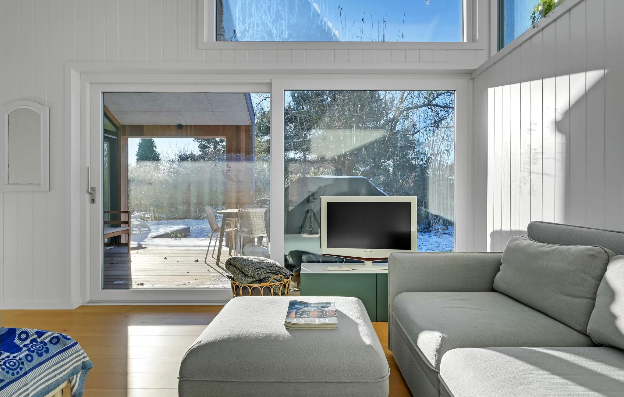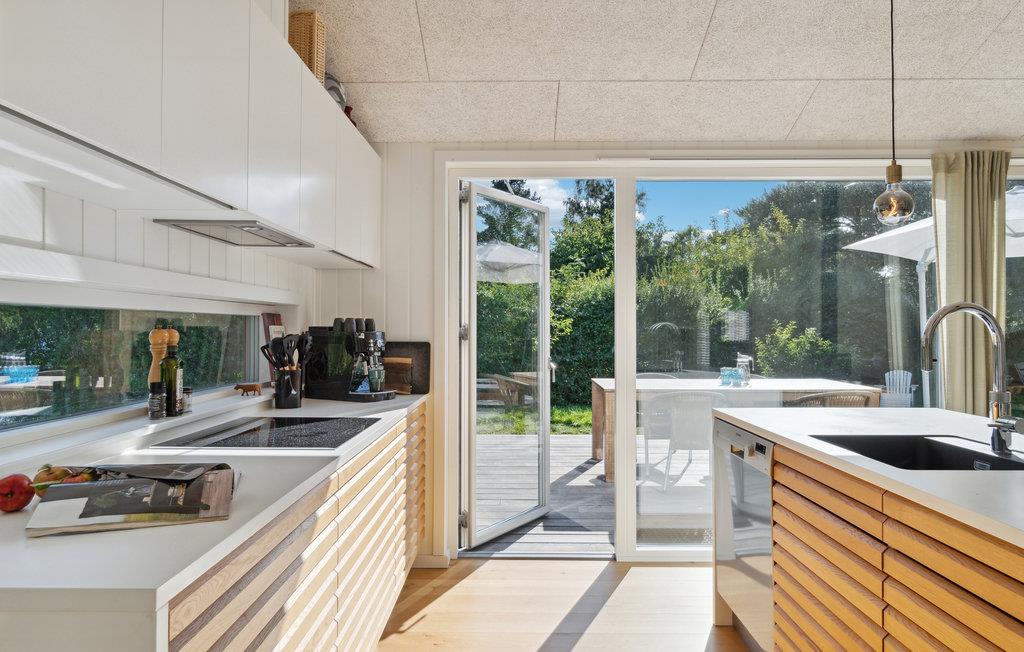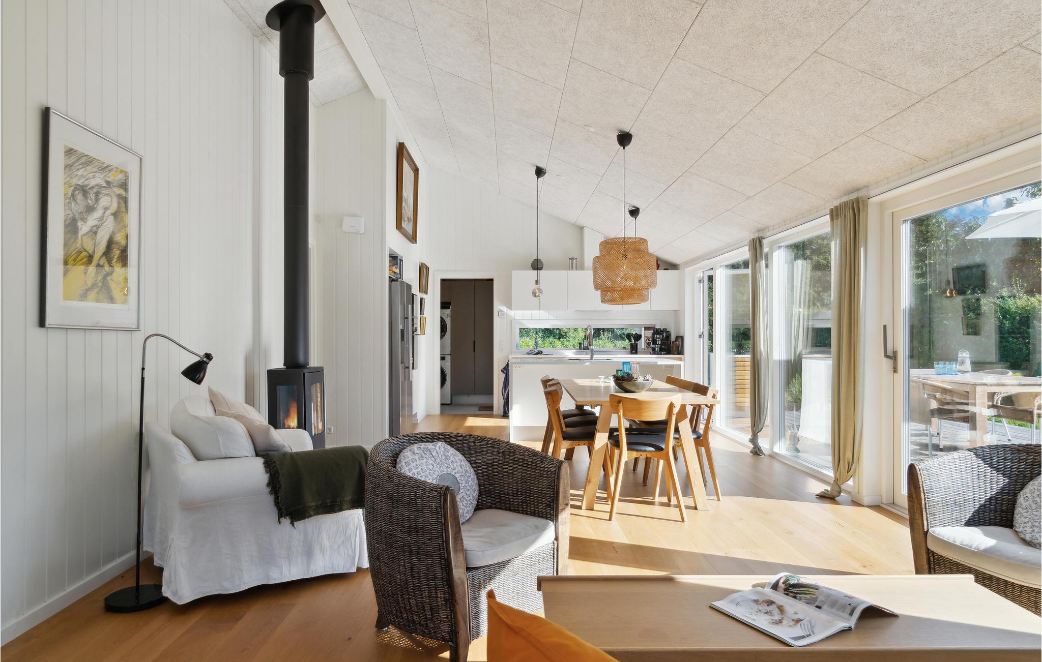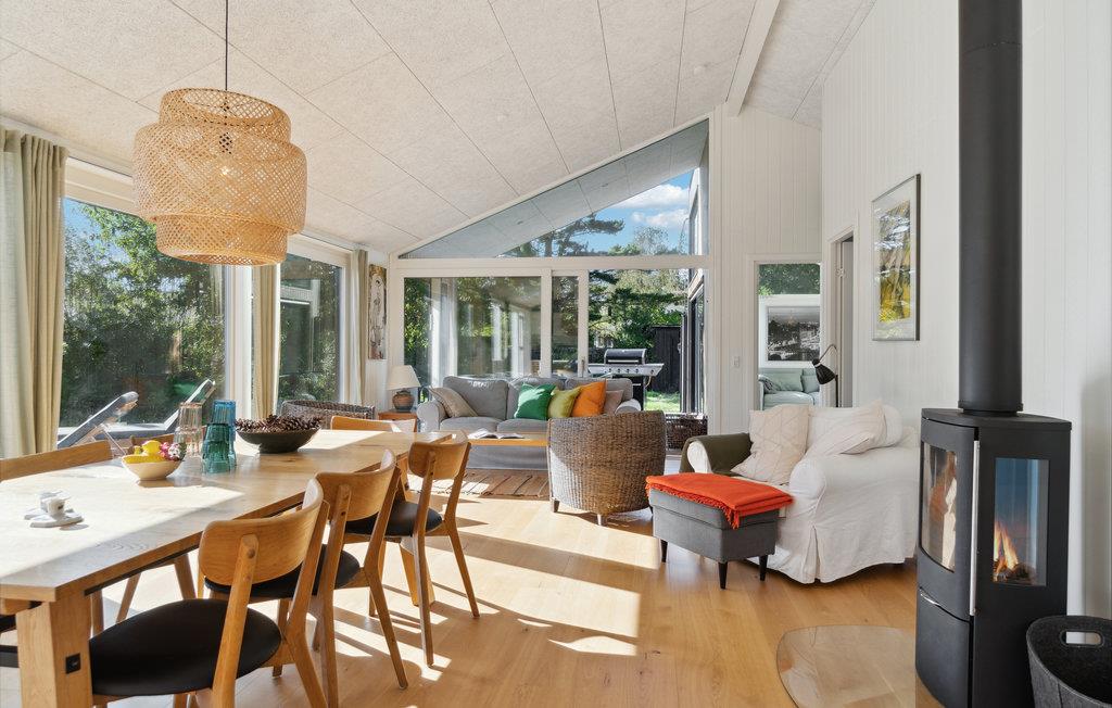 Velkommen til et fejende flot feriehus, som har alt til en ferie for den store familie. Her kan I se frem til lækre kvalitetsløsninger og dejlige opholdsrum. Det store køkken med amerikansk køleskab lægger op til hyggelige madlavningsaftener. Når I er færdige med at snitte og brase i køkkenet, kan I læne jer tilbage i sofaerne og spille brætspil, mens ilden knitrer i brændeovnen. Fra hele stuen er der en dejlig udsigt til haven, så de grønne omgivelser inviteres indenfor.