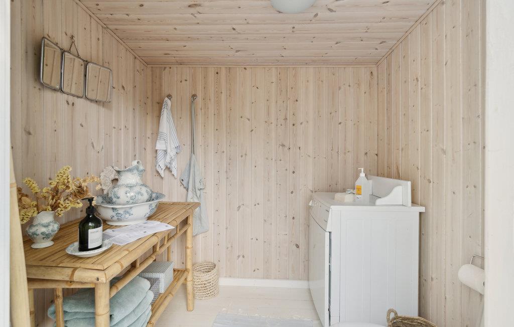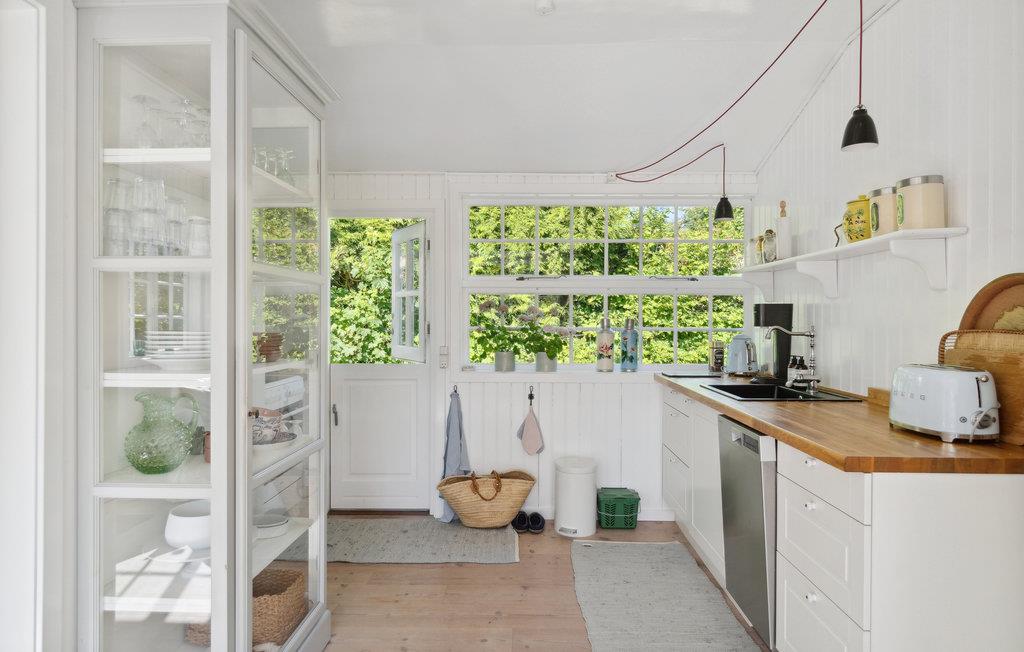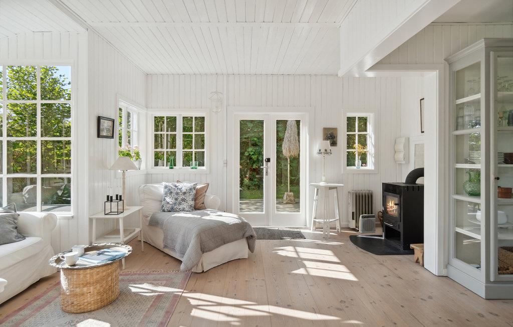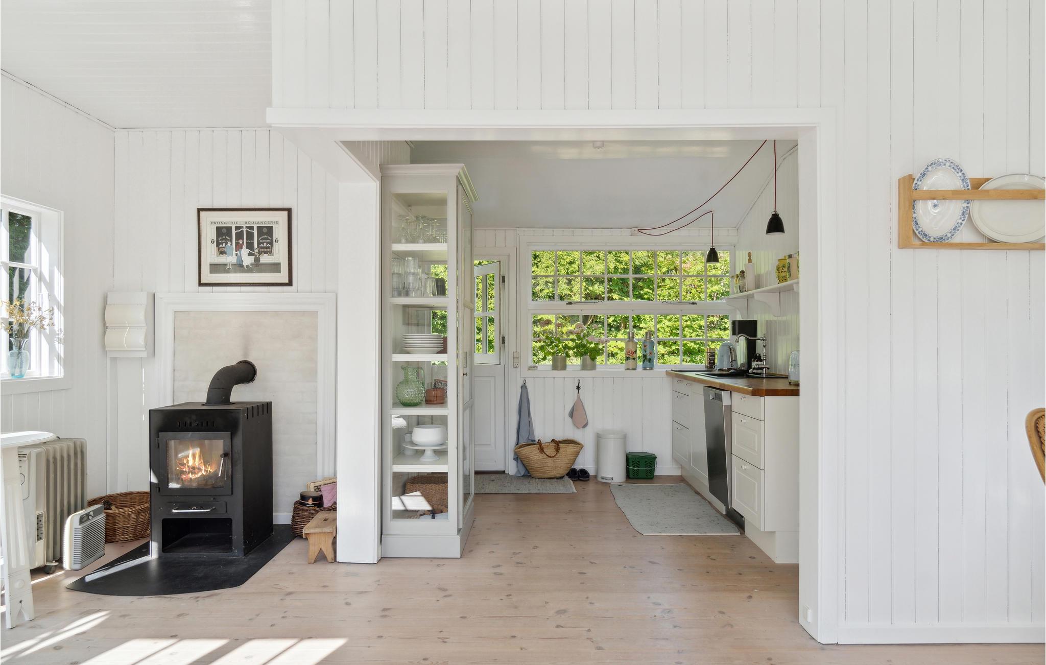 I populære Hornbæk finder I dette feriehus, som indbyder jer til en dejlig ferie i grønne omgivelser. Indenfor er huset en drøm af hvid med enkelte elementer, der bryder farven og skaber et harmonisk modspil og en stemning af velvære. De mange og store sprossevinduer lader dagslyset strømme ind. Sæt jer godt til rette ved morgenmadsbordet og nyd, at I ikke skal haste af sted på arbejde. Tilbring afslappende eftermiddage i sofaen med en god bog, mens I indimellem lader blikket vandre over de grønne omgivelser. I den kølige årstid spreder brændeovnen en hyggelig varme. Når vejret er godt, kan I finde en hyggekrog på terrassen til en kop kaffe eller et slag backgammon. Efter en kort gåtur kommer I til den dejlige sandstrand, hvor I kan springe ud i Kattegats bølger og lege i sandet med jeres børn.
