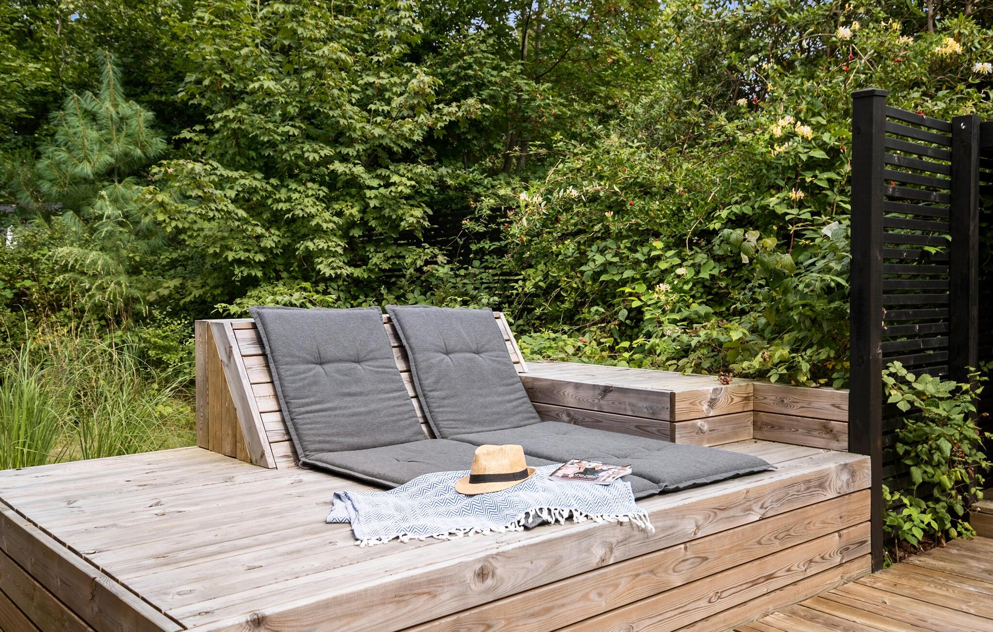 I kan også se frem til en stor indbydende terrasse, hvor udelivet kan nydes. Når dagen går på hæld, kan hele familien samles til en grillmiddag under overdækningen mellem de to huse. Grunden er anlagt som naturgrund med vilde blomster, hvor hele familien kan hygge sig med leg og boldspil. I sommersæsonen kan I skylle jer under udendørsbruseren efter en løbetur eller en dag på stranden.