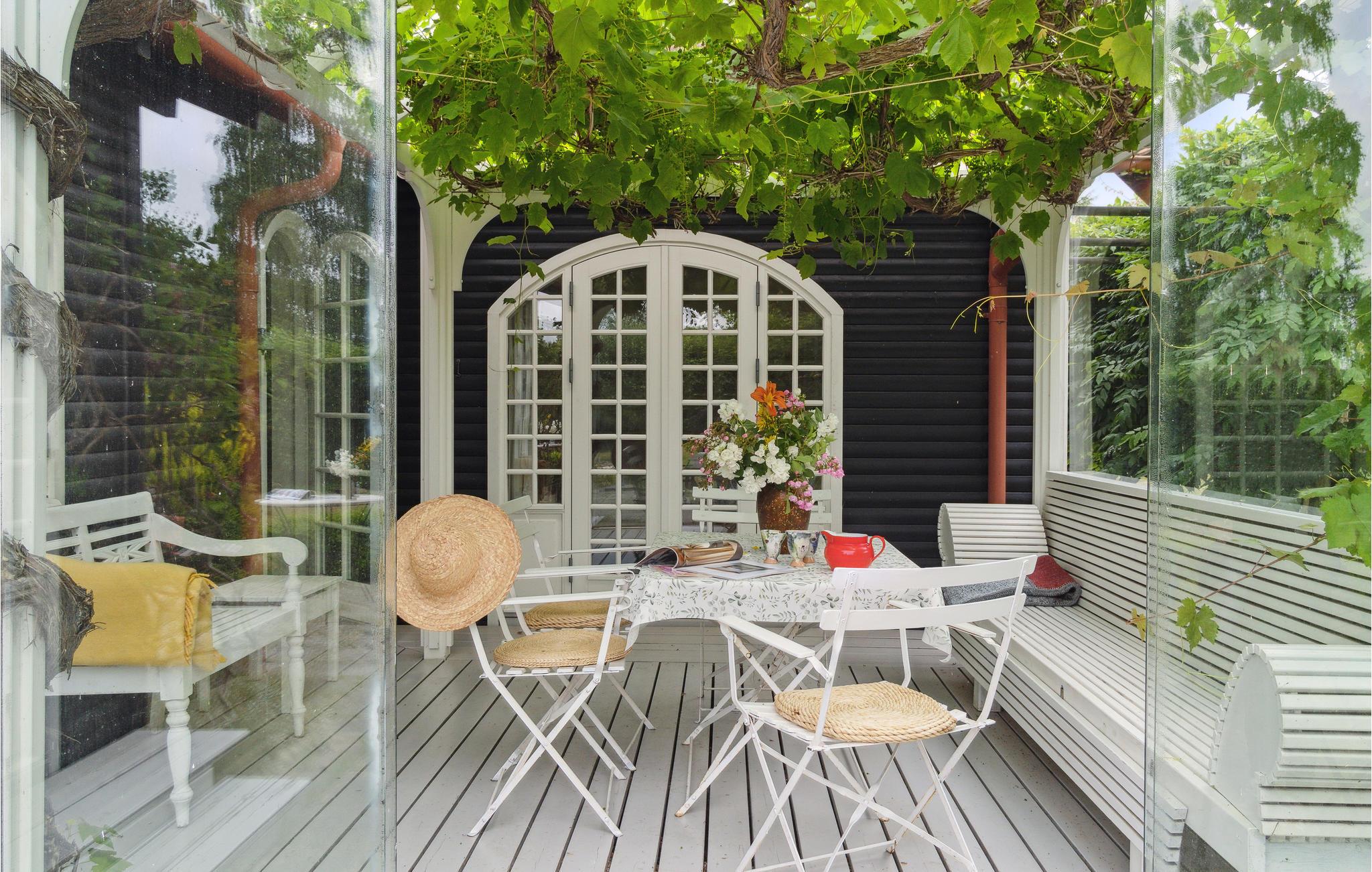 Charmerende træhus med glaspavillon nær strand