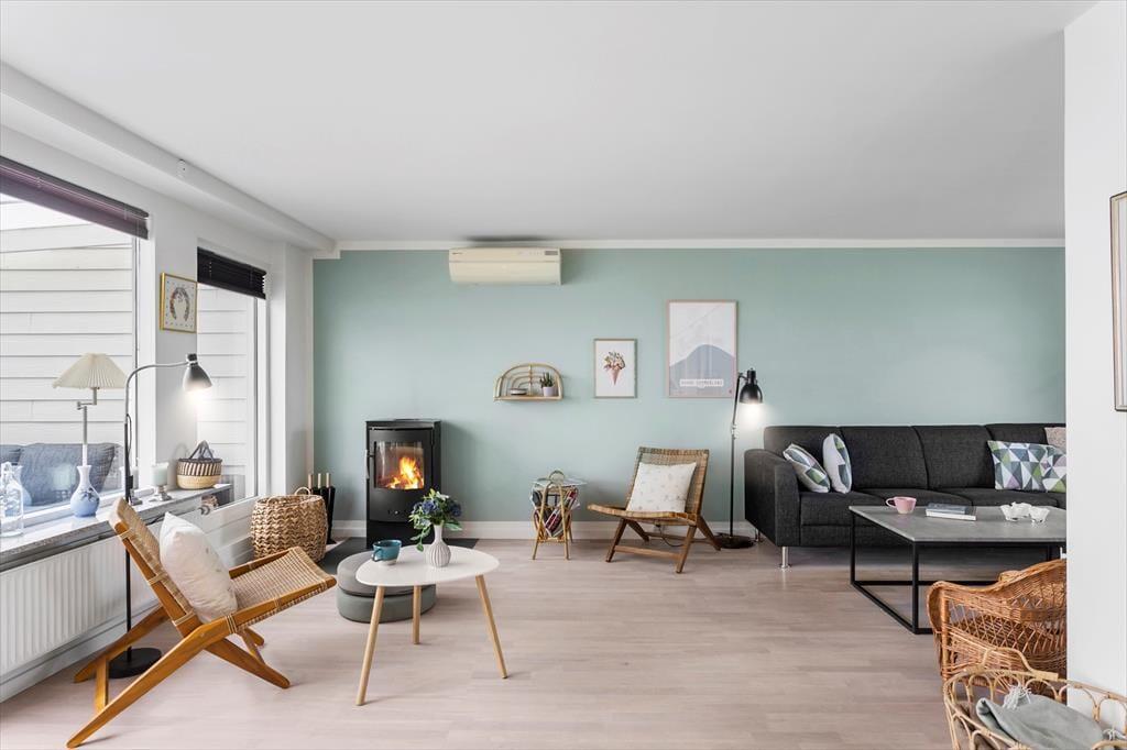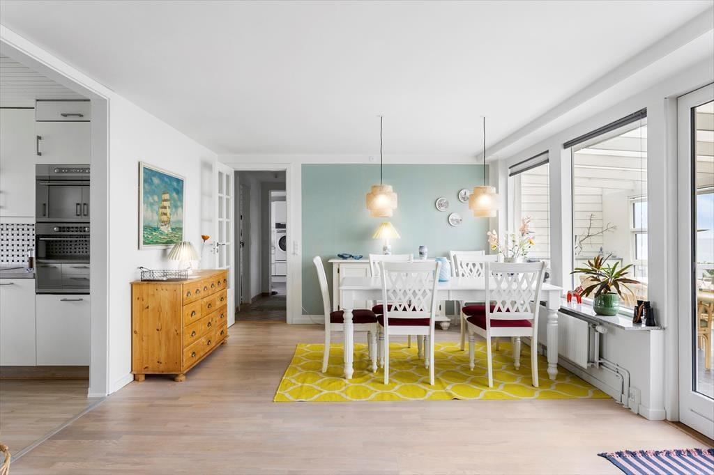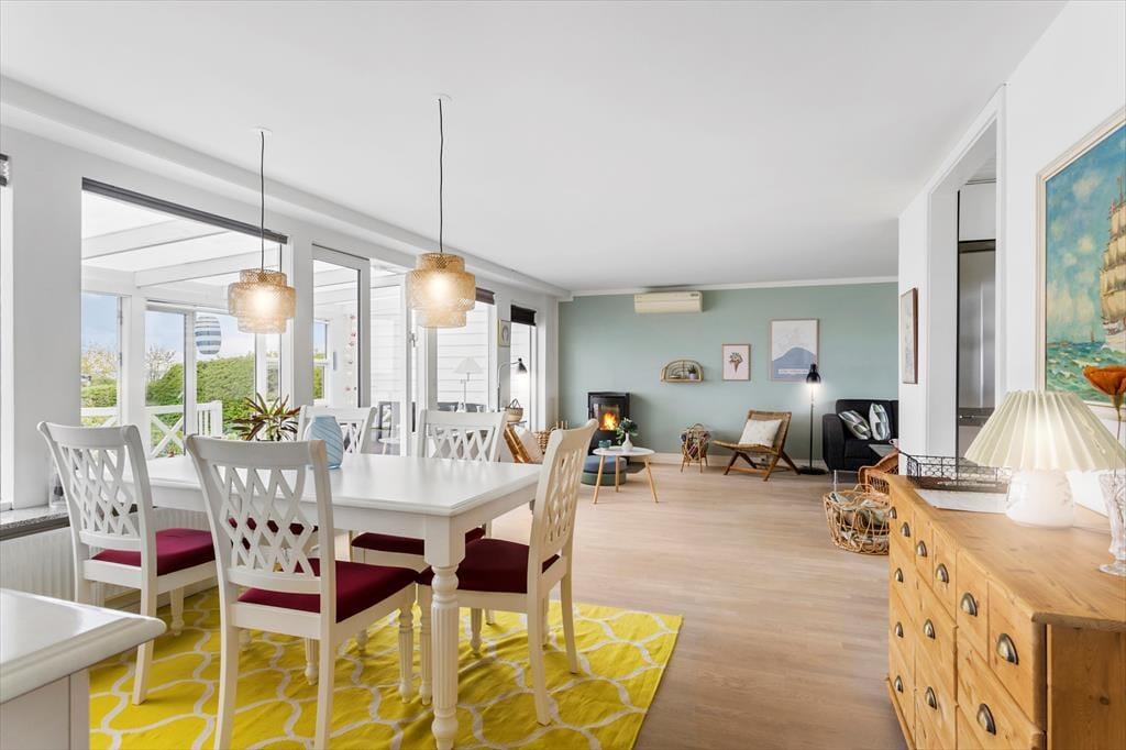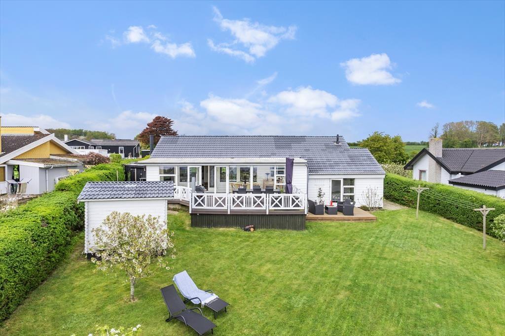 Sommerhuset lyser op på den grønne grund med sin velholdte hvide facade, og inden døre fortsætter det gode helhedsindtryk. Flotte farvetoner og kønt møblement pryder rummene, der tæller tre dejlige soveværelser, et pænt brusebadeværelse og et rummeligt bryggers. Et veludstyret køkken ligger i åben forbindelse med stuen, så selv når du er i gang med at lave mad, kan du tage del i hyggesnakken og det sociale samvær. Spisebordet er et oplagt sted at samles, og hvis du vil fordybe dig i en bog eller nyde en kop kaffe i ro og mag, er det herligt at sætte sig i en lænestol med udsyn til de dansende flammer i brændeovnen. Udestuen er også et skønt sted at være – og det skyldes blandt andet det dejlige lysindfald og den smukke udsigt over Det Sydfynske Øhav.