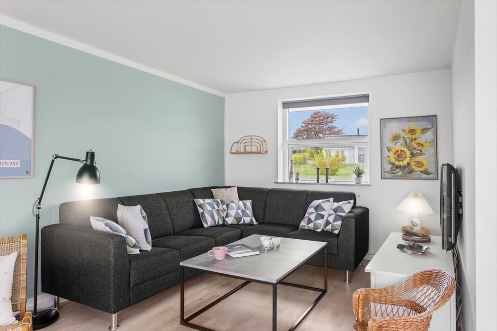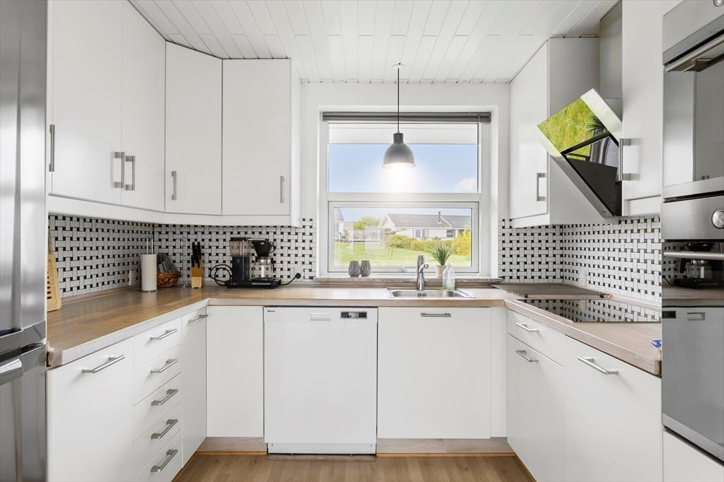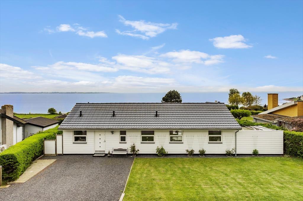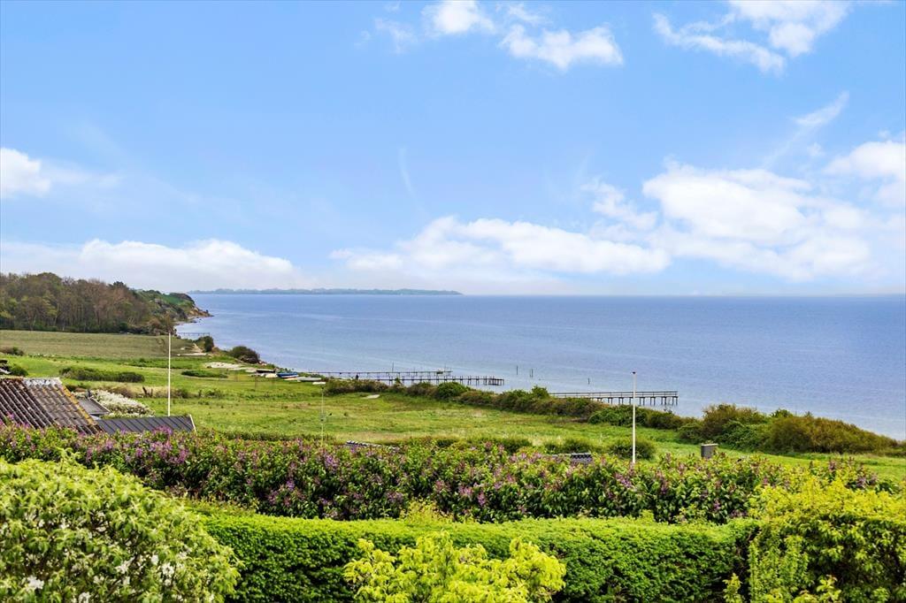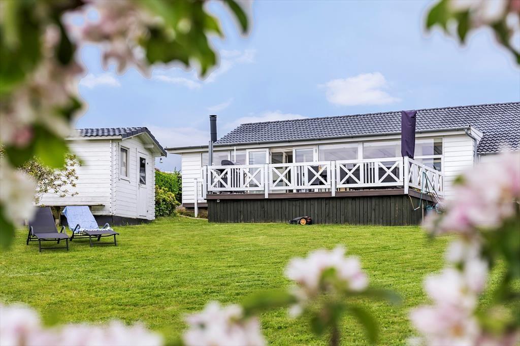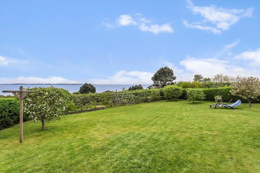 Når vejret lokker dig fra udestuen og helt ud på terrassen, har du frit udsyn over det betagende kystlandskab, og de øvrige sanser vækkes også af den lune sol og duften fra havens frodige bevoksning. En del af det sydvendte terrassemiljø er i direkte forlængelse af udestuen, mens et areal ligger et niveau lavere, og du kan selvfølgelig også sætte dig i en solstol direkte på græsplænen, hvis du trænger til at flytte dig lidt rundt. Den lukkede og let skrånende baghave indbyder til leg og afslapning for både børn og voksne, og hvis du og familien har brug for mere plads at boltre jer på, kan I hurtigt være nede ved Horne Sommerlands hyggelige strand.