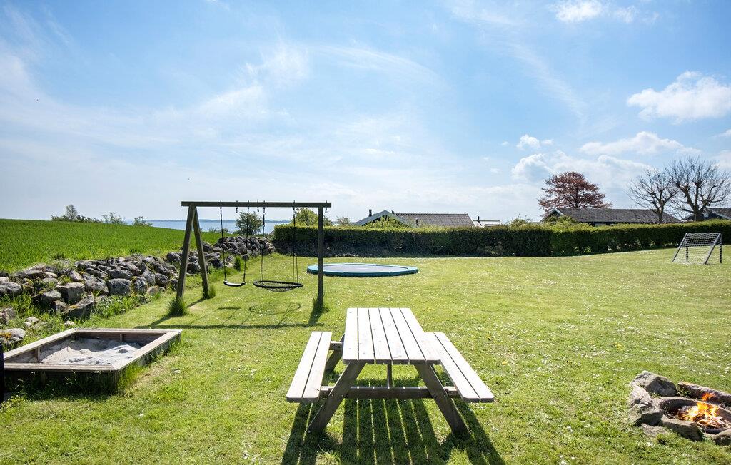 Moderne feriehus i Faaborg med havudsigt, sauna, trampolin og store udendørs faciliteter til hele familien.