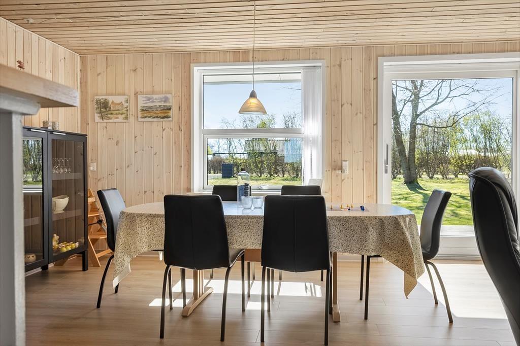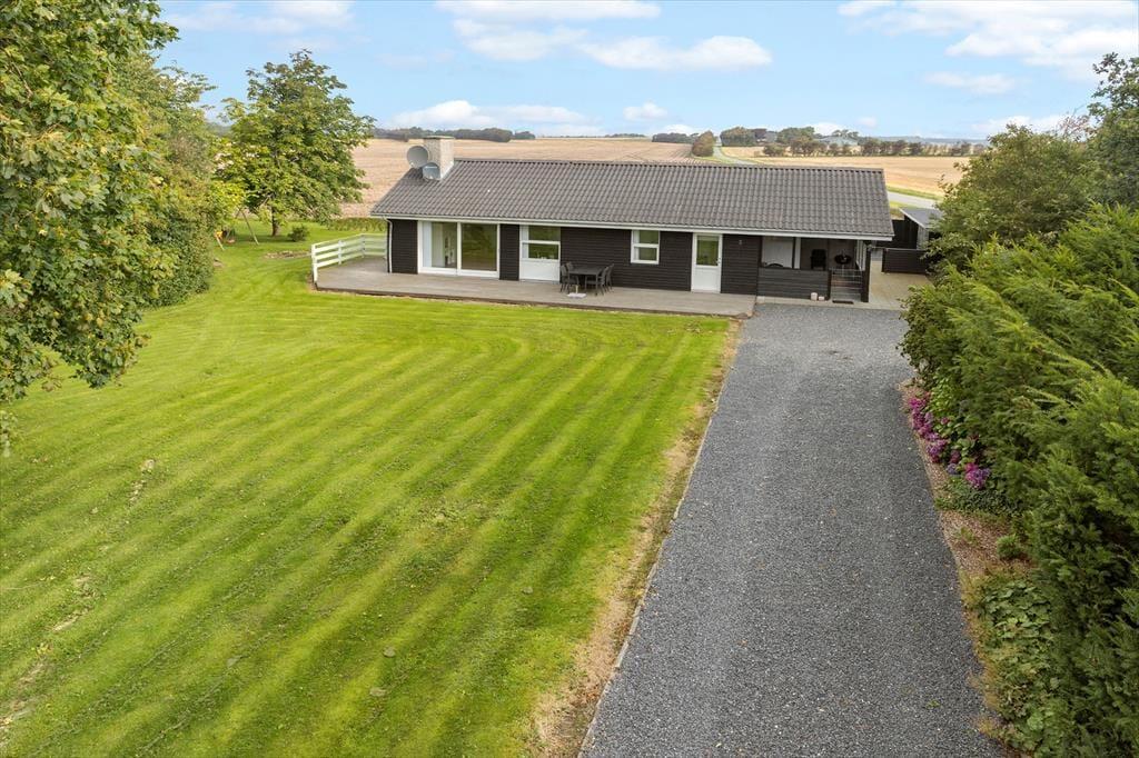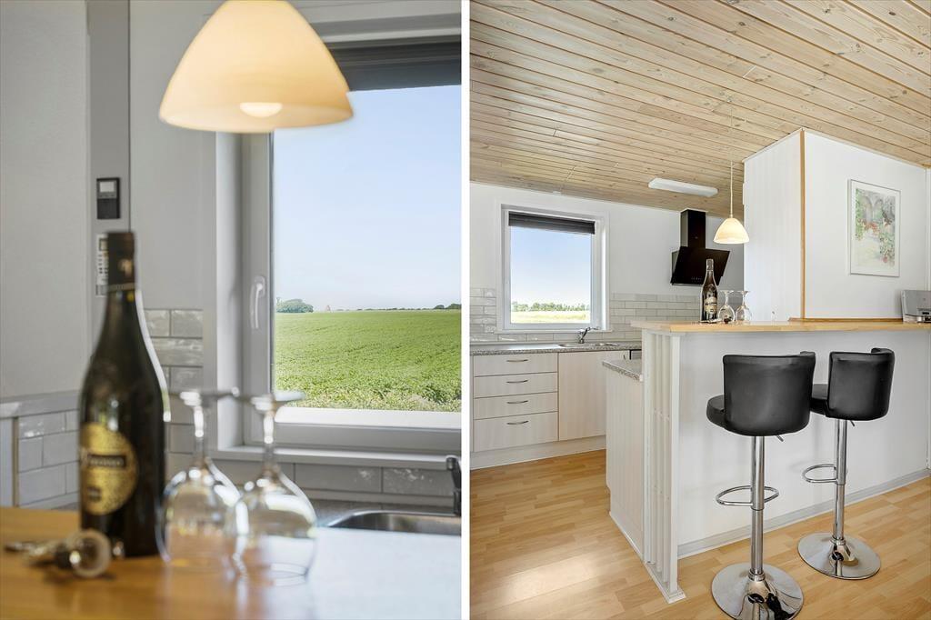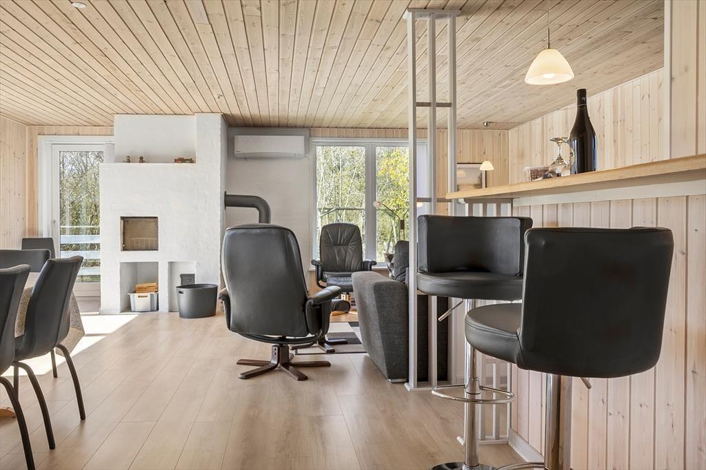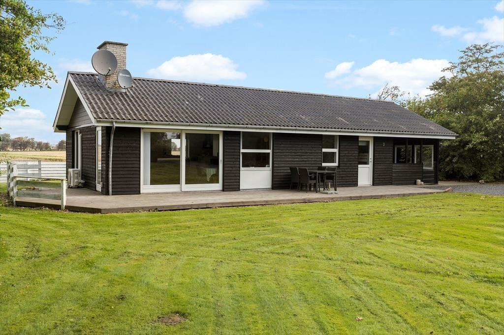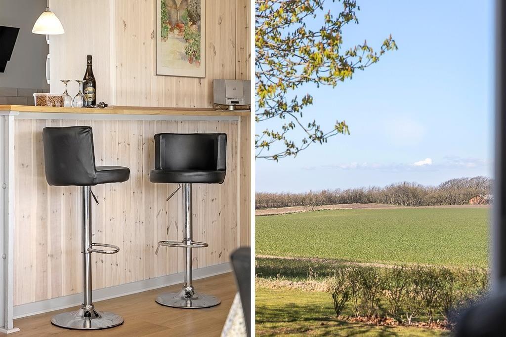 Inden døre i det 93 m2 store sommerhus kan du slappe af i rare omgivelser, for alle rum præsenterer sig på pæn og indbydende vis efter den seneste modernisering. Et brusebadeværelse og tre gode soveværelser ligger i samme afdeling, mens et veludstyret tosidet køkken er integreret med stuen. Barstolene ved disken ind mod køkkenet er et hyggeligt sted at sidde, hvis du vil holde madholdet med selskab, mens du nipper til en kølig forfriskning og kigger på det åbne marklandskab, der breder sig udenfor vinduet. Der er både brændeovn og pejs i rummet, hvis du får lyst til at sprede ekstra varme og hyggestemning i huset, og sofahjørnet er et skønt sted at slænge sig både sommer og vinter.