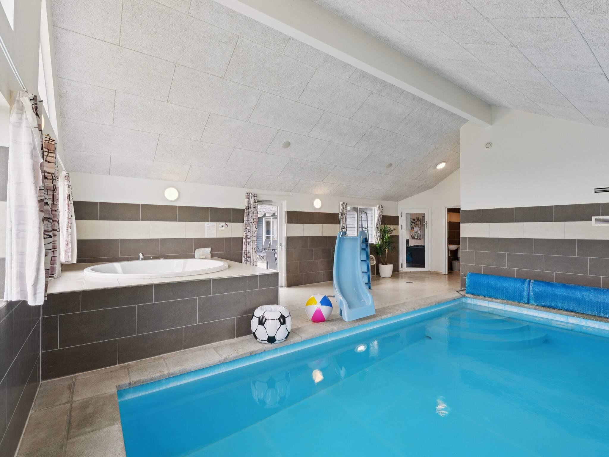 Swimmingpoolen er på 20 m² og med skøn rutschebane til børnene, som de kun kan blive begejstrerede for. Her kan I hele ugen forbedre konditionen med mange daglige svømmetag kombineret med ren afslapning i spabadet og saunaen, som befinder sig ved poolrummet, som har loft til kip. Poolområdet og aktivitetsrummet er et godt samlingspunkt for hele familien.