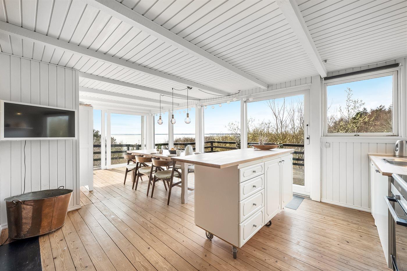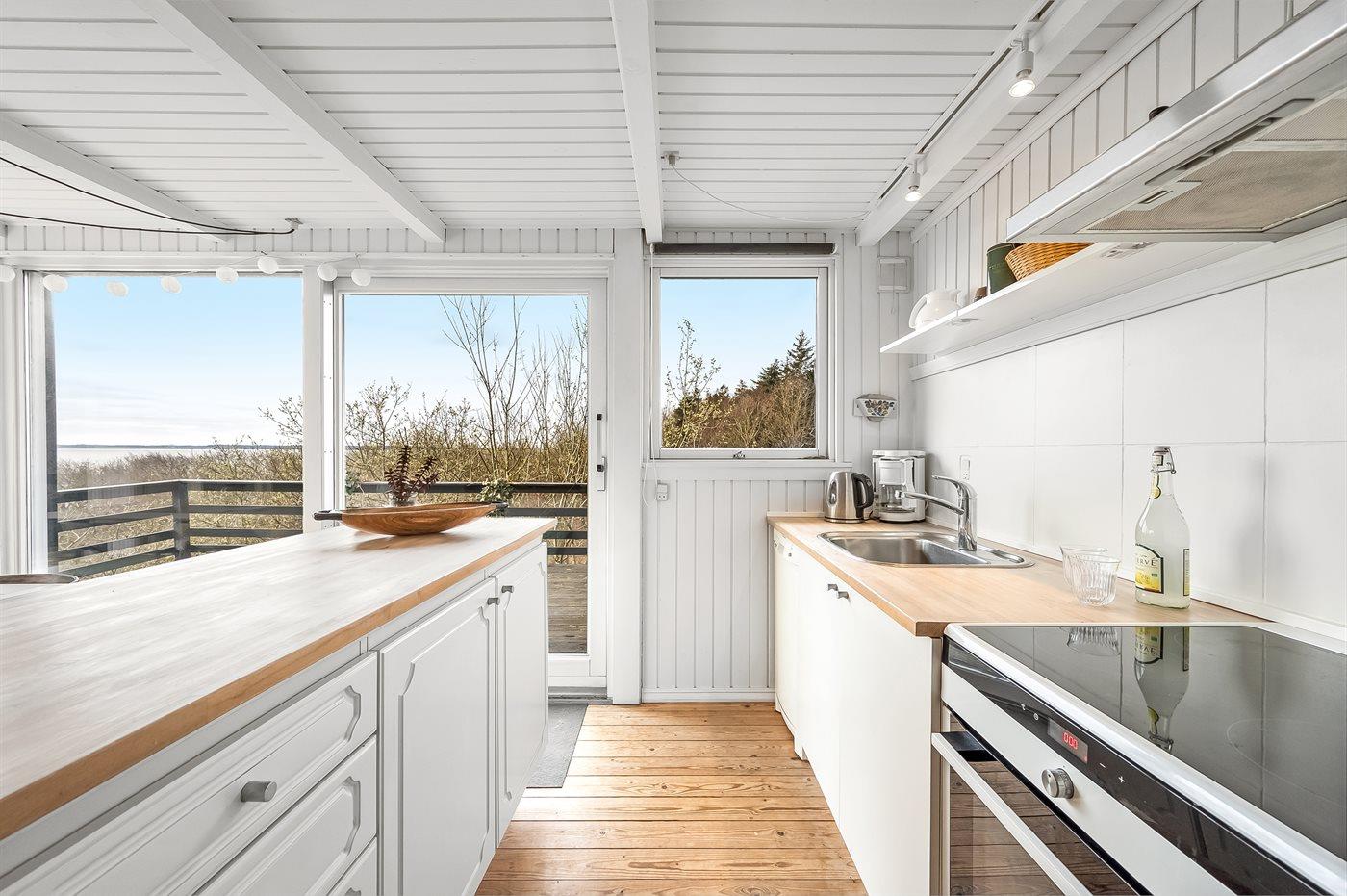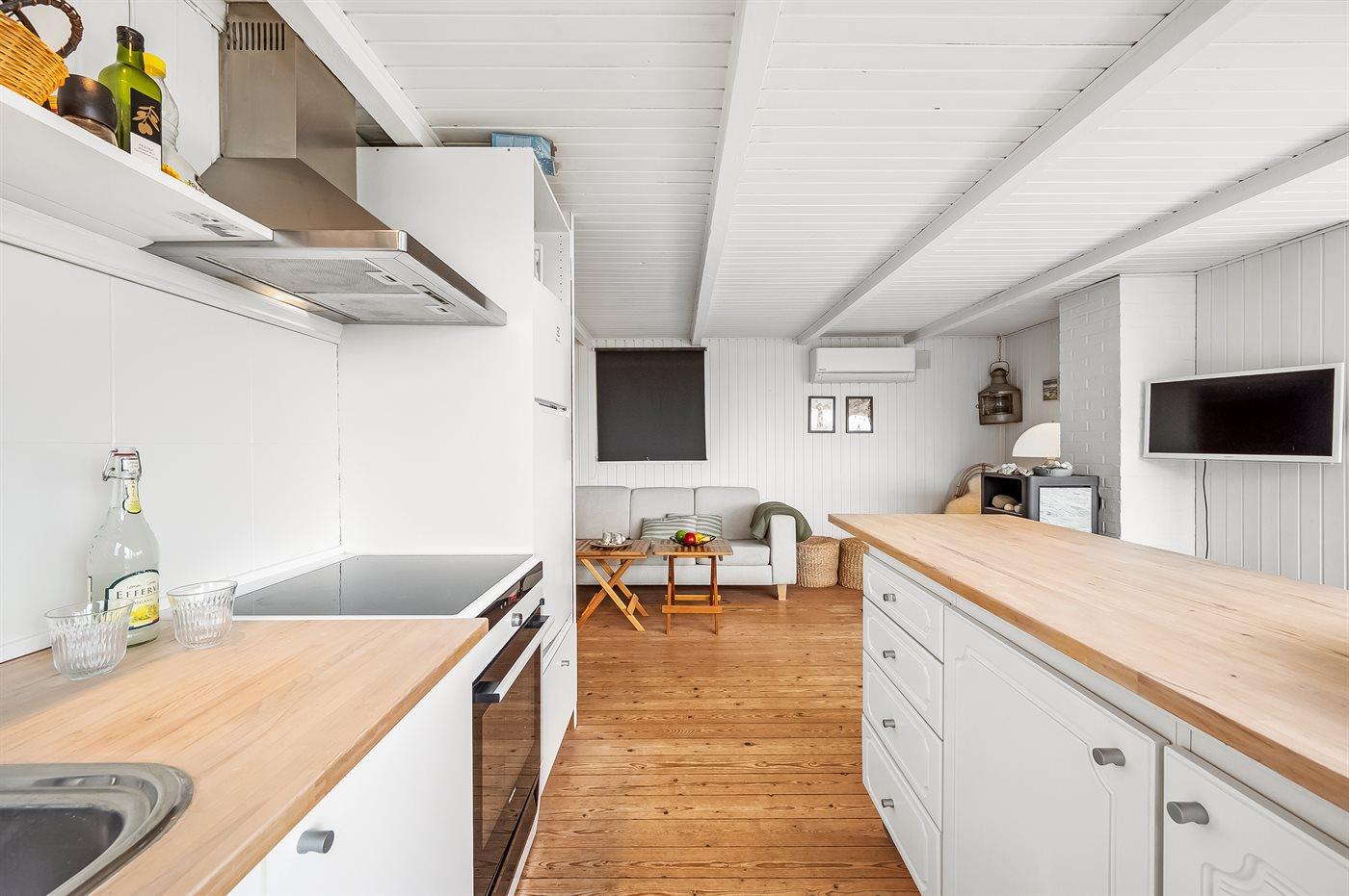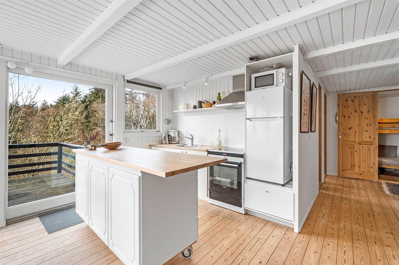 Køkkenet er udstyret med 1 køleskab. Der er 4 keramiske kogeplader, varmluftovn, mikrobølgeovn samt opvaskemaskine.