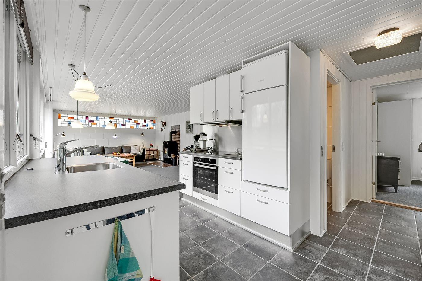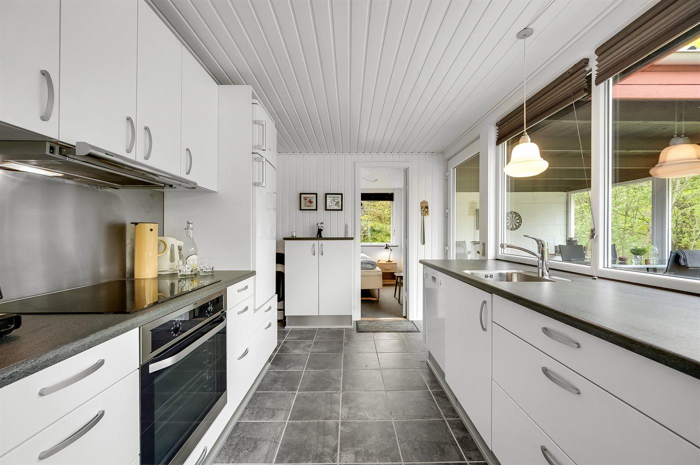 Køkkenet er udstyret med 1 køleskab. Der er 4 induktionskogeplader, varmluftovn samt opvaskemaskine.