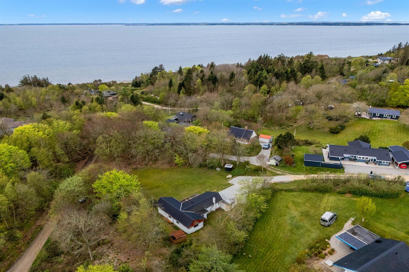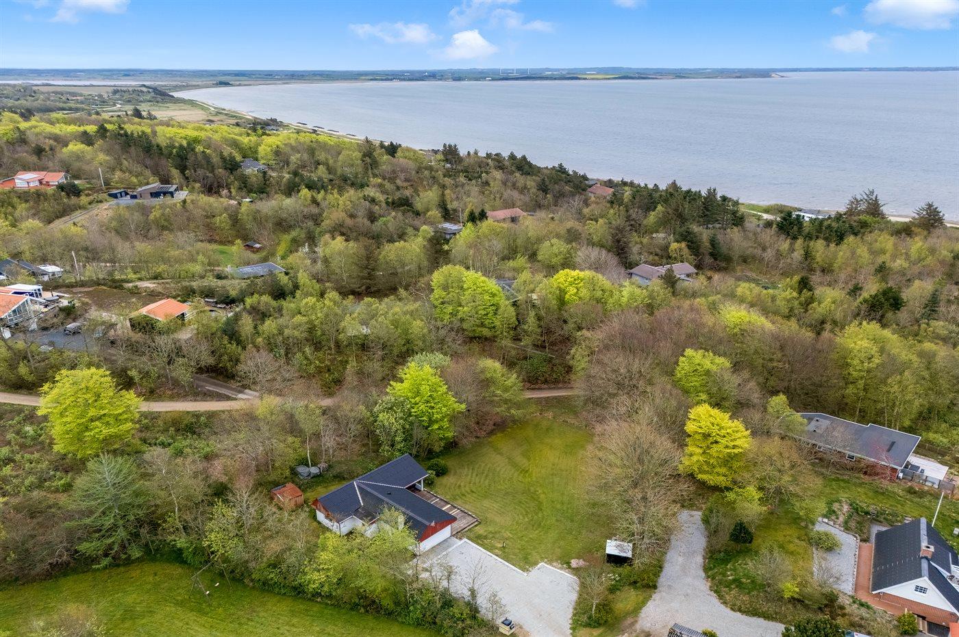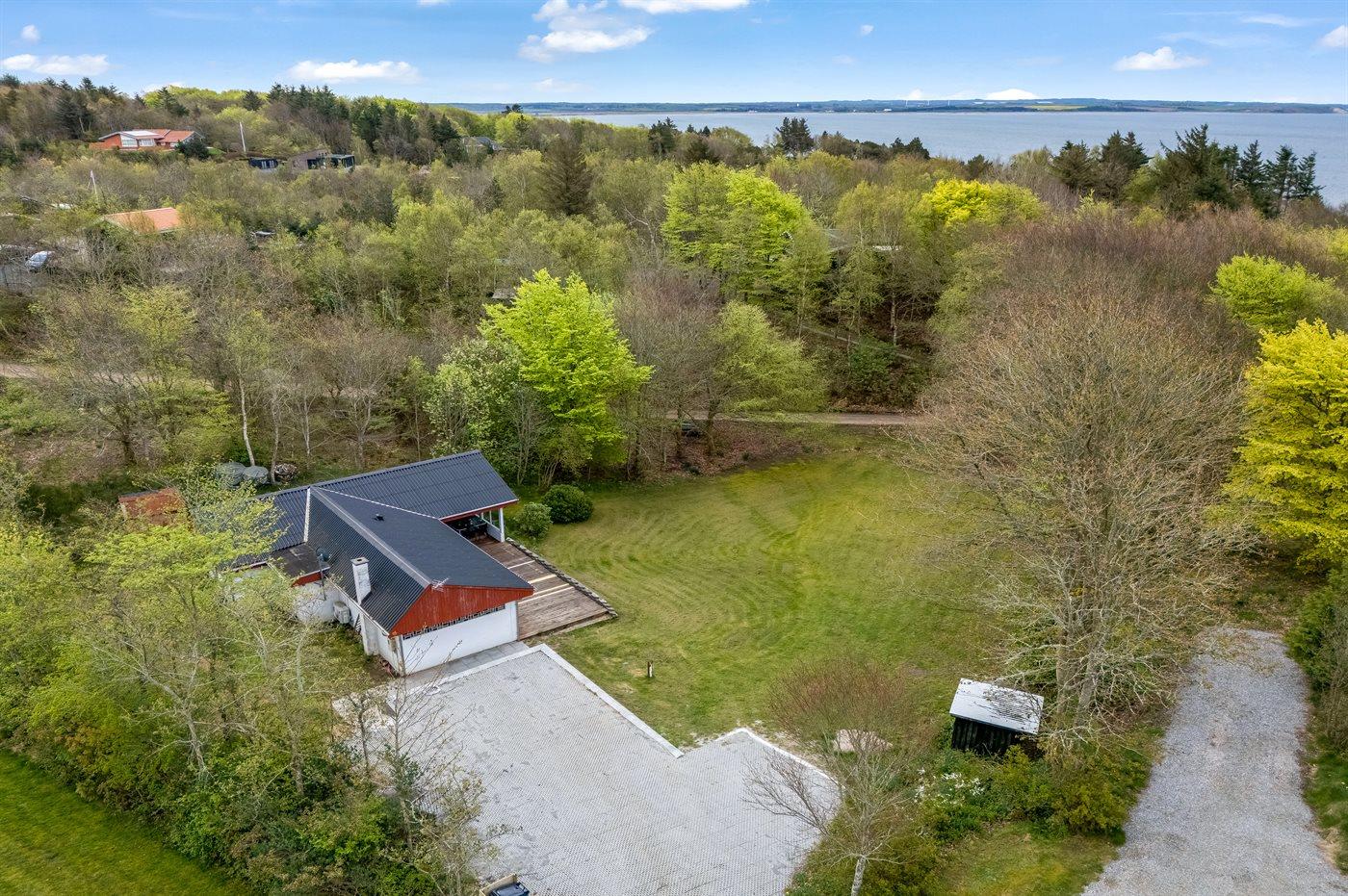 Ferieboligen er beliggende på en 1485 m² stor grund i skov/plantage. Der er 300 m til fjorden. Nærmeste forretning er beliggende i en afstand af 3000 m. Til ferieboligen hører åbent terrasseareal. Desuden er der overdækket terrasse. Parkering ved ferieboligen.