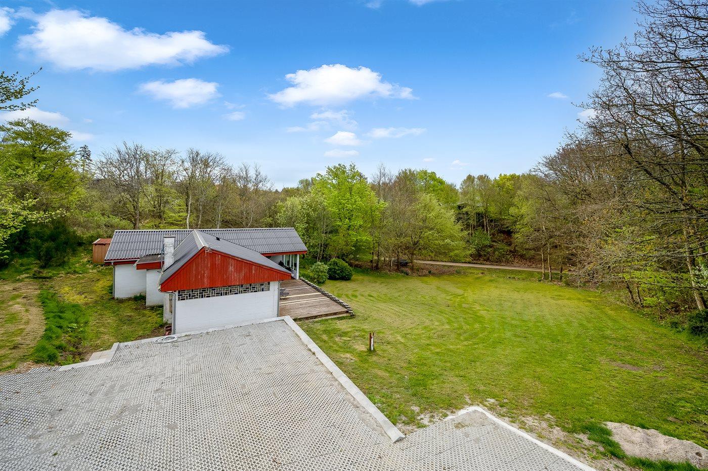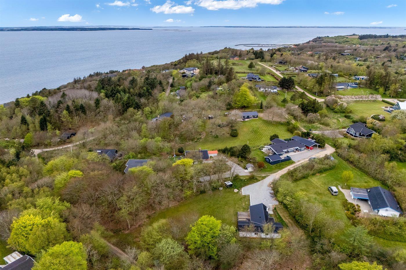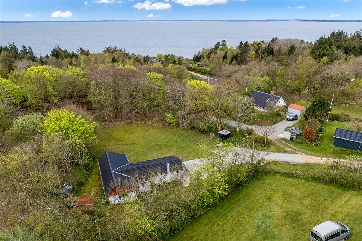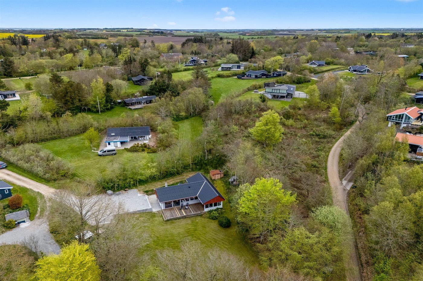 Ferieboligen er beliggende på en 1485 m² stor grund i skov/plantage. Der er 300 m til fjorden. Nærmeste forretning er beliggende i en afstand af 3000 m. Til ferieboligen hører åbent terrasseareal. Desuden er der overdækket terrasse. Parkering ved ferieboligen.