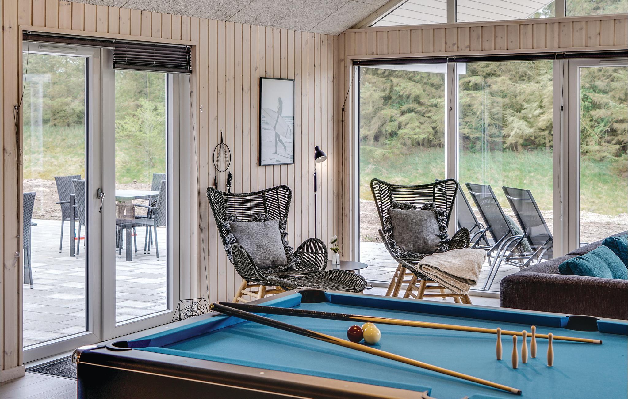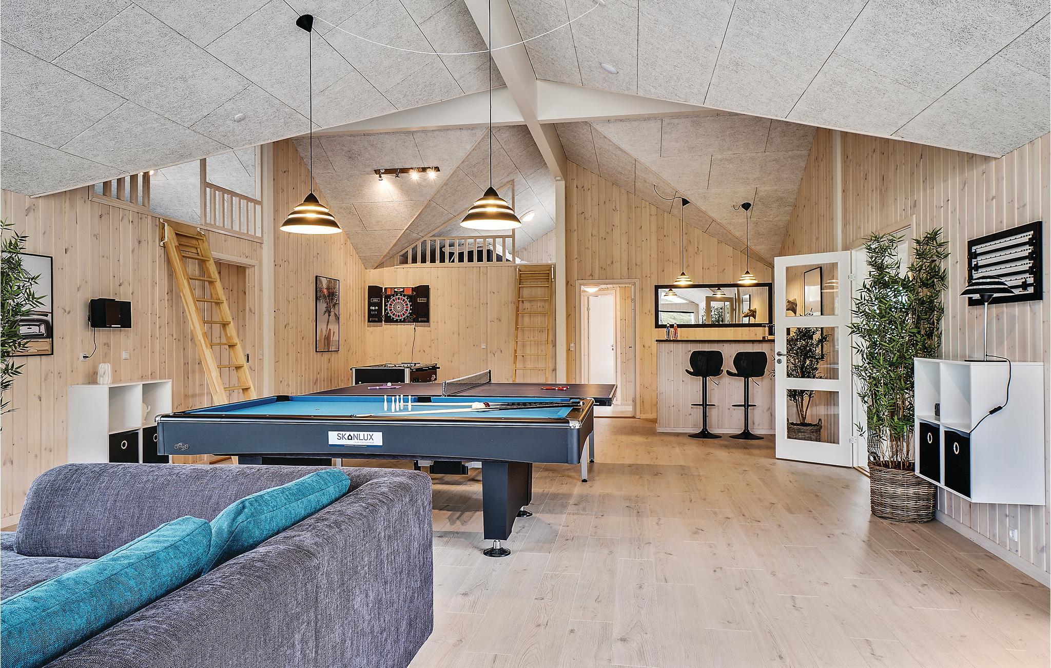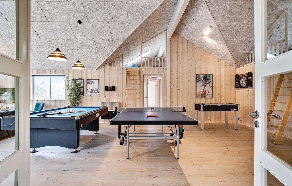 Uanset vejr og årstid har I mulighed for en aktivitetsfyldt ferie. Her har I nemlig et stort aktivitetsrum, der er udstyret med billardbord, Playstation 4, bordtennis, dart og bordfodbold. Giv den gas med spillene og nyd en kold forfriskning i husets helt egen bar med køleskab, som også befinder sig i aktivitetsrummet.